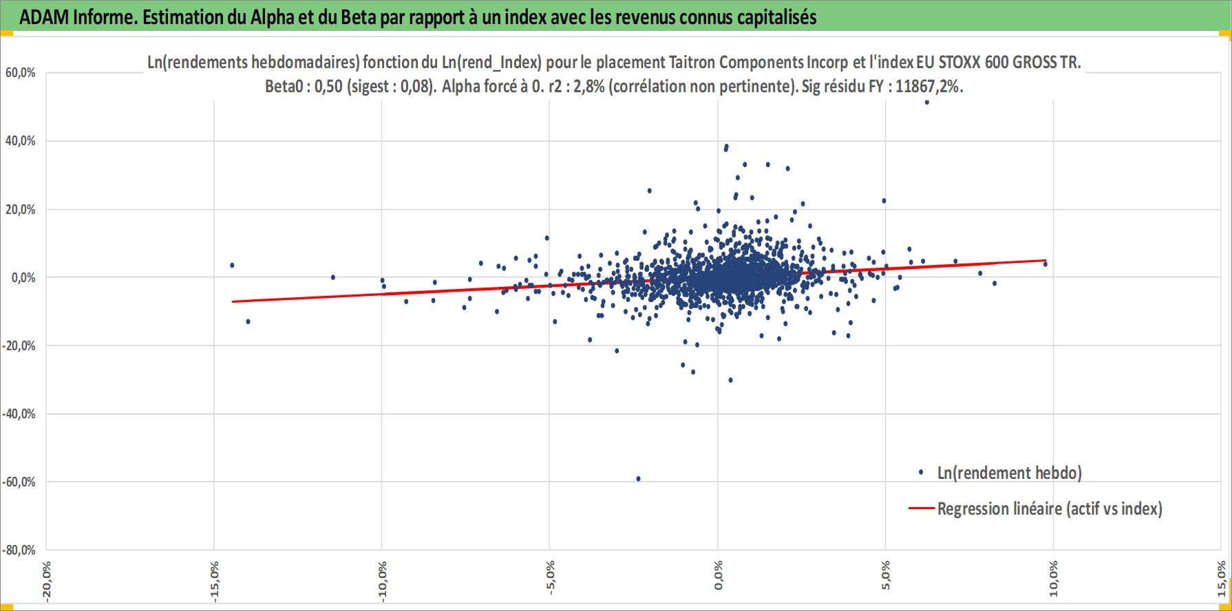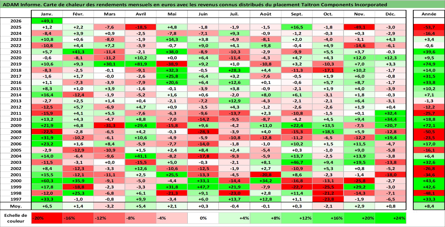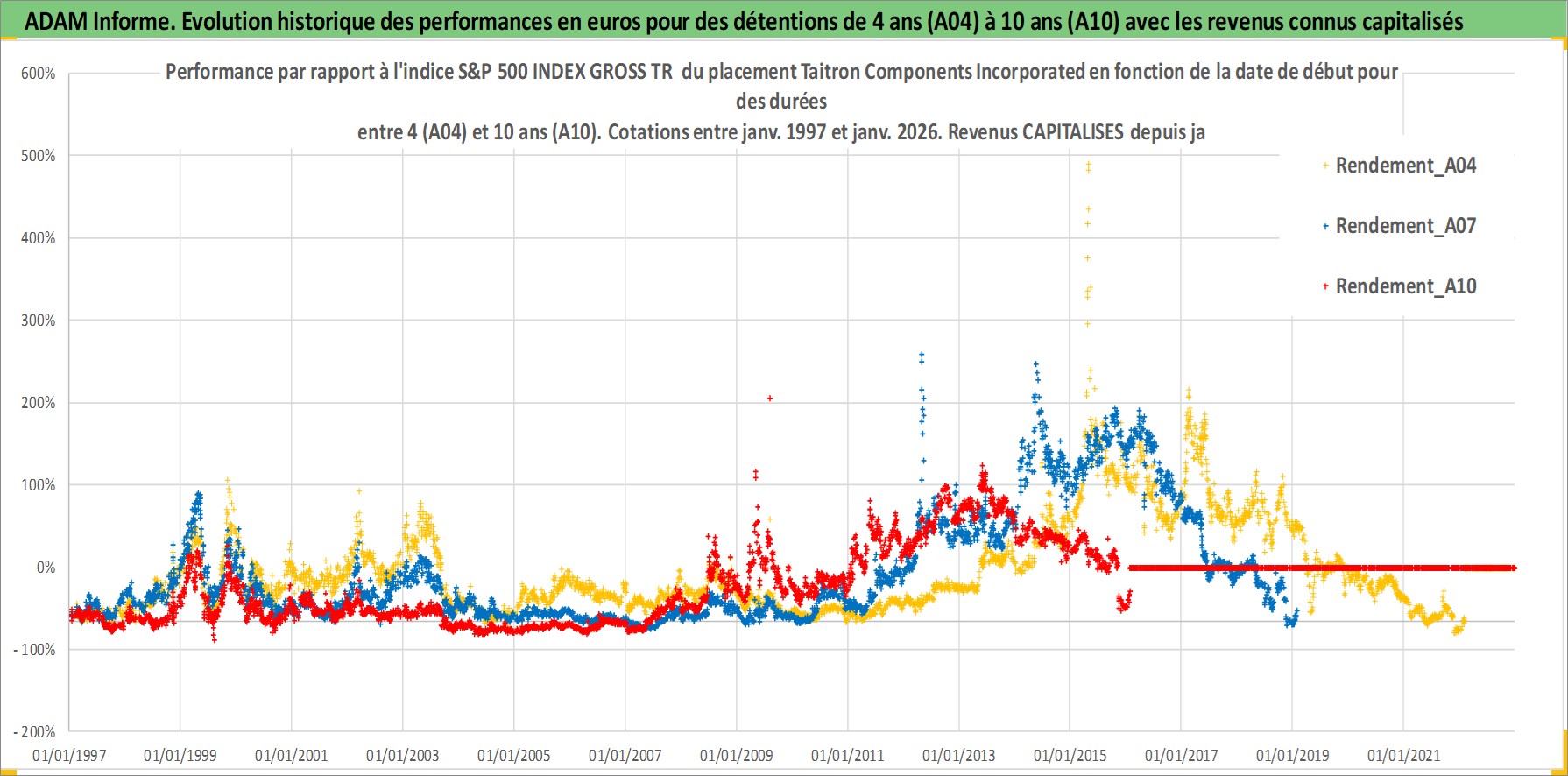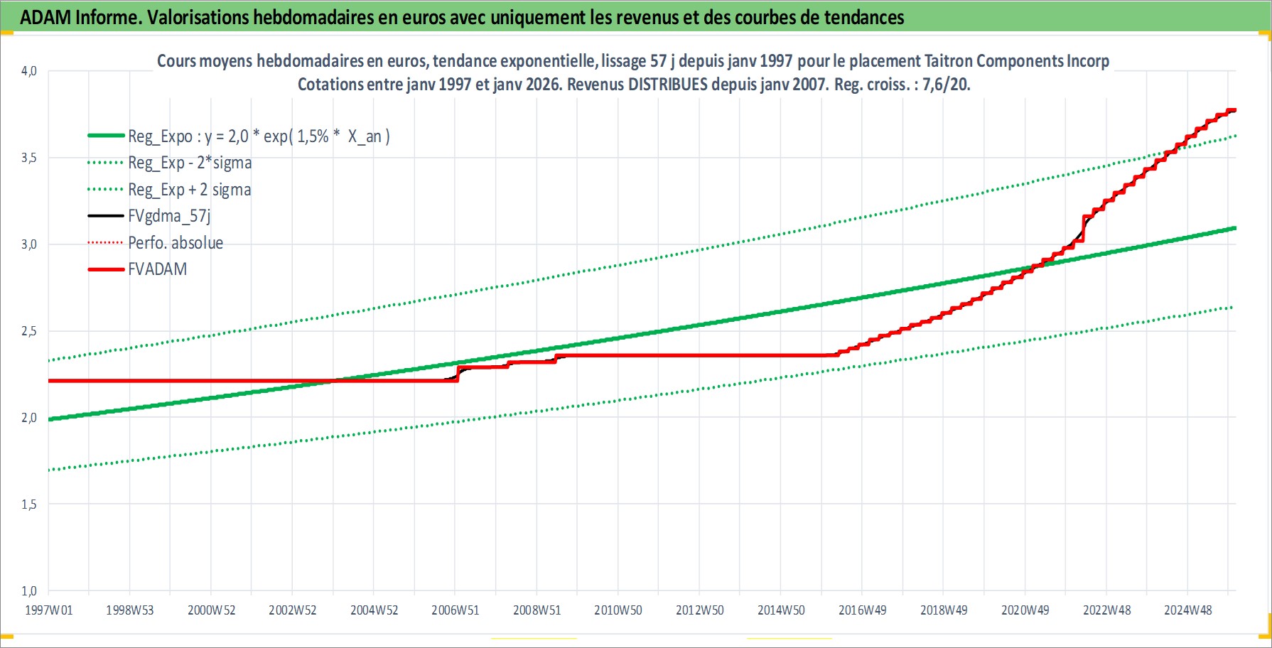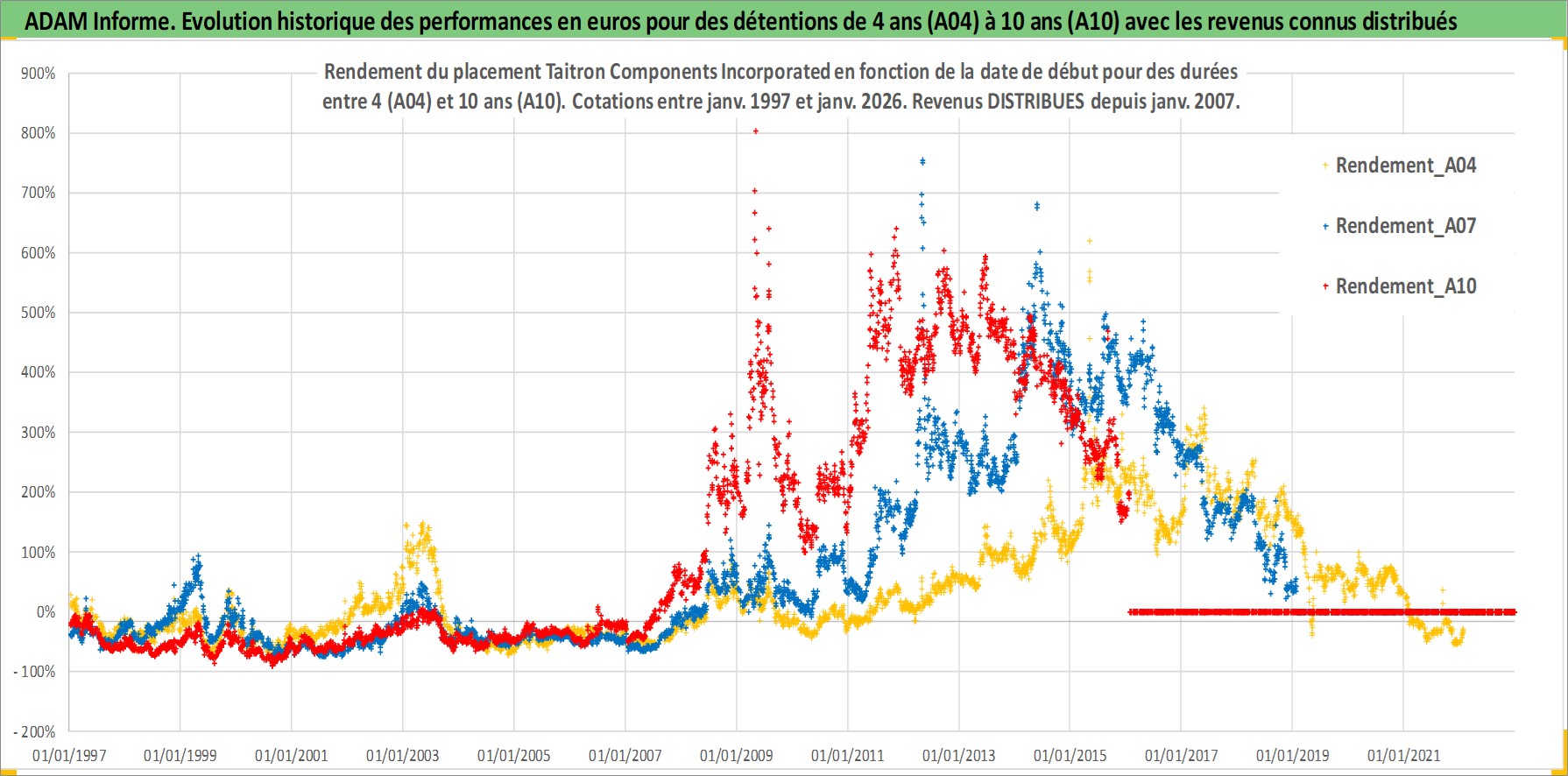 Site dédié aux investisseursPage dédiée sur site financeAnalyse des valorisations hebdomadaires de l'action Taitron Components Incorporated. Cet actif est cote en USD. Les valorisations sont en contrevaleur EURO et couvrent les semaines 1997W01 a 2026W05. Les revenus de cet actif financier sont pris en compte depuis la semaine 2007W03. La note ESG de cet actif n'est pas connue.