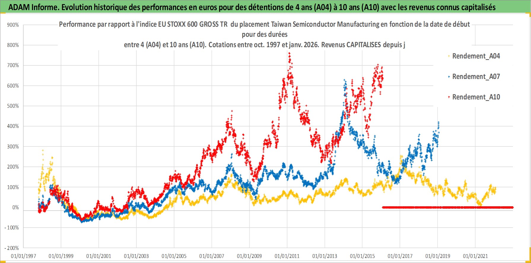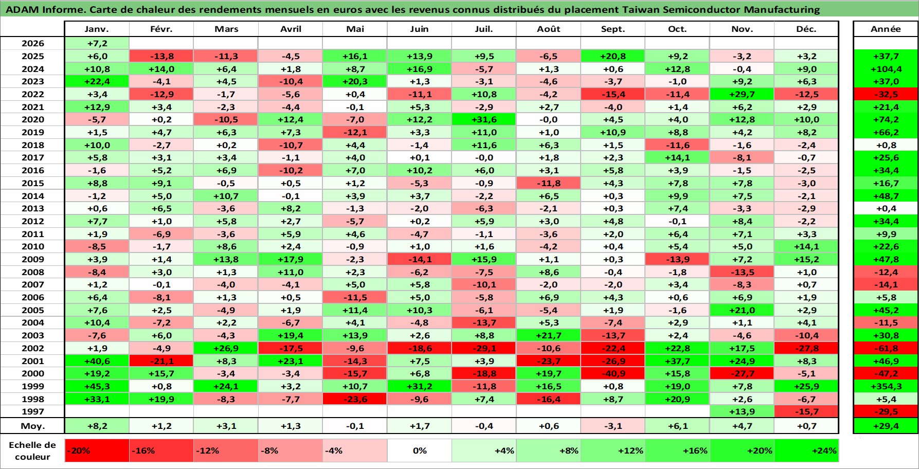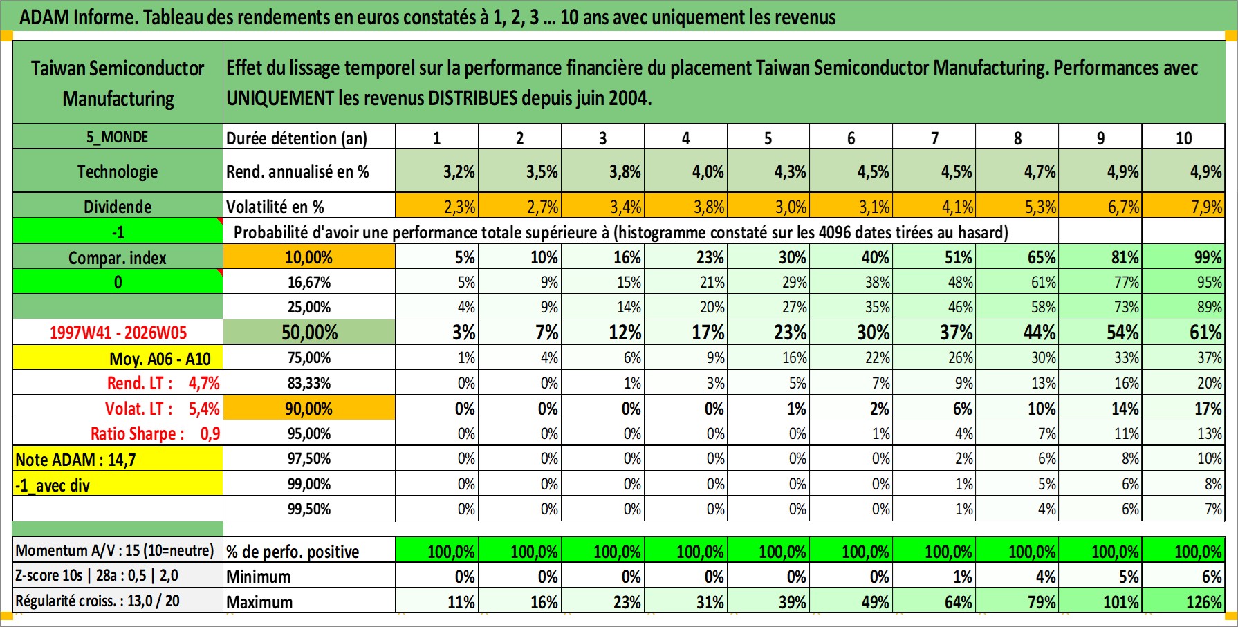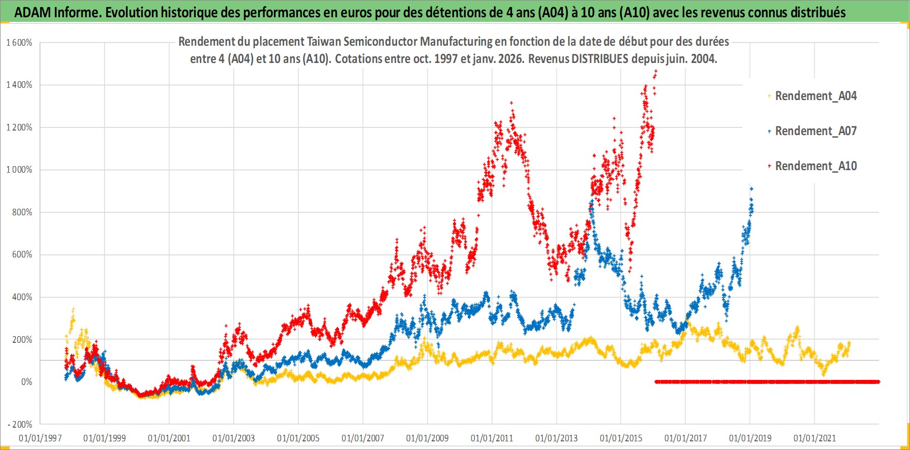 Site dédié aux investisseursPage dédiée sur site financeAnalyse des valorisations hebdomadaires de l'action Taiwan Semiconductor Manufacturing. Cet actif est cote en USD. Les valorisations sont en contrevaleur EURO et couvrent les semaines 1997W41 a 2026W05. Les revenus de cet actif financier sont pris en compte depuis la semaine 2004W25. La note ESG de cet actif n'est pas connue.