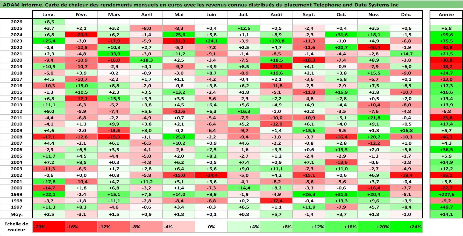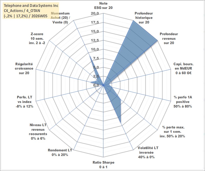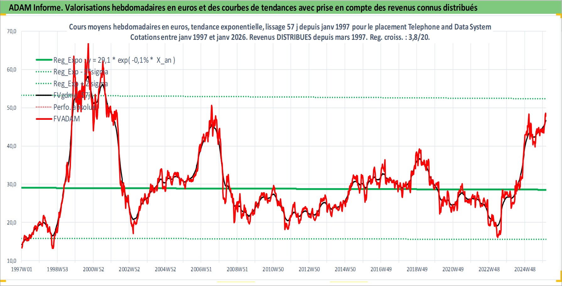 Site dédié aux investisseursPage dédiée sur site financeAnalyse des valorisations hebdomadaires de l'action Telephone and Data Systems Inc. Cet actif est cote en USD. Les valorisations sont en contrevaleur EURO et couvrent les semaines 1997W01 a 2026W05. Les revenus de cet actif financier sont pris en compte depuis la semaine 1997W11. La note ESG de cet actif n'est pas connue.