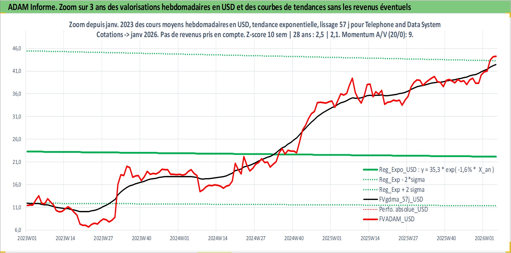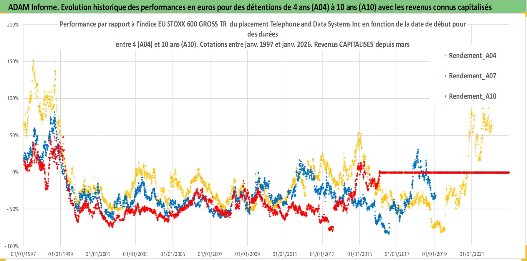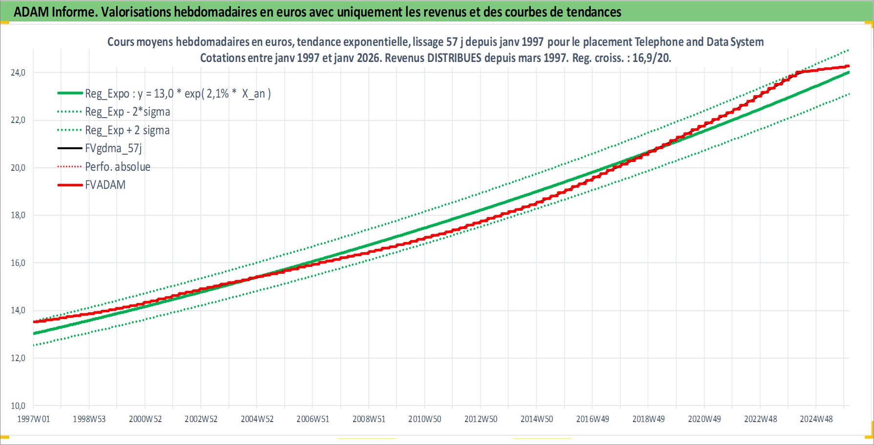 Site dédié aux investisseursPage dédiée sur site financeAnalyse des valorisations hebdomadaires de l'action Telephone and Data Systems Inc. Cet actif est cote en USD. Les valorisations sont en contrevaleur EURO et couvrent les semaines 1997W01 a 2026W05. Les revenus de cet actif financier sont pris en compte depuis la semaine 1997W11. La note ESG de cet actif n'est pas connue.