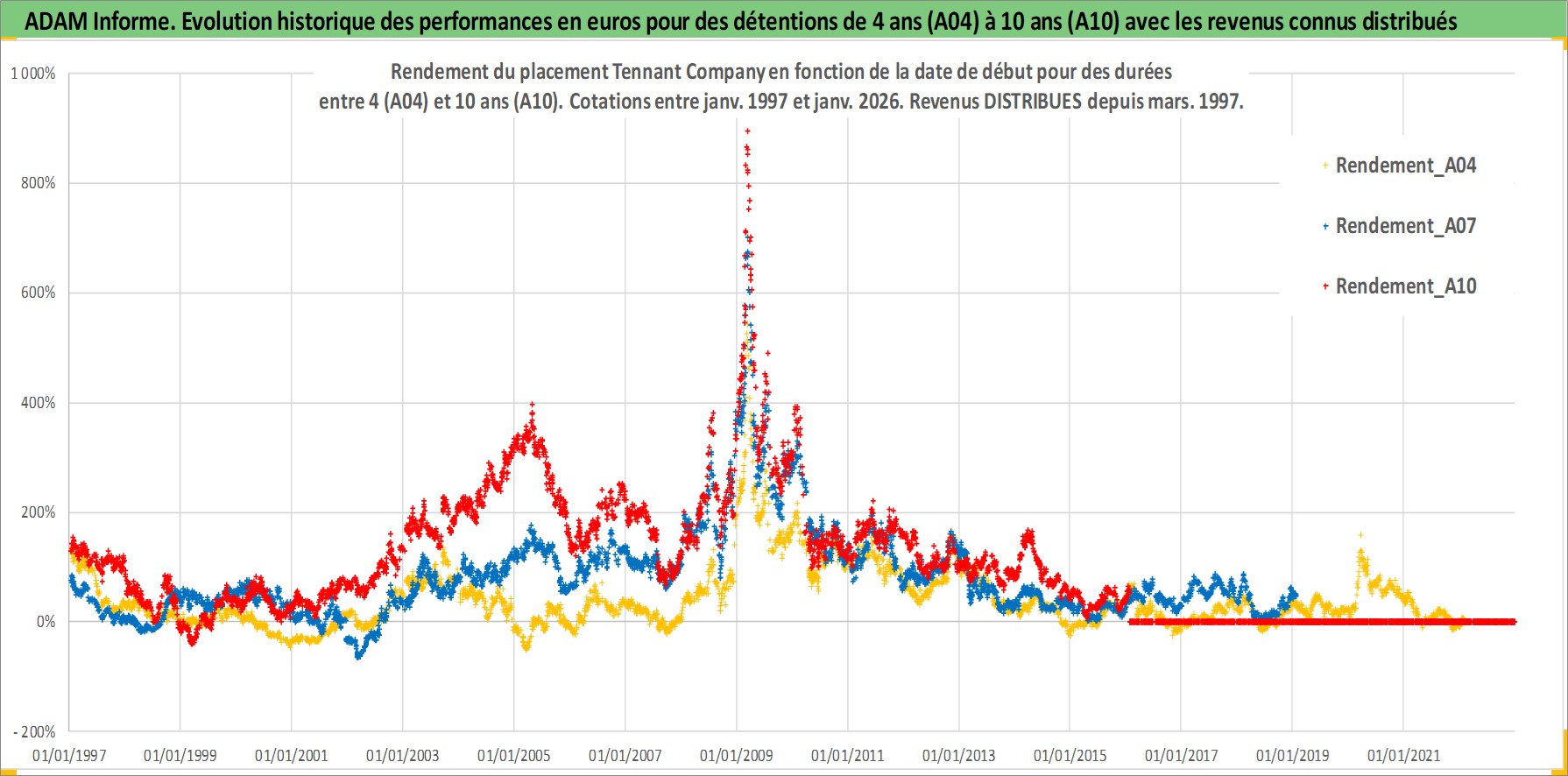Site dédié aux investisseursPage dédiée sur site financeAnalyse des valorisations hebdomadaires de l'action Tennant Company. Cet actif est cote en USD. Les valorisations sont en contrevaleur EURO et couvrent les semaines 1997W01 a 2026W05. Les revenus de cet actif financier sont pris en compte depuis la semaine 1997W10. La note ESG de cet actif n'est pas connue.