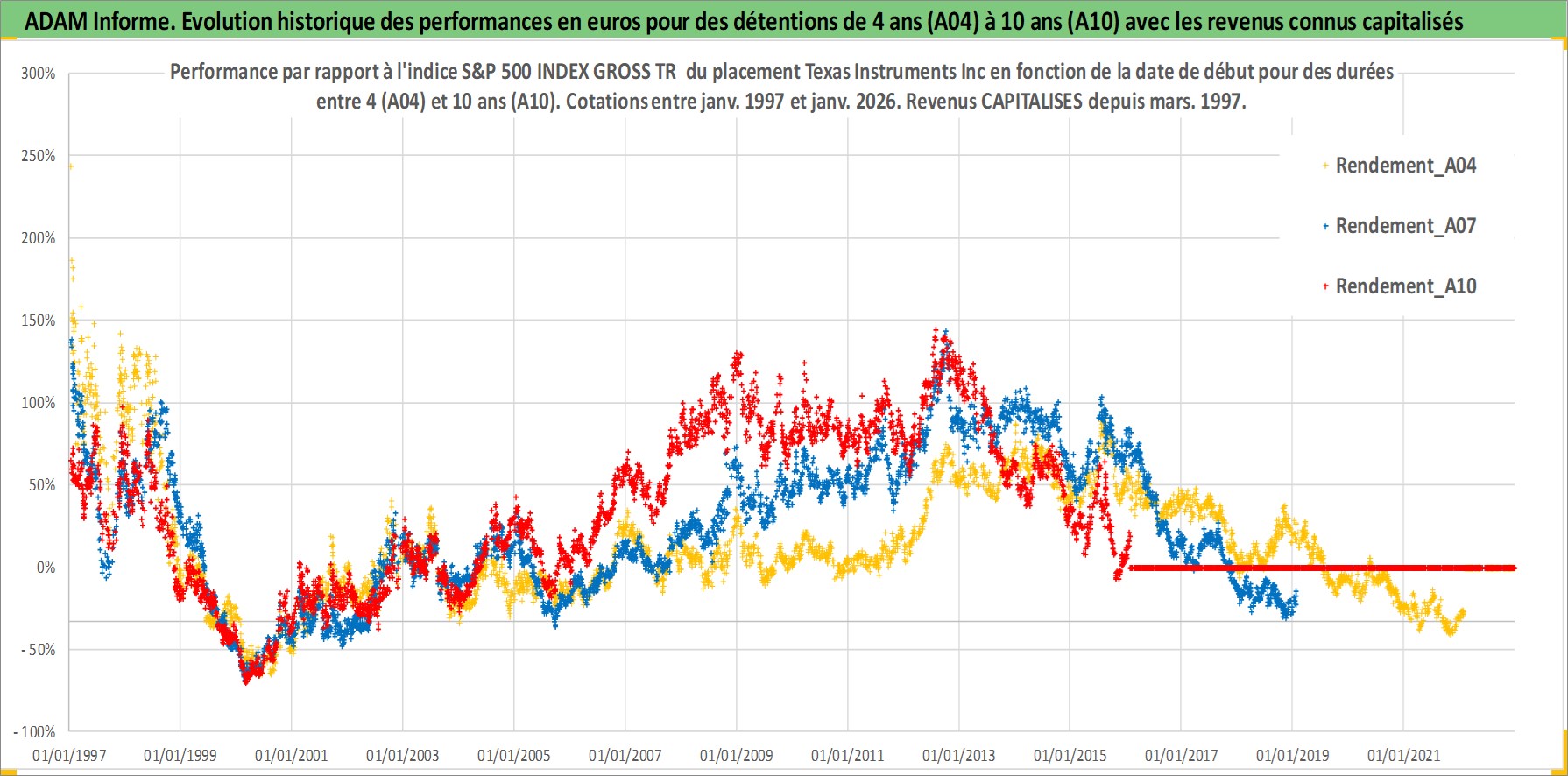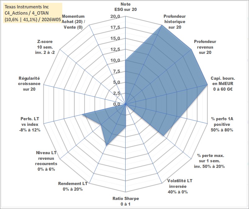 Site dédié aux investisseursPage dédiée sur site financeAnalyse des valorisations hebdomadaires de l'action Texas Instruments Inc. Cet actif est cote en USD. Les valorisations sont en contrevaleur EURO et couvrent les semaines 1997W01 a 2026W05. Les revenus de cet actif financier sont pris en compte depuis la semaine 1997W13. La note globale ESG de cet actif est estimee a 10.0 (apres rebasage entre 0 et 20).