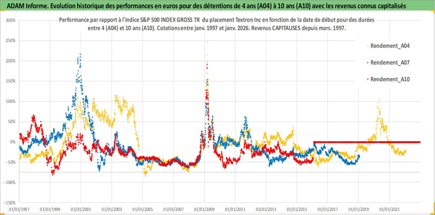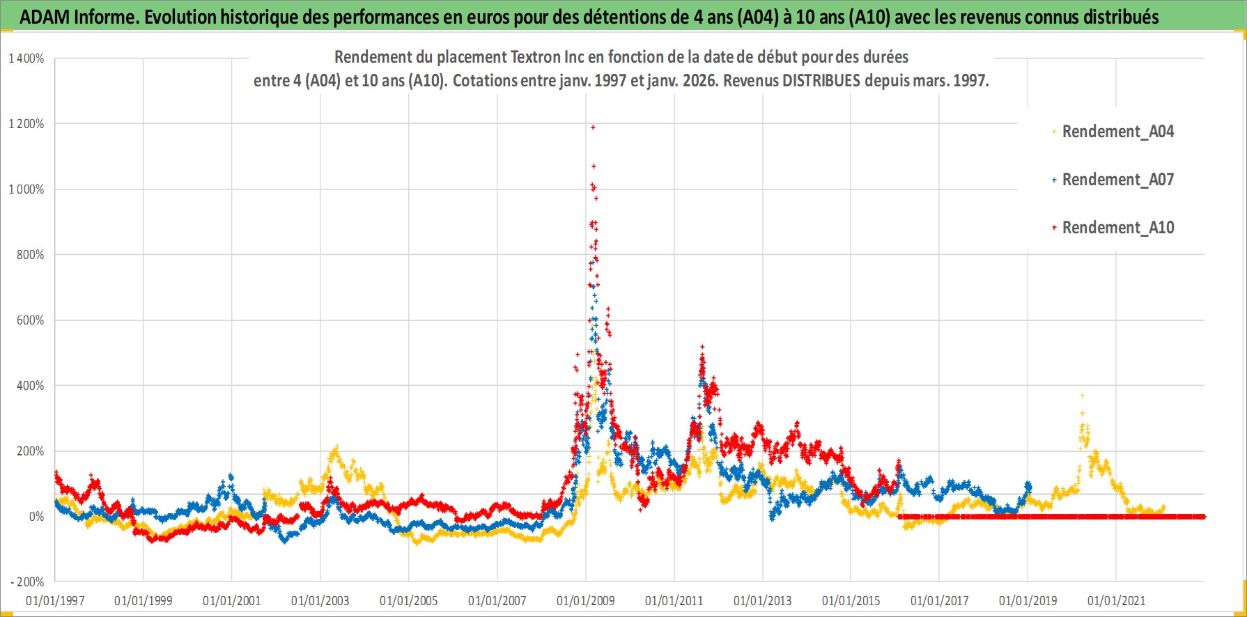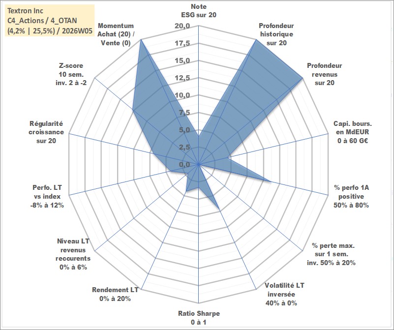 Site dédié aux investisseursPage dédiée sur site financeAnalyse des valorisations hebdomadaires de l'action Textron Inc. Cet actif est cote en USD. Les valorisations sont en contrevaleur EURO et couvrent les semaines 1997W01 a 2026W05. Les revenus de cet actif financier sont pris en compte depuis la semaine 1997W11. La note globale ESG de cet actif est estimee a 4.0 (apres rebasage entre 0 et 20).