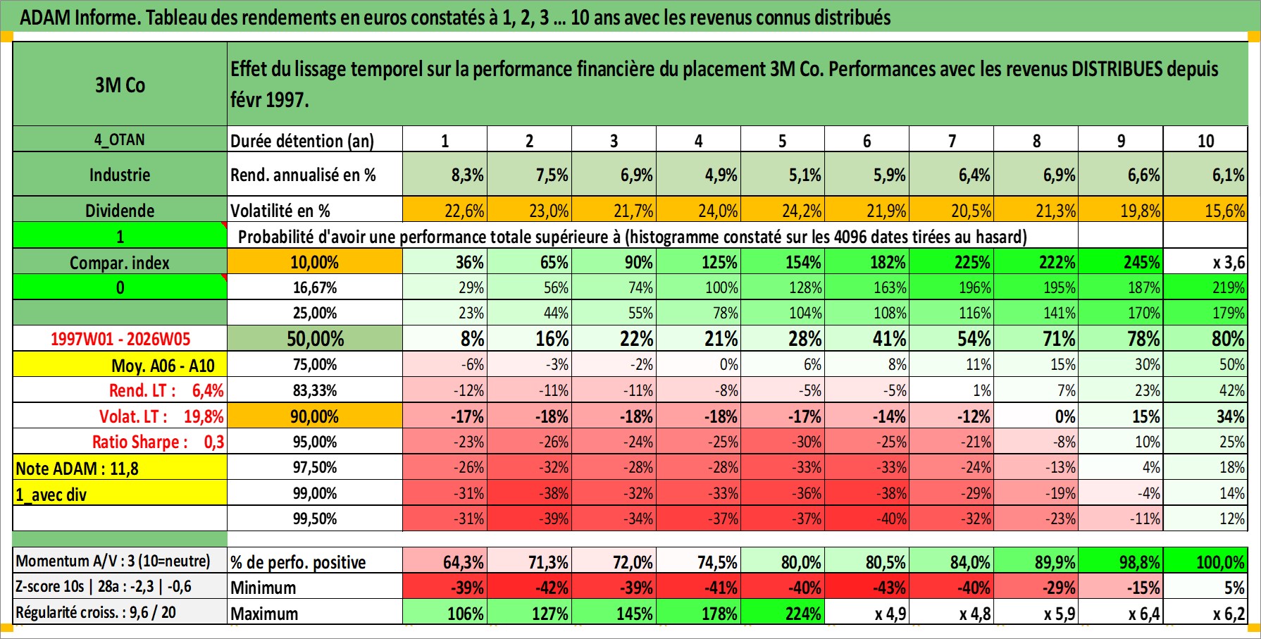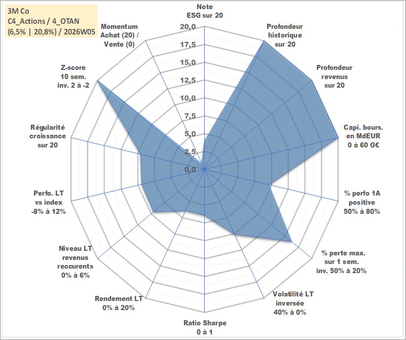 Site dédié aux investisseursPage dédiée sur site financeAnalyse des valorisations hebdomadaires de l'action 3M Co. Cet actif est cote en USD. Les valorisations sont en contrevaleur EURO et couvrent les semaines 1997W01 a 2026W05. Les revenus de cet actif financier sont pris en compte depuis la semaine 1997W08. La note globale ESG de cet actif est estimee a 4.0 (apres rebasage entre 0 et 20).