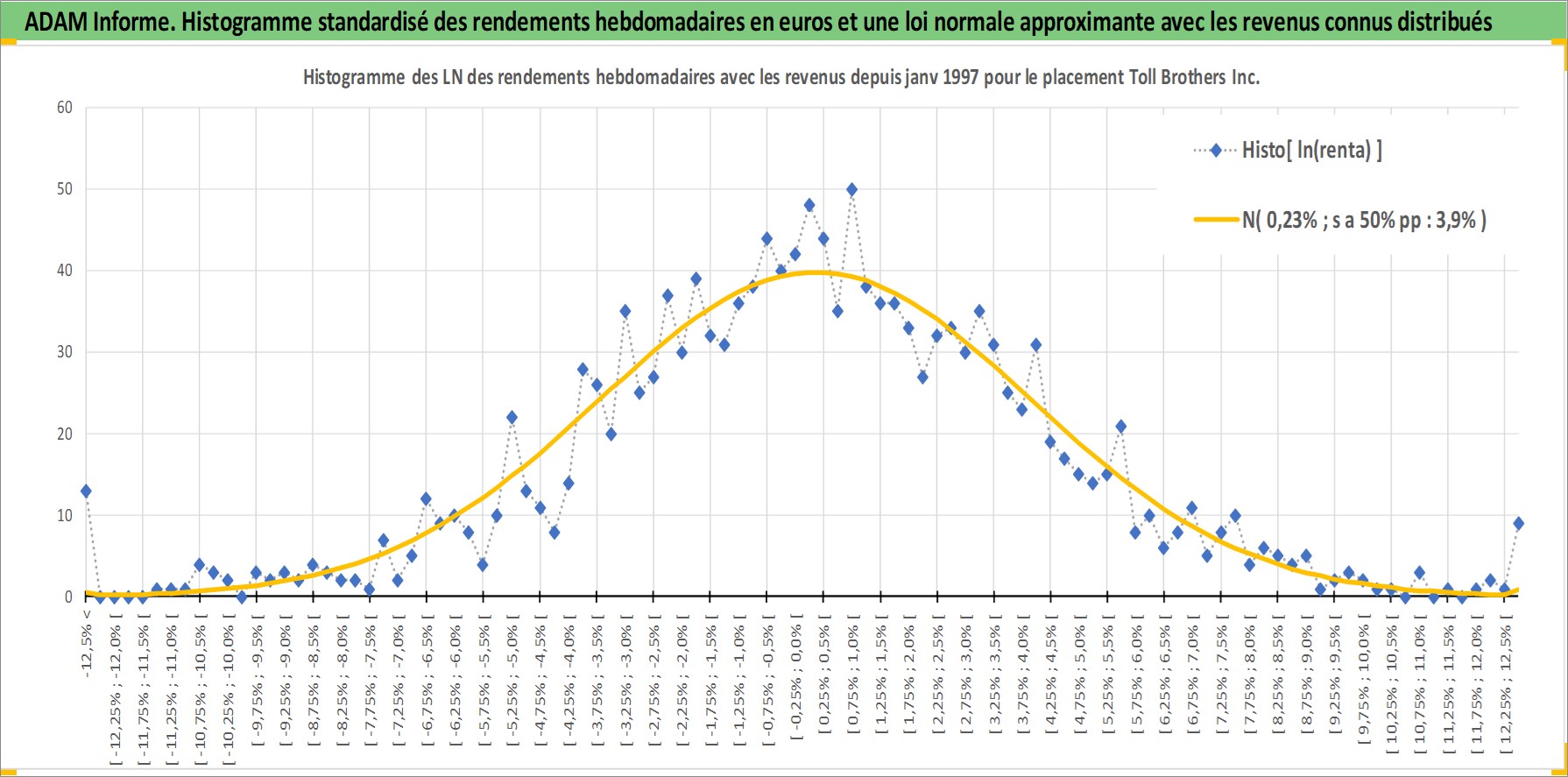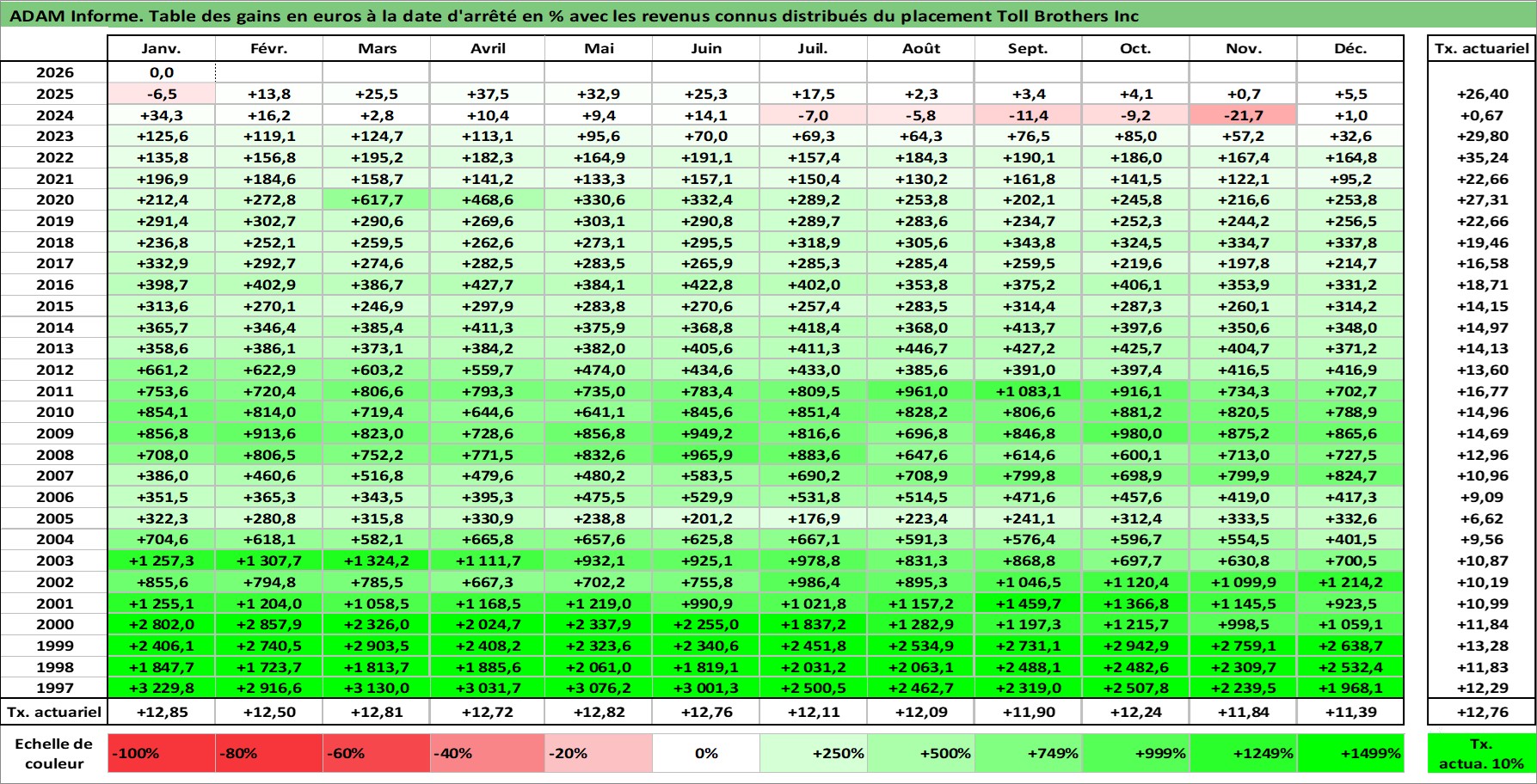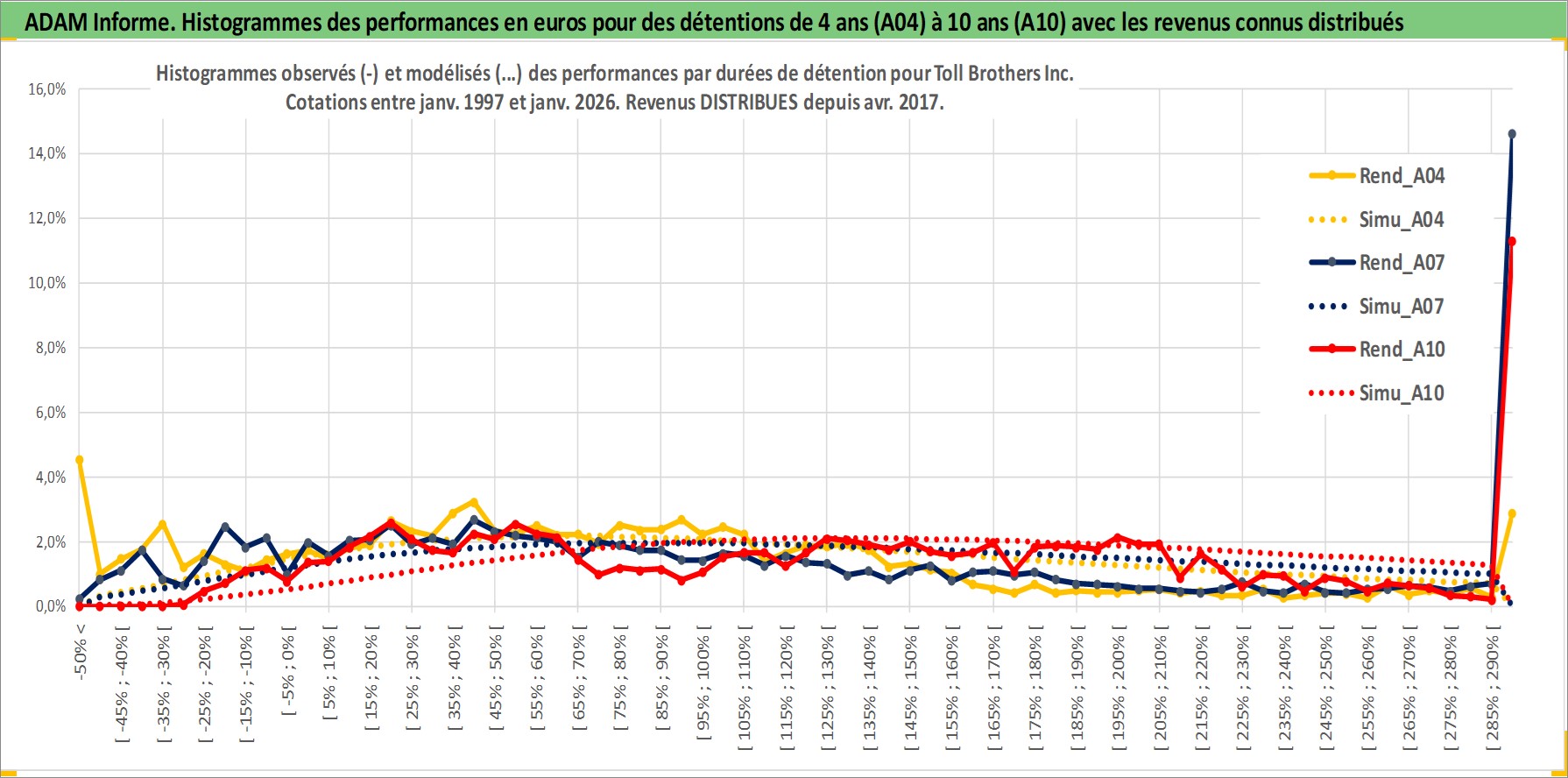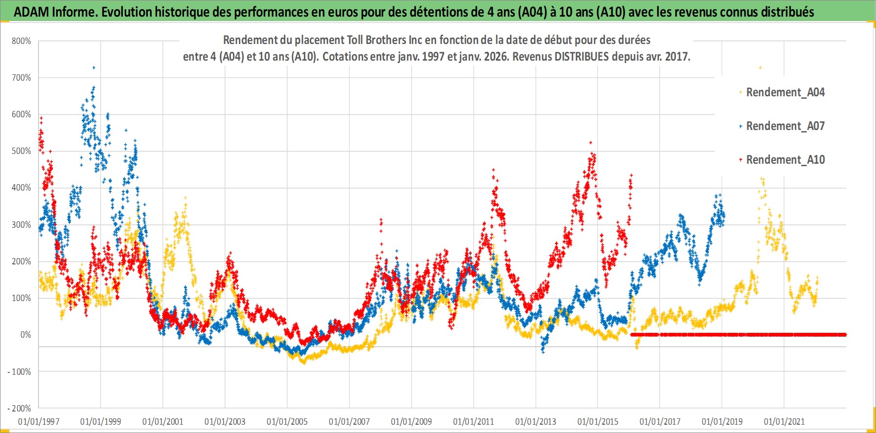 Site dédié aux investisseursPage dédiée sur site financeAnalyse des valorisations hebdomadaires de l'action Toll Brothers Inc. Cet actif est cote en USD. Les valorisations sont en contrevaleur EURO et couvrent les semaines 1997W01 a 2026W05. Les revenus de cet actif financier sont pris en compte depuis la semaine 2017W15. La note globale ESG de cet actif est estimee a 9.0 (apres rebasage entre 0 et 20).