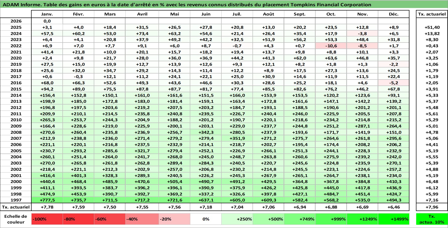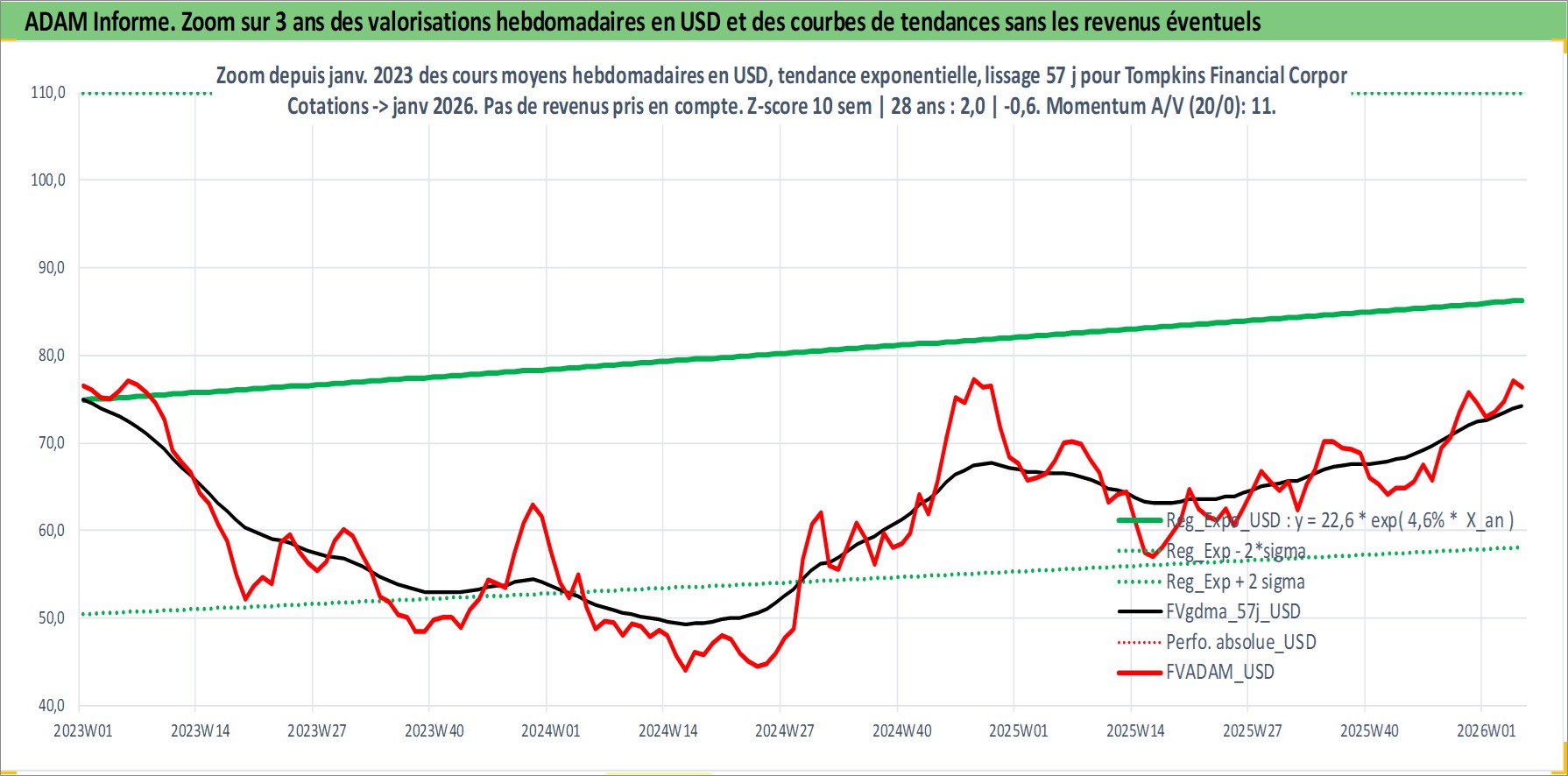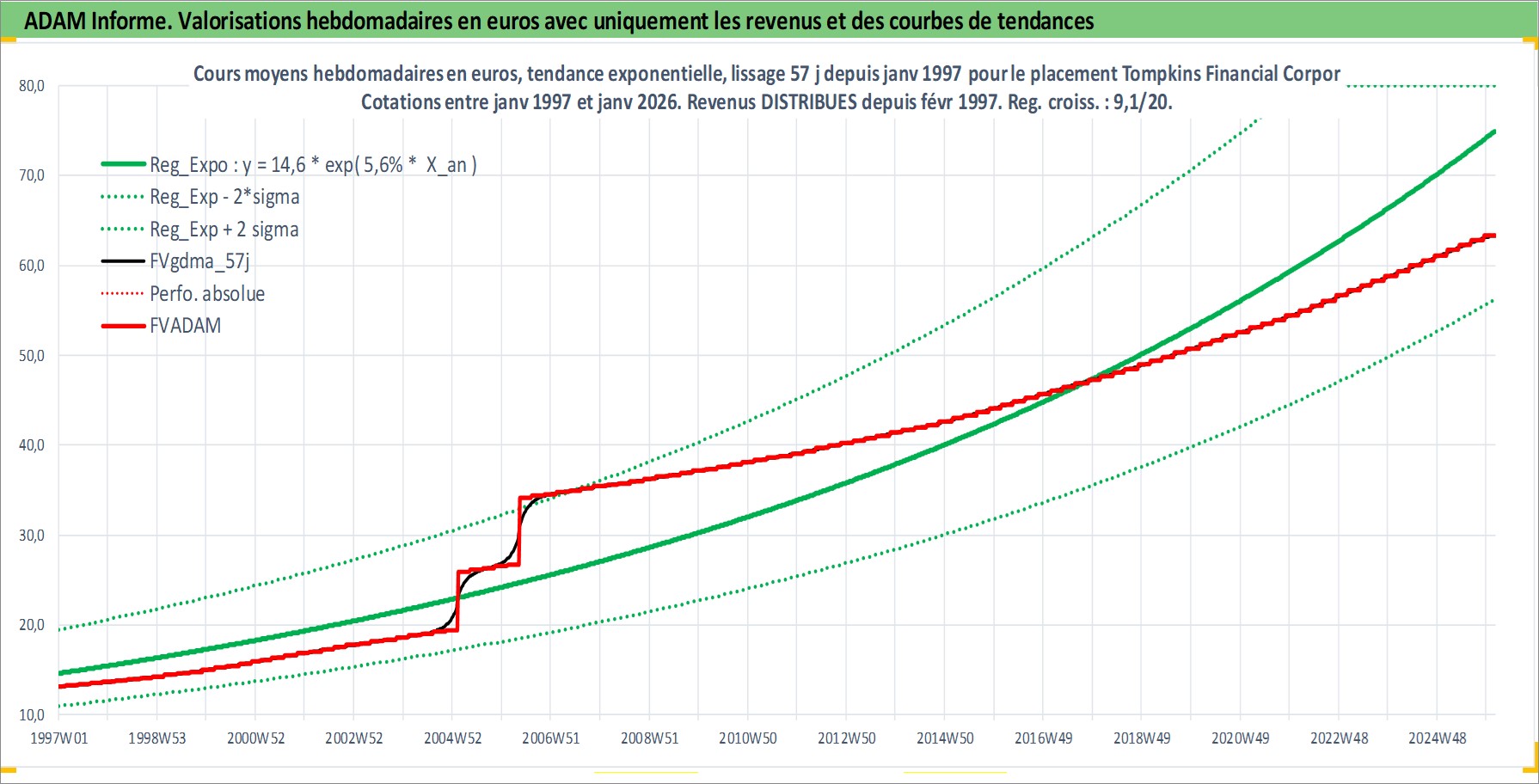 Site dédié aux investisseursPage dédiée sur site financeAnalyse des valorisations hebdomadaires de l'action Tompkins Financial Corporation. Cet actif est cote en USD. Les valorisations sont en contrevaleur EURO et couvrent les semaines 1997W01 a 2026W05. Les revenus de cet actif financier sont pris en compte depuis la semaine 1997W09. La note ESG de cet actif n'est pas connue.