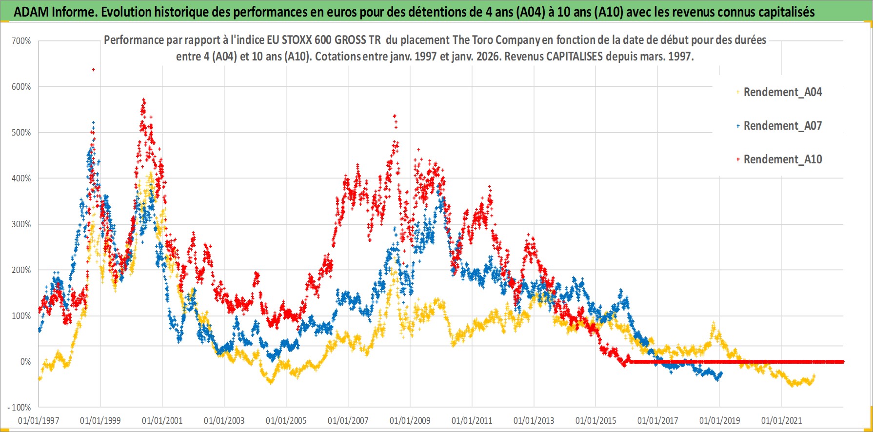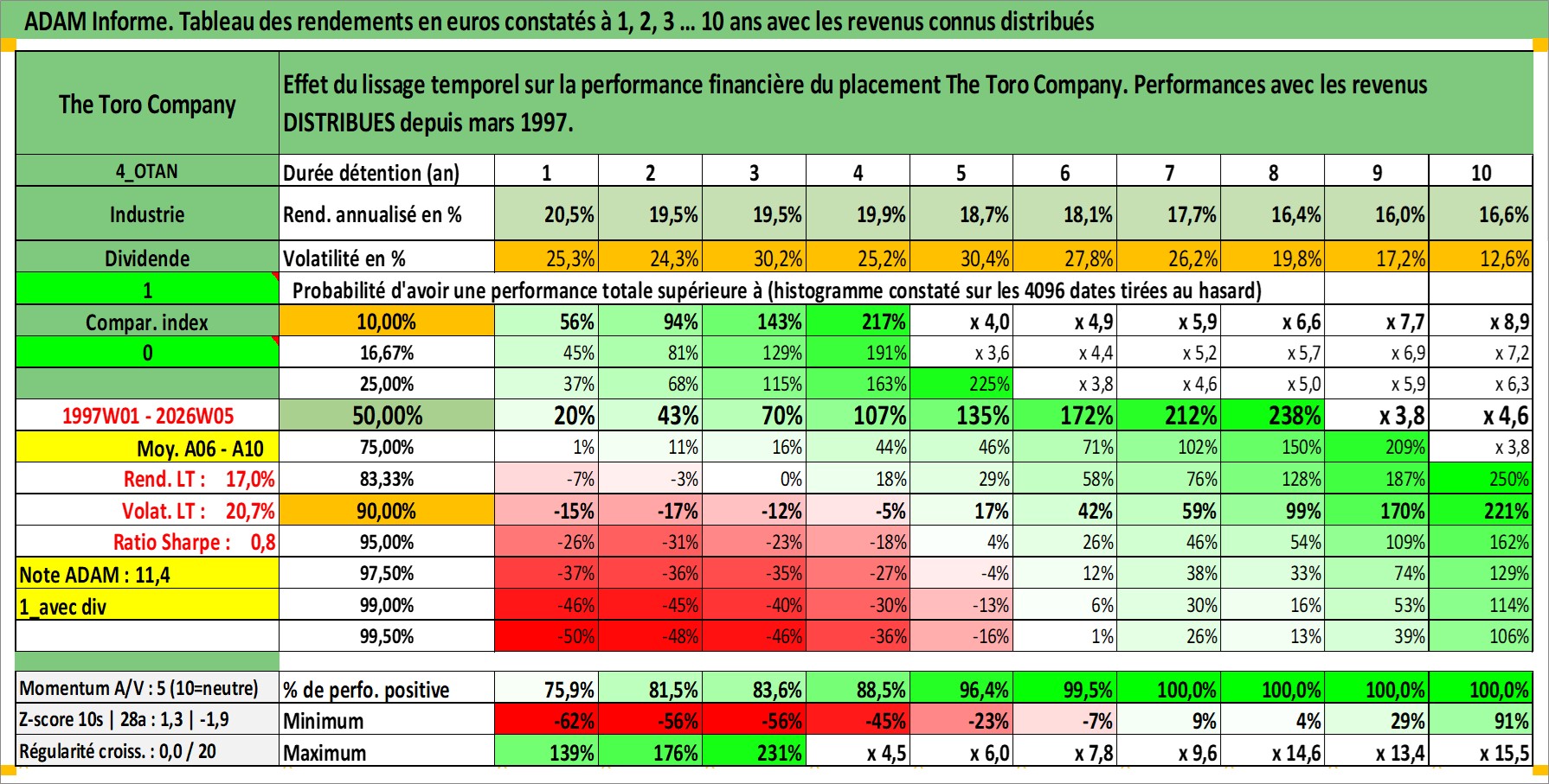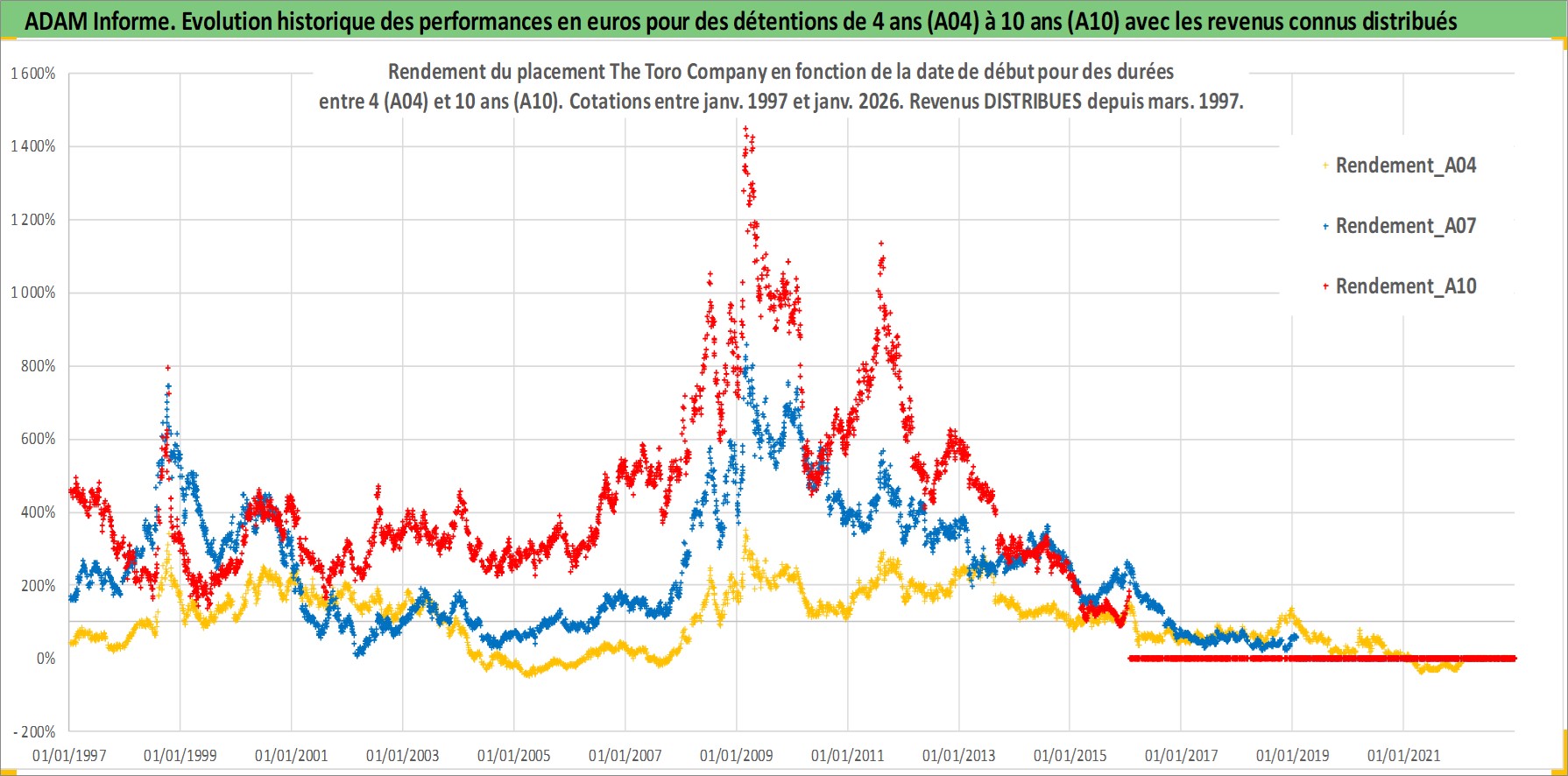 Site dédié aux investisseursPage dédiée sur site financeAnalyse des valorisations hebdomadaires de l'action The Toro Company. Cet actif est cote en USD. Les valorisations sont en contrevaleur EURO et couvrent les semaines 1997W01 a 2026W05. Les revenus de cet actif financier sont pris en compte depuis la semaine 1997W13. La note globale ESG de cet actif est estimee a 10.0 (apres rebasage entre 0 et 20).