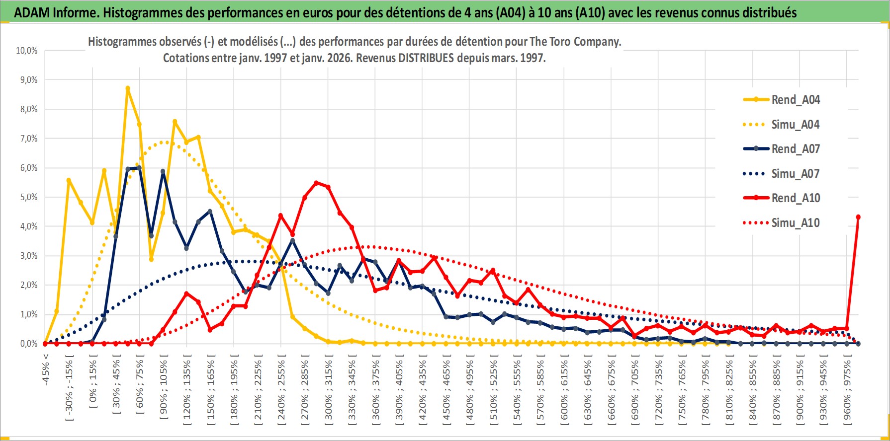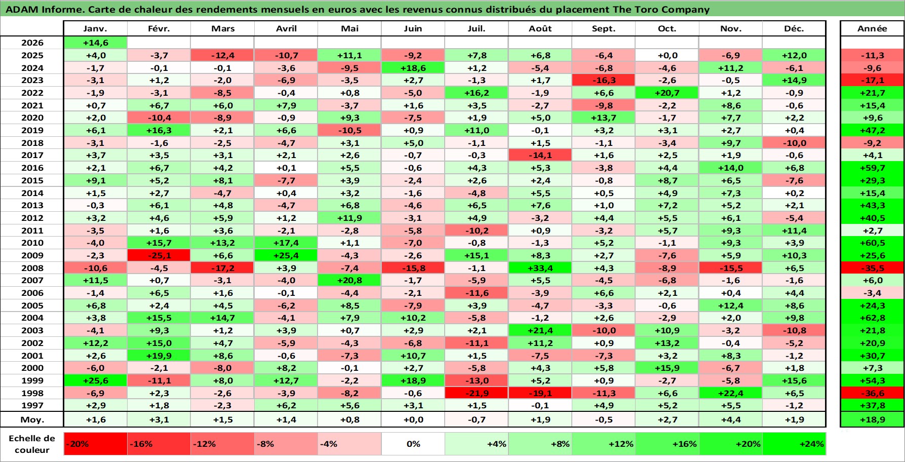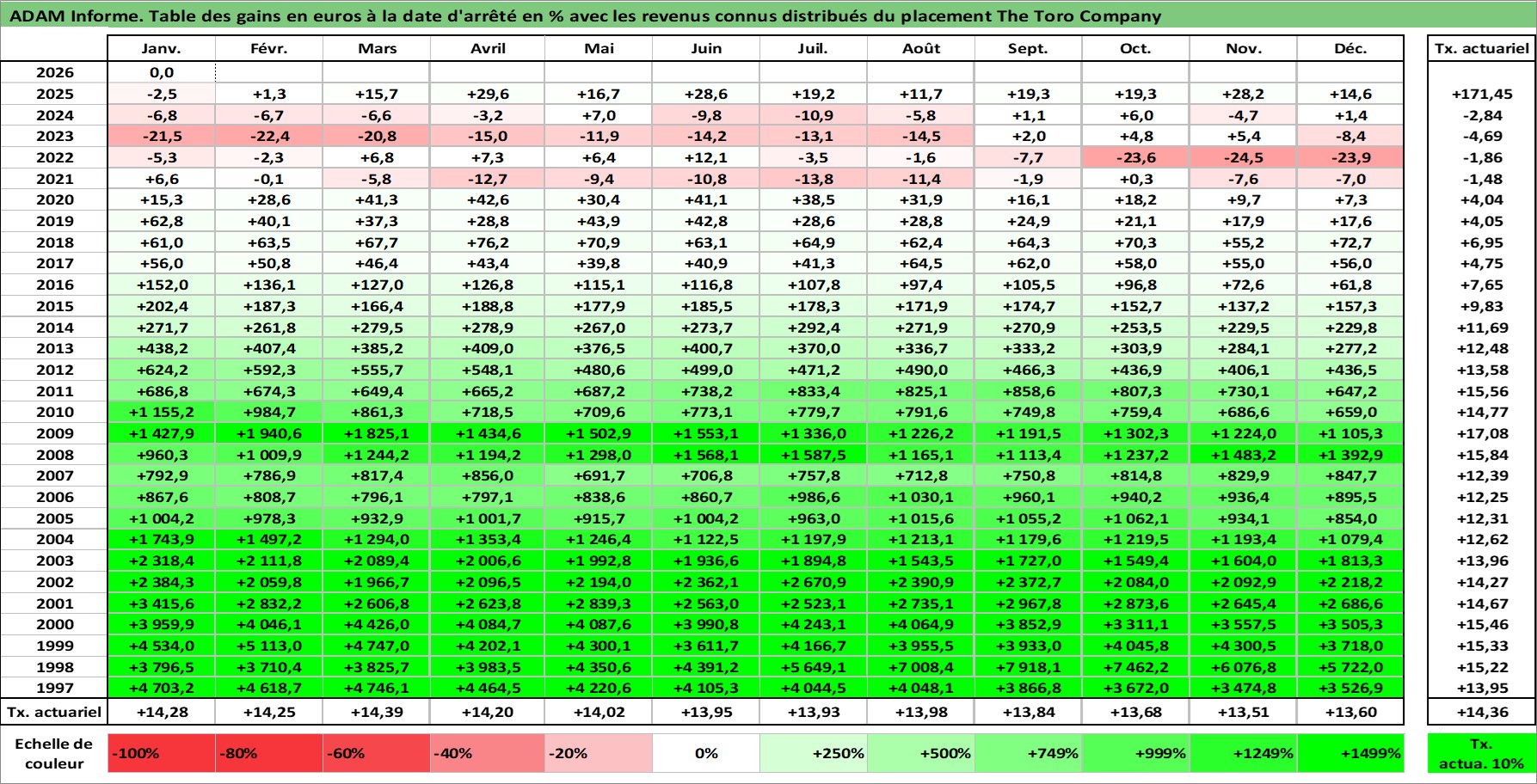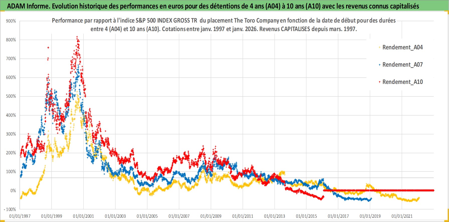 Site dédié aux investisseursPage dédiée sur site financeAnalyse des valorisations hebdomadaires de l'action The Toro Company. Cet actif est cote en USD. Les valorisations sont en contrevaleur EURO et couvrent les semaines 1997W01 a 2026W05. Les revenus de cet actif financier sont pris en compte depuis la semaine 1997W13. La note globale ESG de cet actif est estimee a 10.0 (apres rebasage entre 0 et 20).