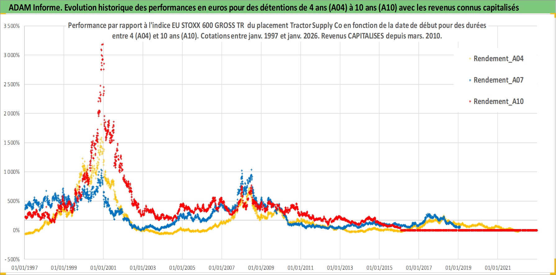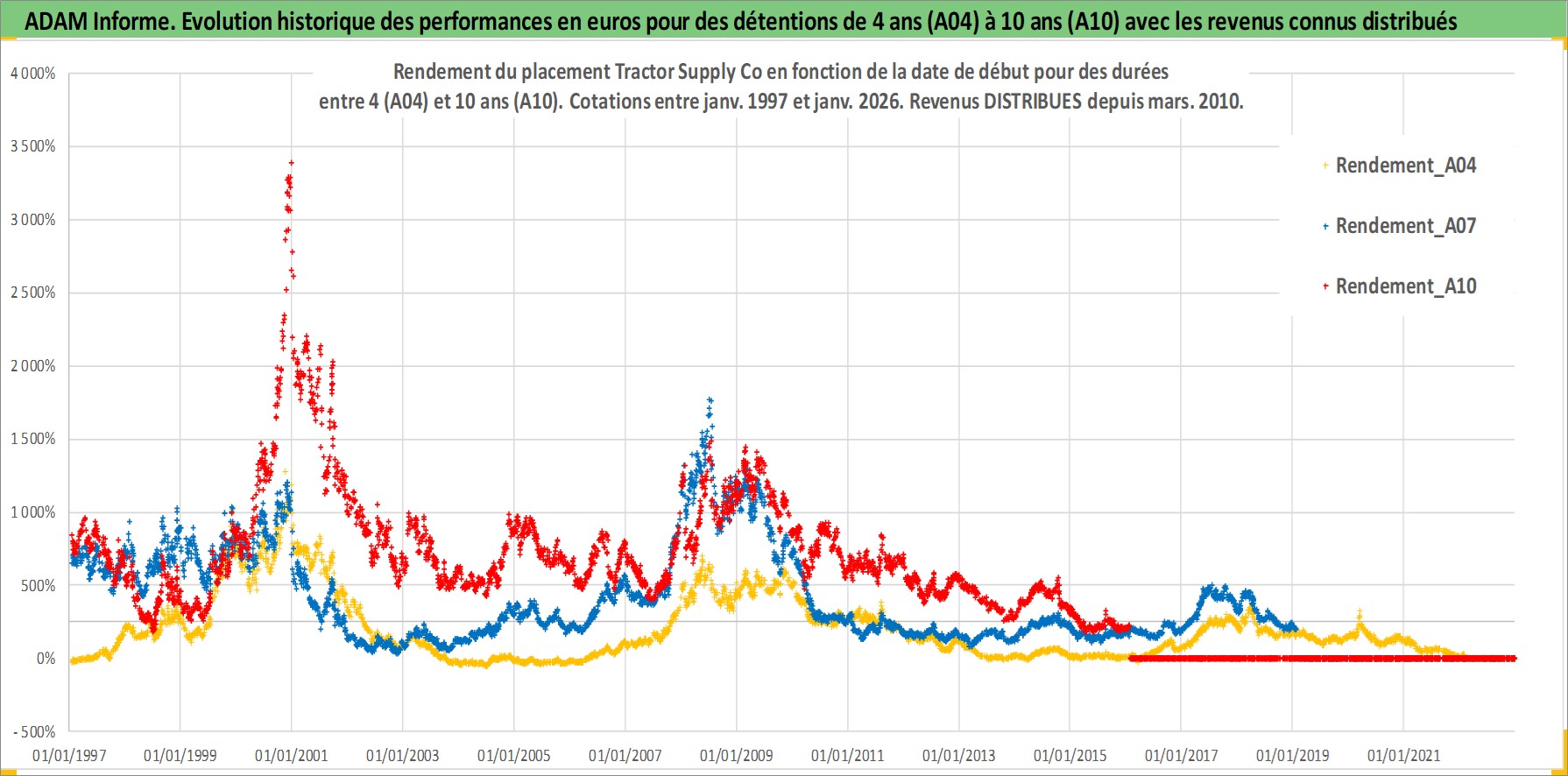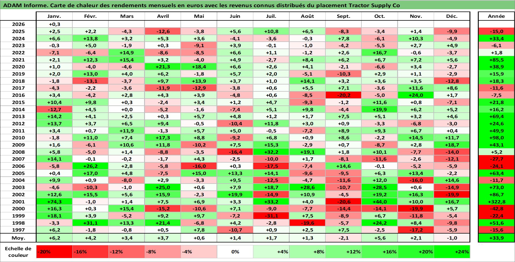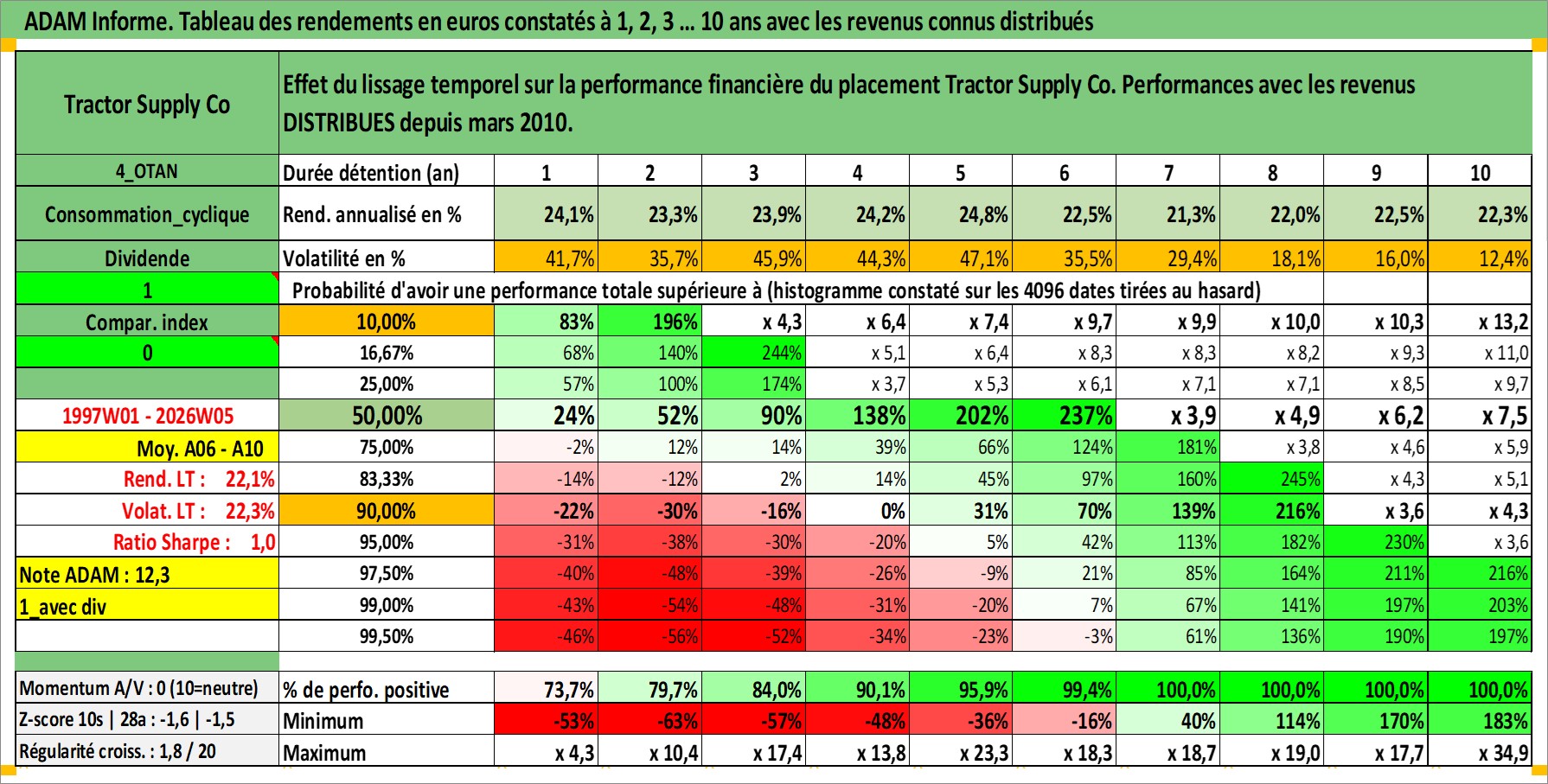 Site dédié aux investisseursPage dédiée sur site financeAnalyse des valorisations hebdomadaires de l'action Tractor Supply Co. Cet actif est cote en USD. Les valorisations sont en contrevaleur EURO et couvrent les semaines 1997W01 a 2026W05. Les revenus de cet actif financier sont pris en compte depuis la semaine 2010W10. La note globale ESG de cet actif est estimee a 14.0 (apres rebasage entre 0 et 20).