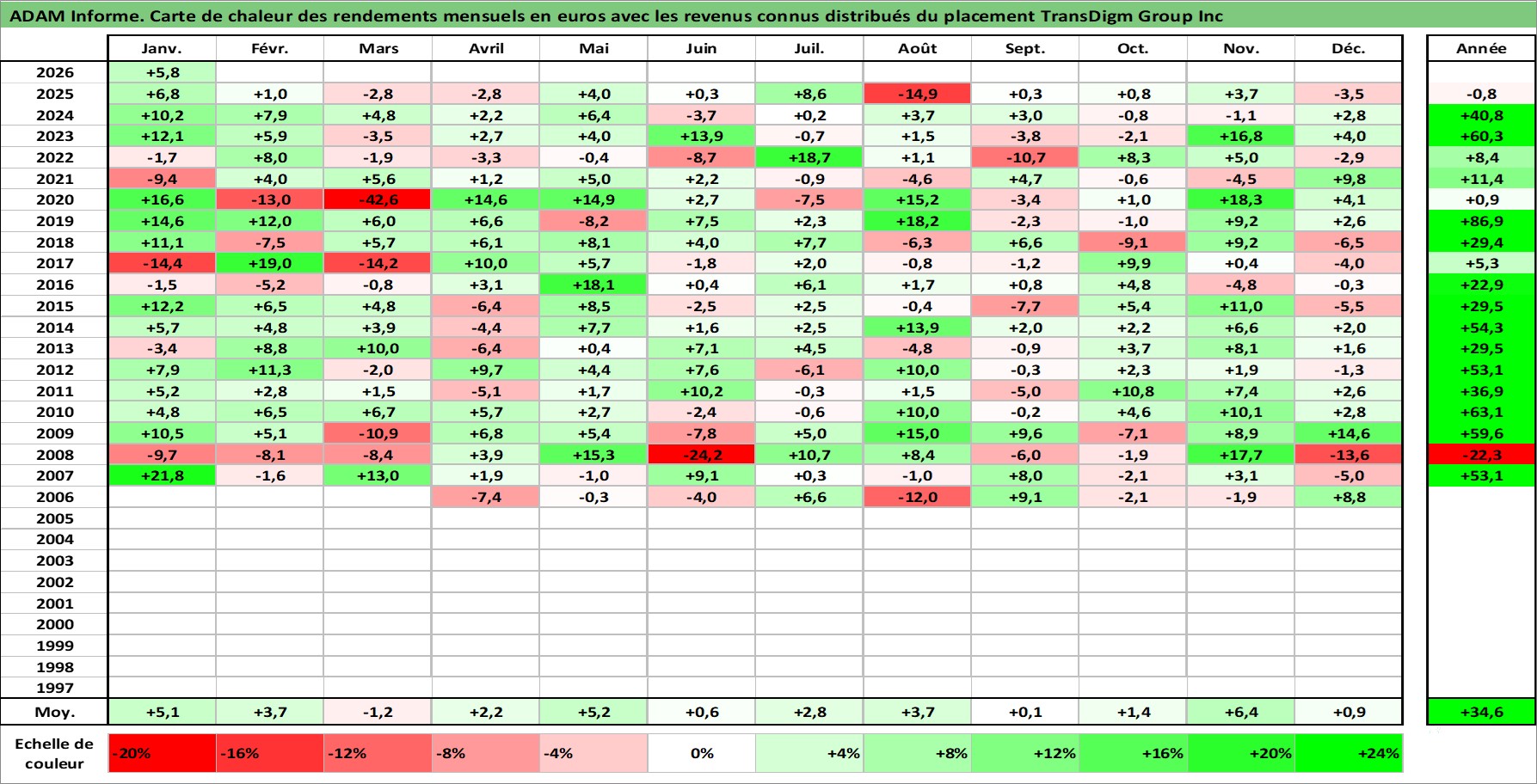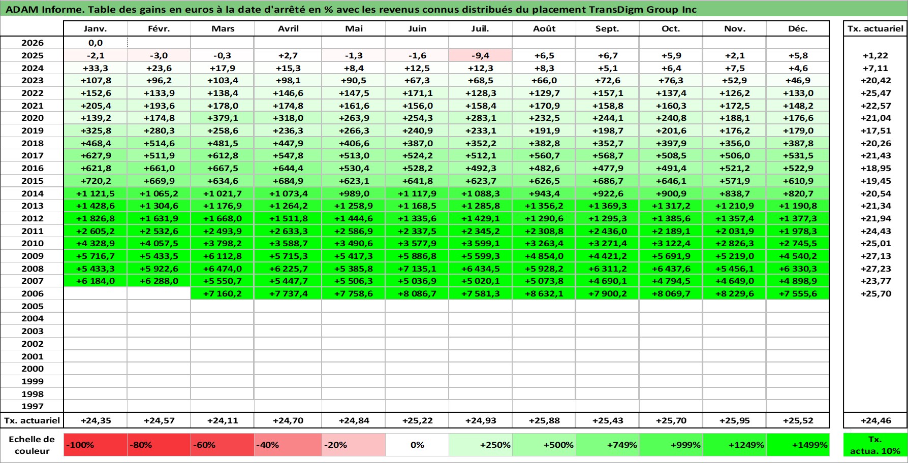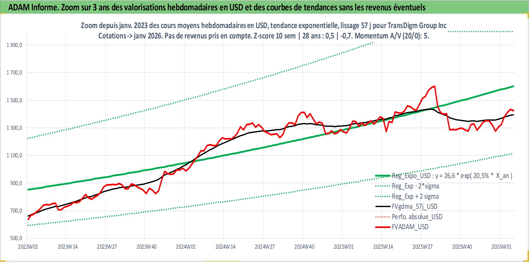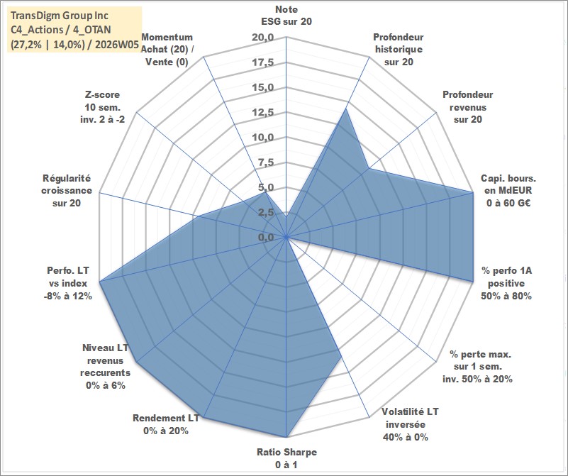Site dédié aux investisseursPage dédiée sur site financeAnalyse des valorisations hebdomadaires de l'action TransDigm Group Inc. Cet actif est cote en USD. Les valorisations sont en contrevaleur EURO et couvrent les semaines 2006W11 a 2026W05. Les revenus de cet actif financier sont pris en compte depuis la semaine 2009W42. La note globale ESG de cet actif est estimee a 2.0 (apres rebasage entre 0 et 20).