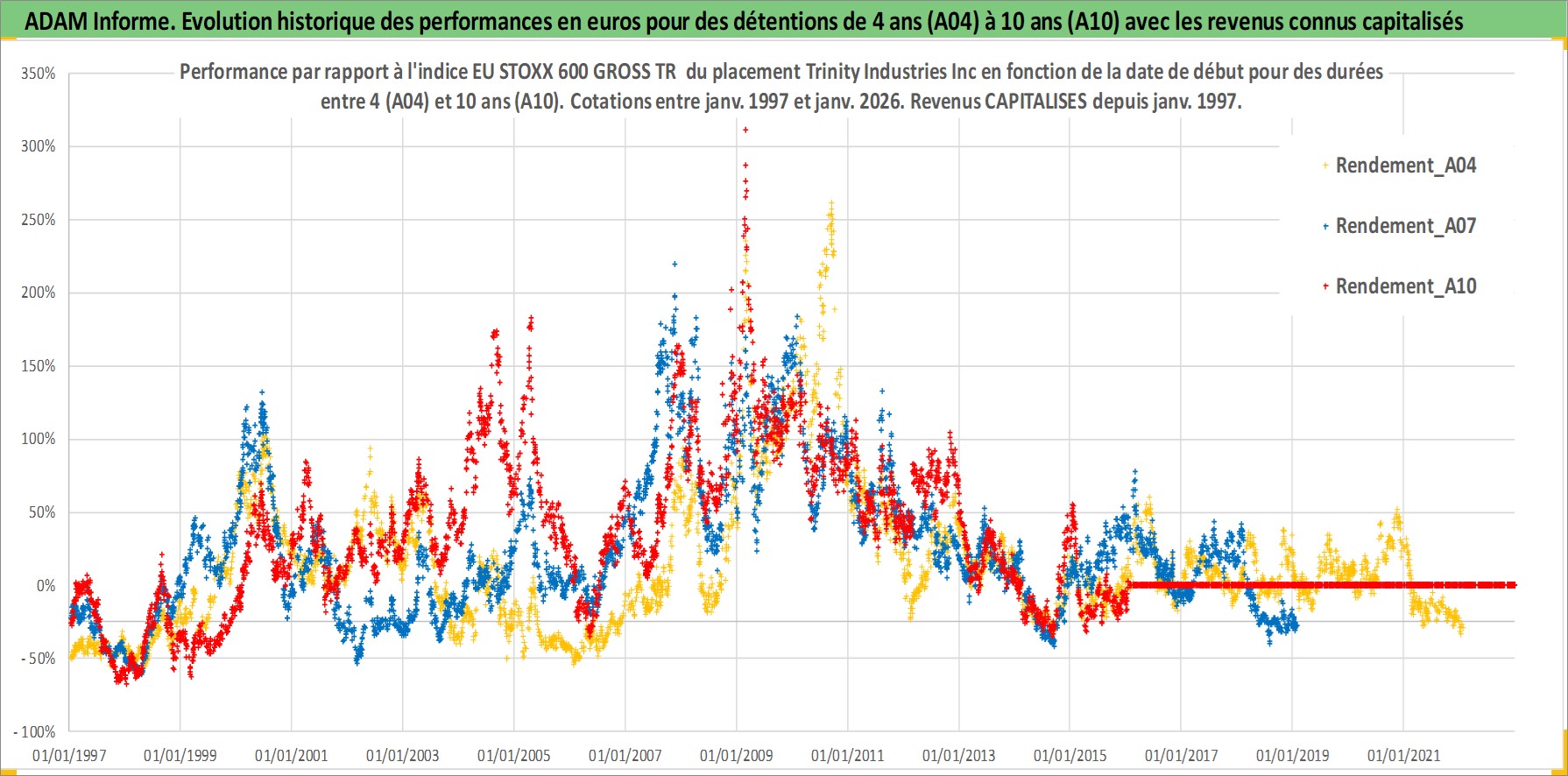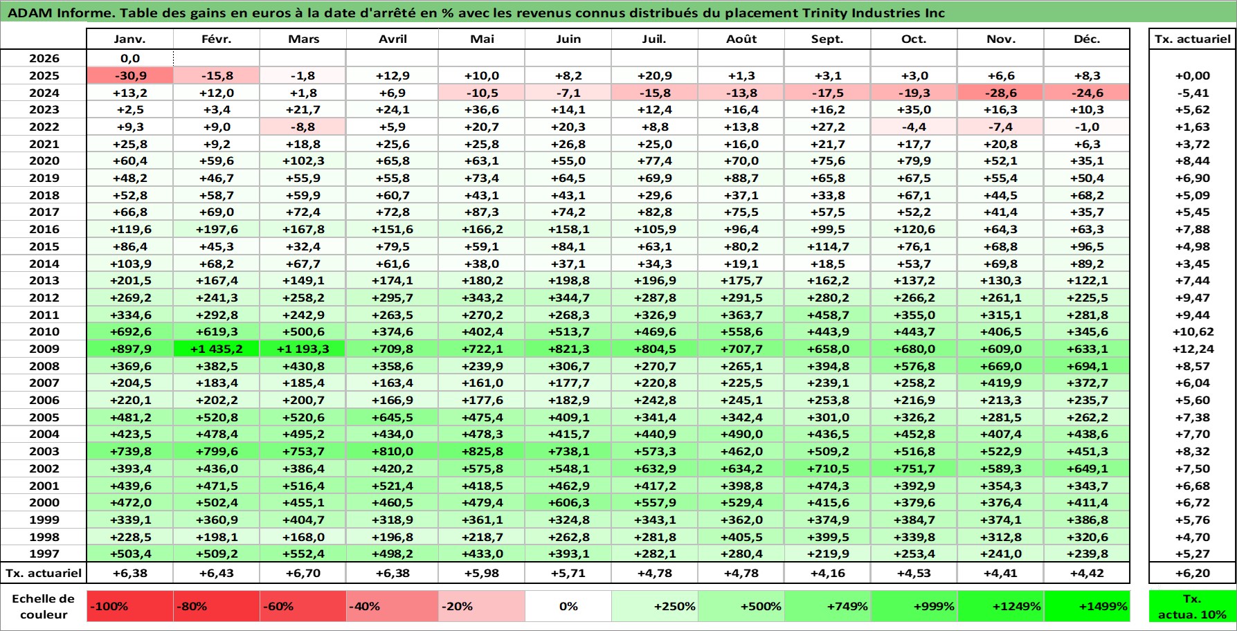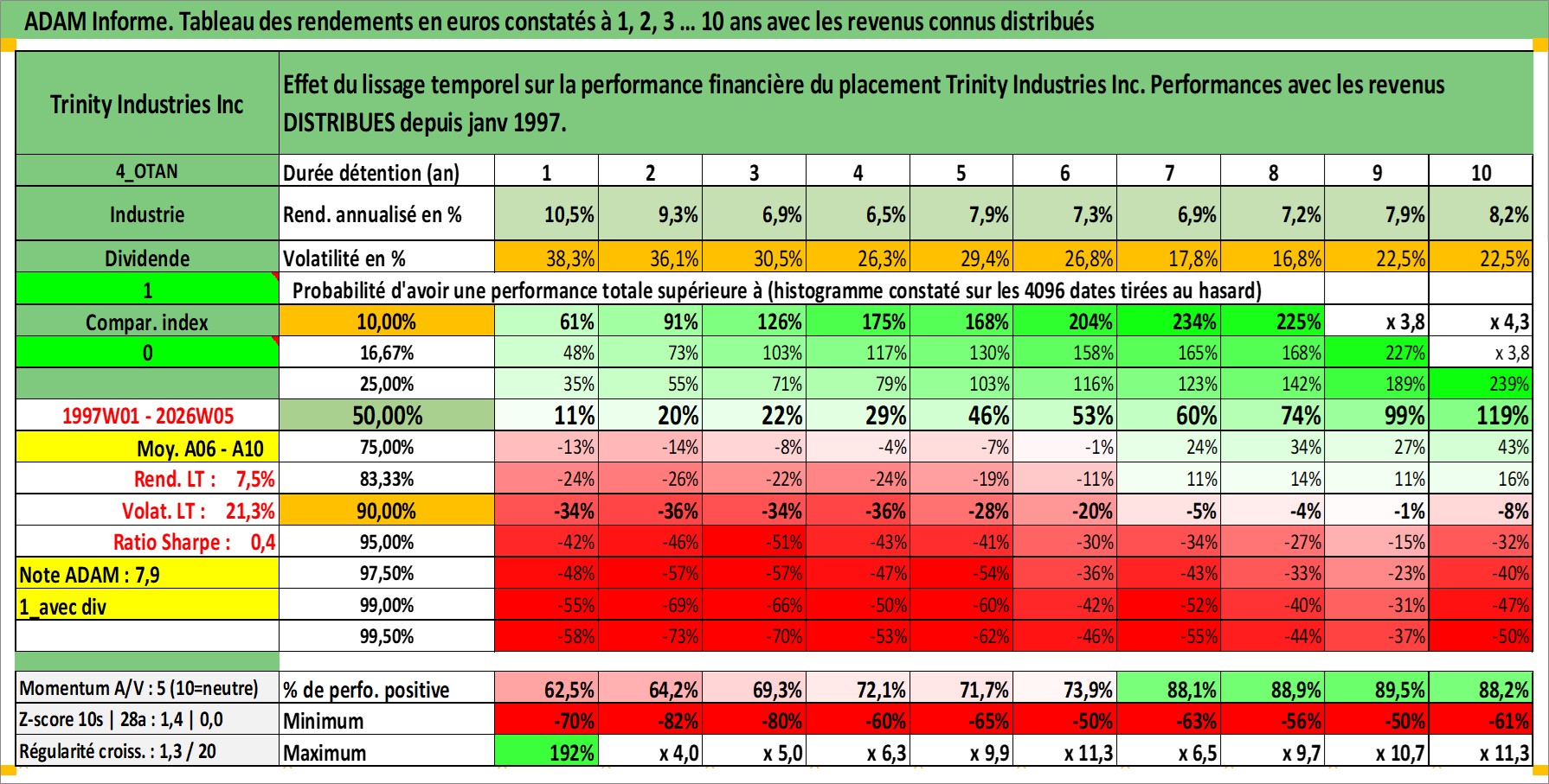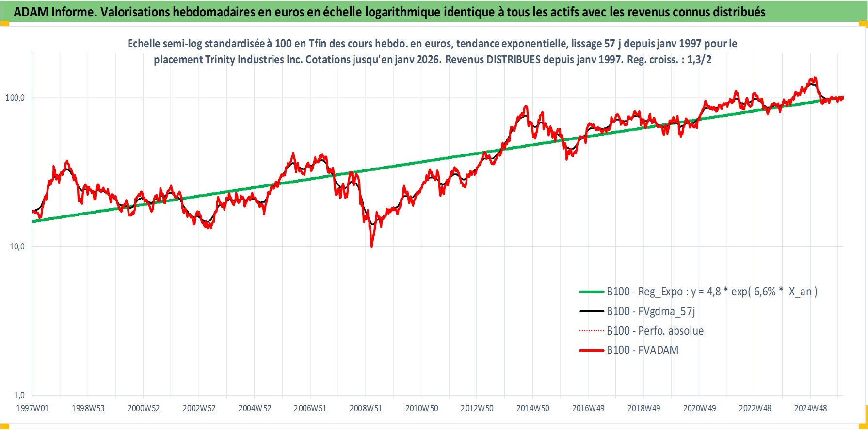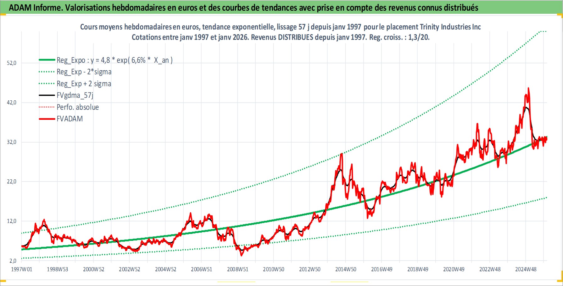 Site dédié aux investisseursPage dédiée sur site financeAnalyse des valorisations hebdomadaires de l'action Trinity Industries Inc. Cet actif est cote en USD. Les valorisations sont en contrevaleur EURO et couvrent les semaines 1997W01 a 2026W05. Les revenus de cet actif financier sont pris en compte depuis la semaine 1997W03. La note ESG de cet actif n'est pas connue.