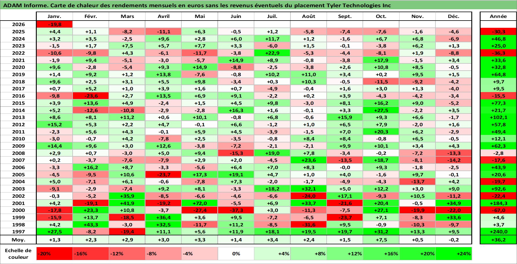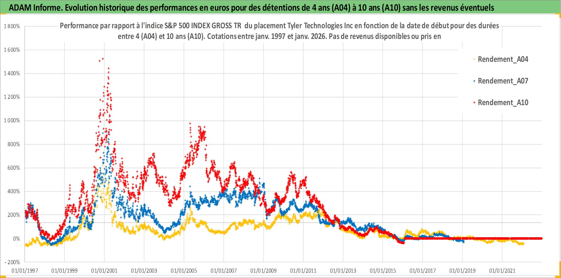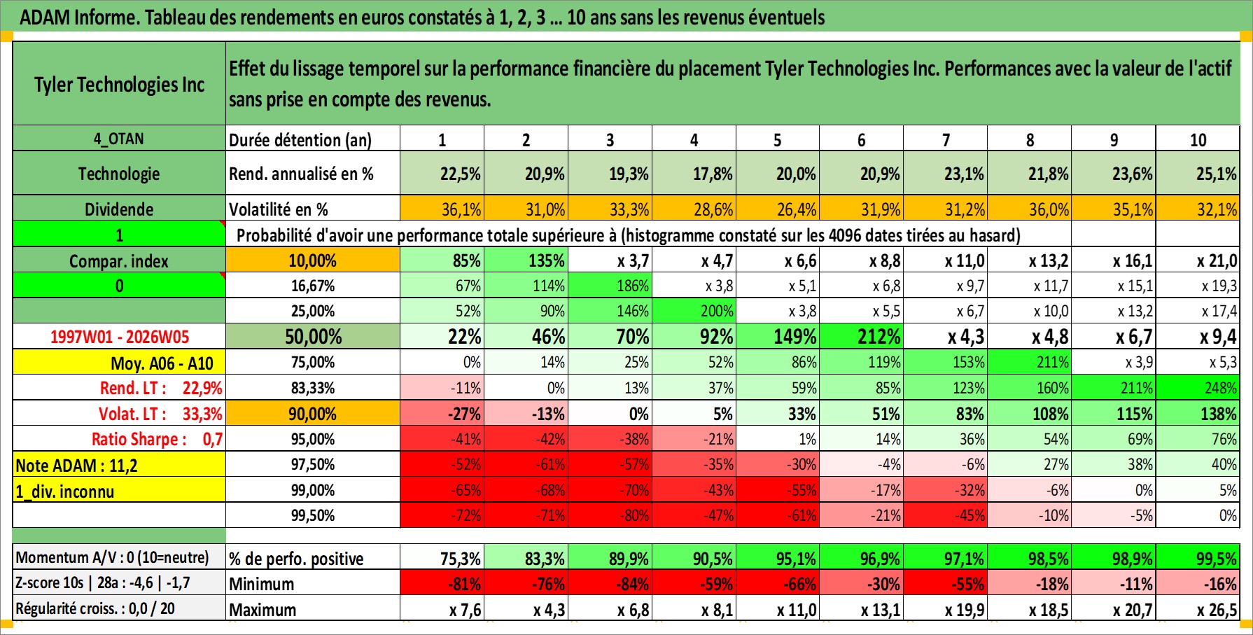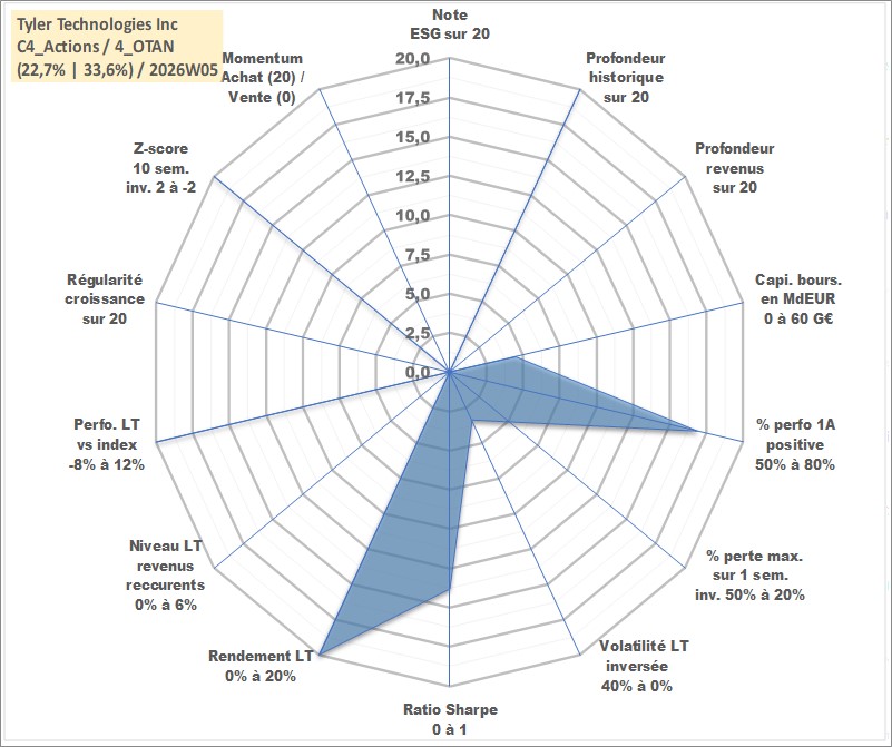 Site dédié aux investisseursPage dédiée sur site financeAnalyse des valorisations hebdomadaires de l'action Tyler Technologies Inc. Cet actif est cote en USD. Les valorisations sont en contrevaleur EURO et couvrent les semaines 1997W01 a 2026W05. Les revenus de cet actif financier ne sont pas connus car non existants ou non disponibles sur le site Yahoo Finance. La note ESG de cet actif n'est pas connue.