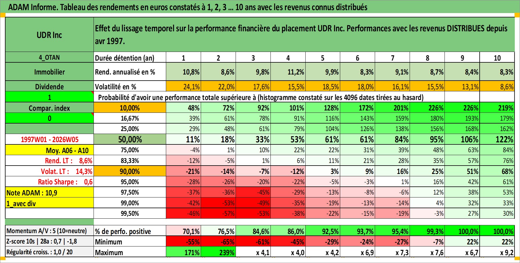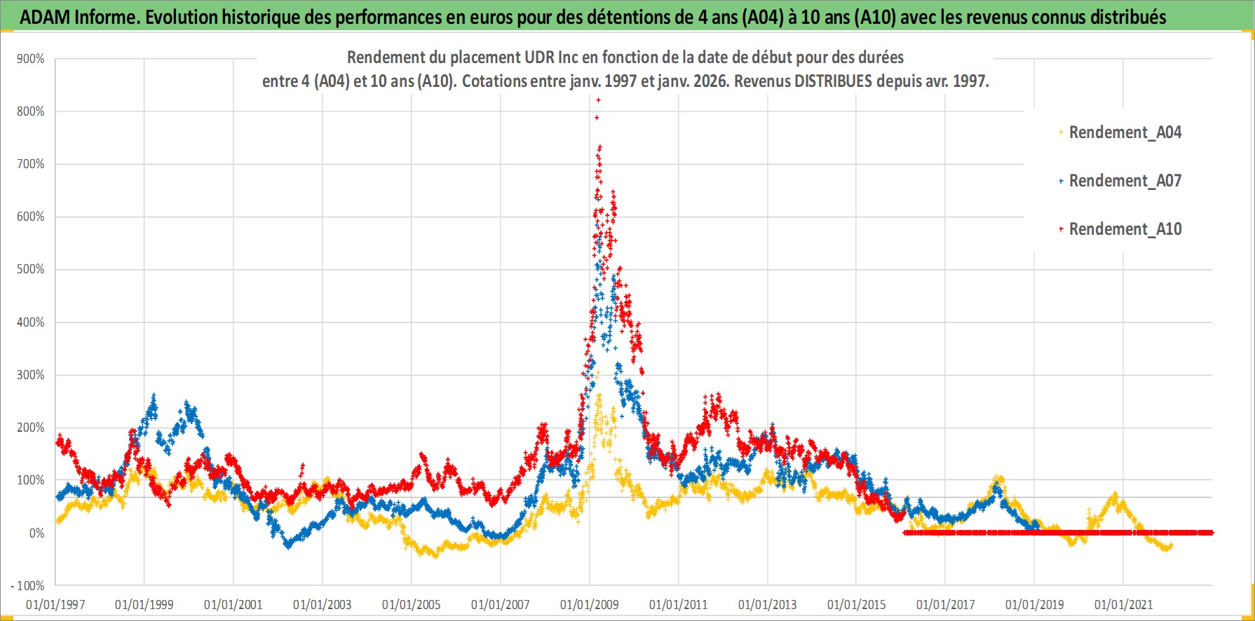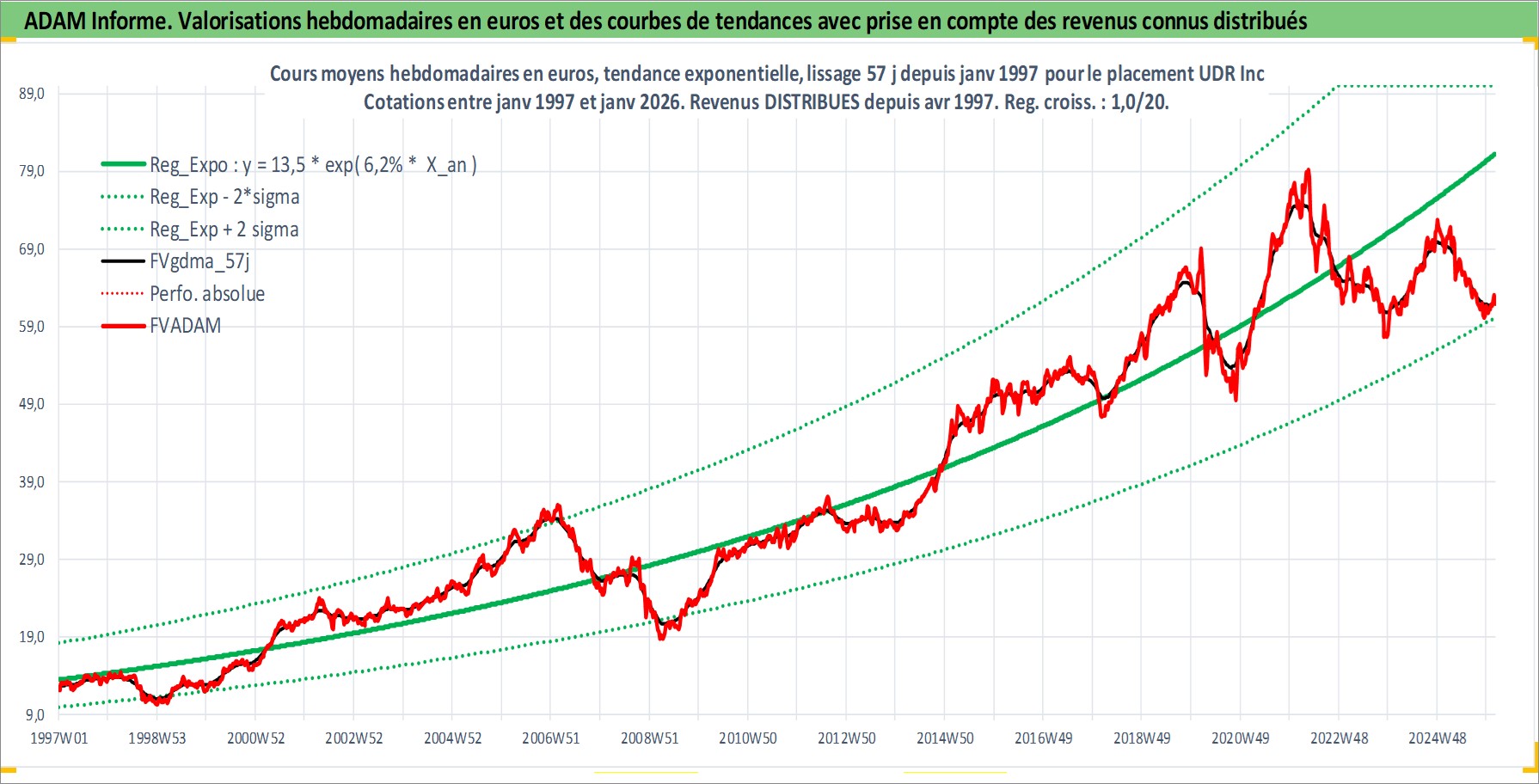 Site dédié aux investisseursPage dédiée sur site financeAnalyse des valorisations hebdomadaires de l'action UDR Inc. Cet actif est cote en USD. Les valorisations sont en contrevaleur EURO et couvrent les semaines 1997W01 a 2026W05. Les revenus de cet actif financier sont pris en compte depuis la semaine 1997W15. La note globale ESG de cet actif est estimee a 15.0 (apres rebasage entre 0 et 20).