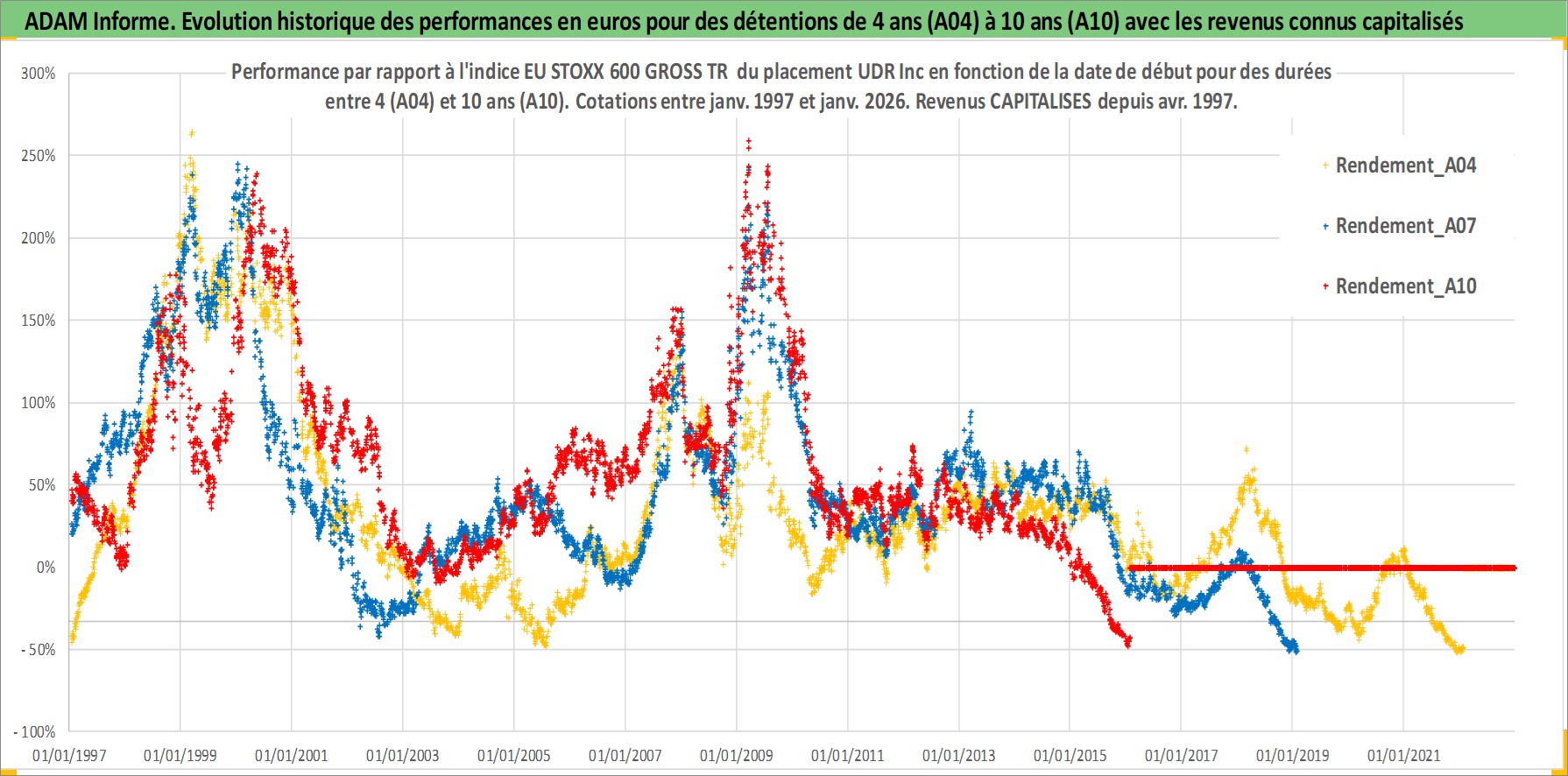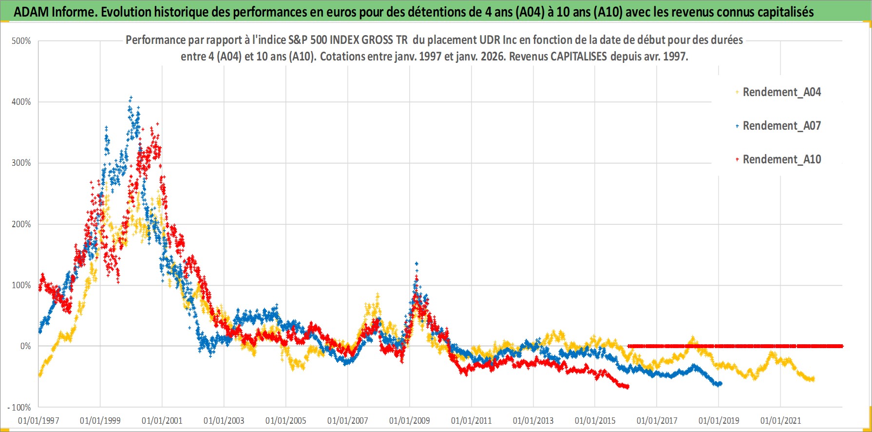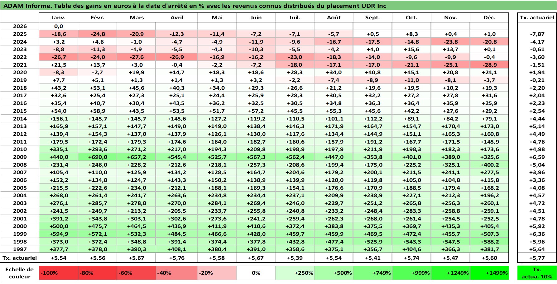 Site dédié aux investisseursPage dédiée sur site financeAnalyse des valorisations hebdomadaires de l'action UDR Inc. Cet actif est cote en USD. Les valorisations sont en contrevaleur EURO et couvrent les semaines 1997W01 a 2026W05. Les revenus de cet actif financier sont pris en compte depuis la semaine 1997W15. La note globale ESG de cet actif est estimee a 15.0 (apres rebasage entre 0 et 20).
