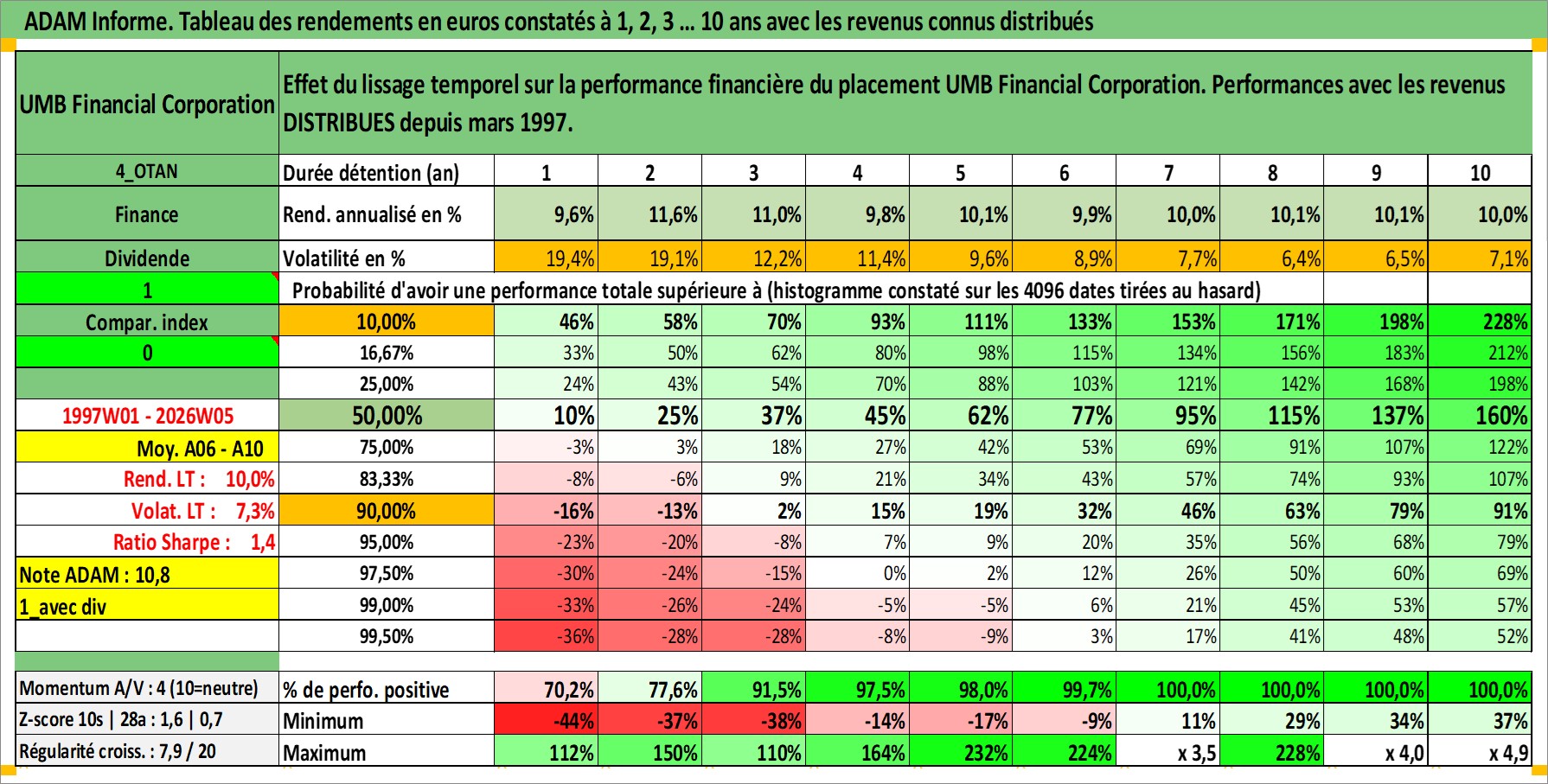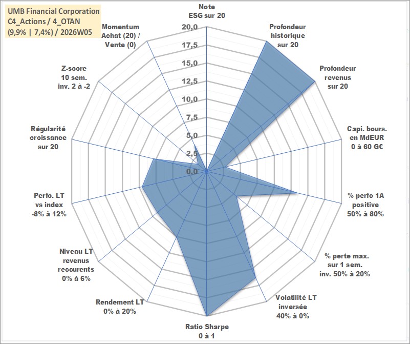 Site dédié aux investisseursPage dédiée sur site financeAnalyse des valorisations hebdomadaires de l'action UMB Financial Corporation. Cet actif est cote en USD. Les valorisations sont en contrevaleur EURO et couvrent les semaines 1997W01 a 2026W05. Les revenus de cet actif financier sont pris en compte depuis la semaine 1997W11. La note ESG de cet actif n'est pas connue.