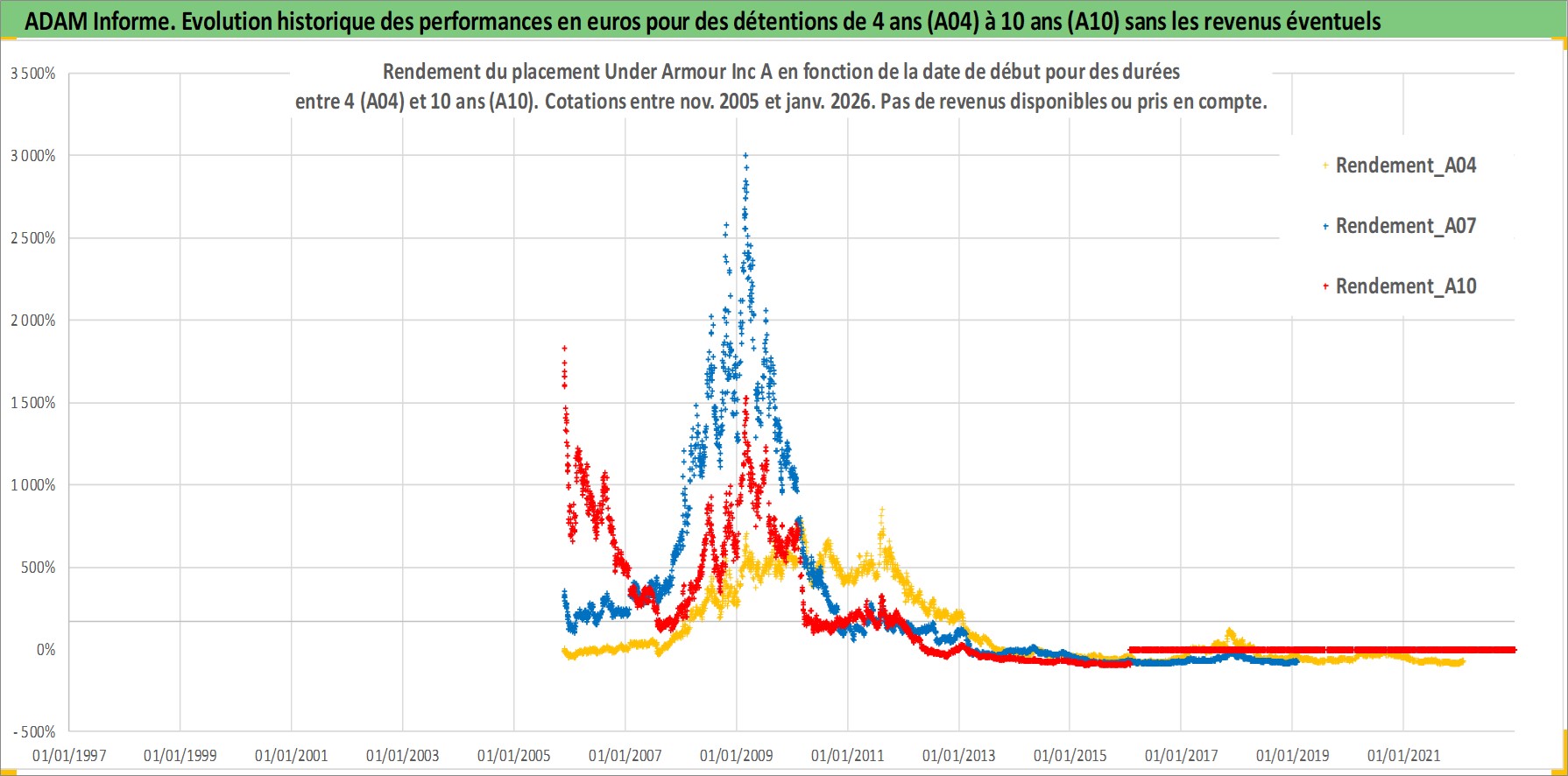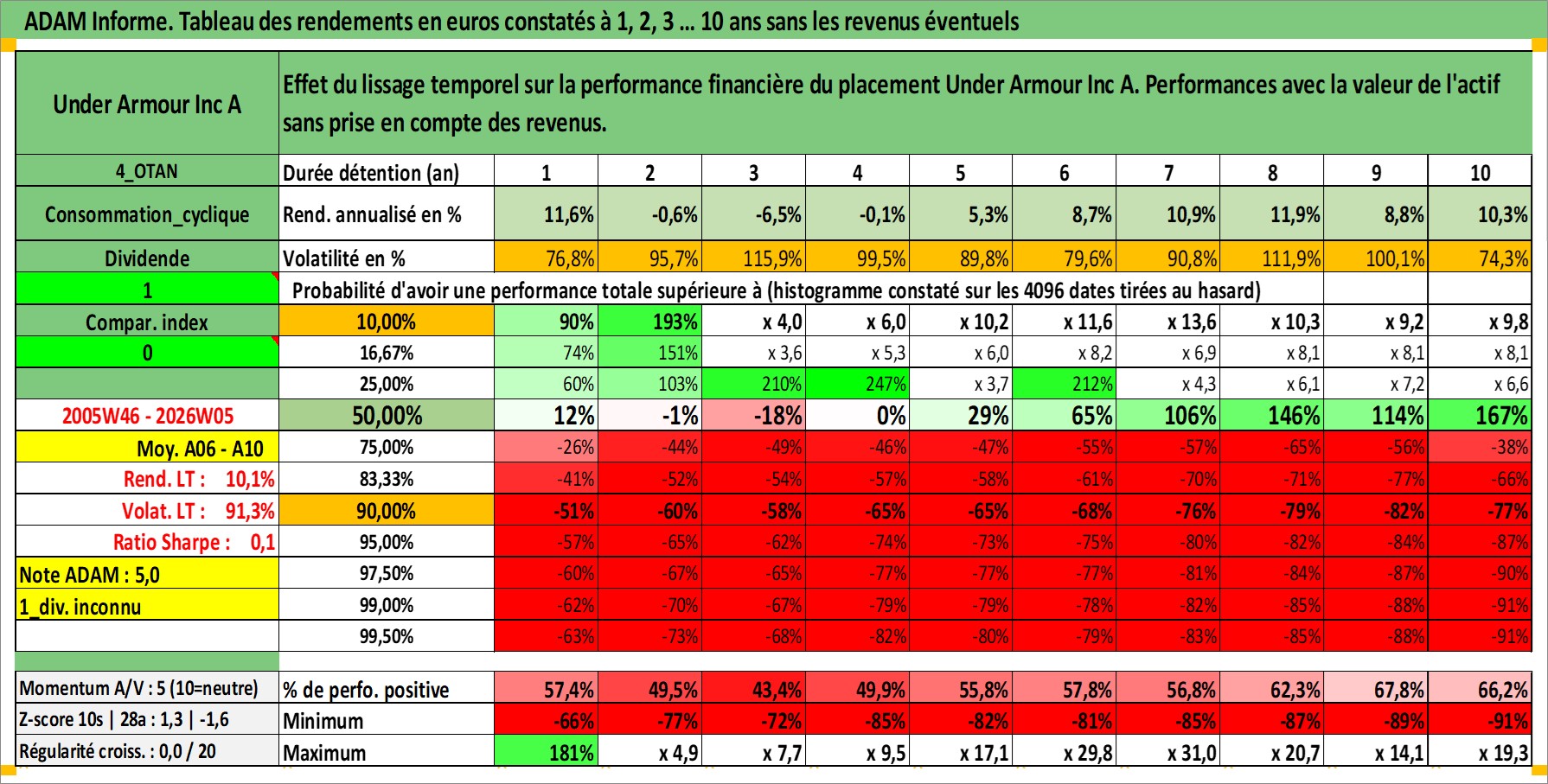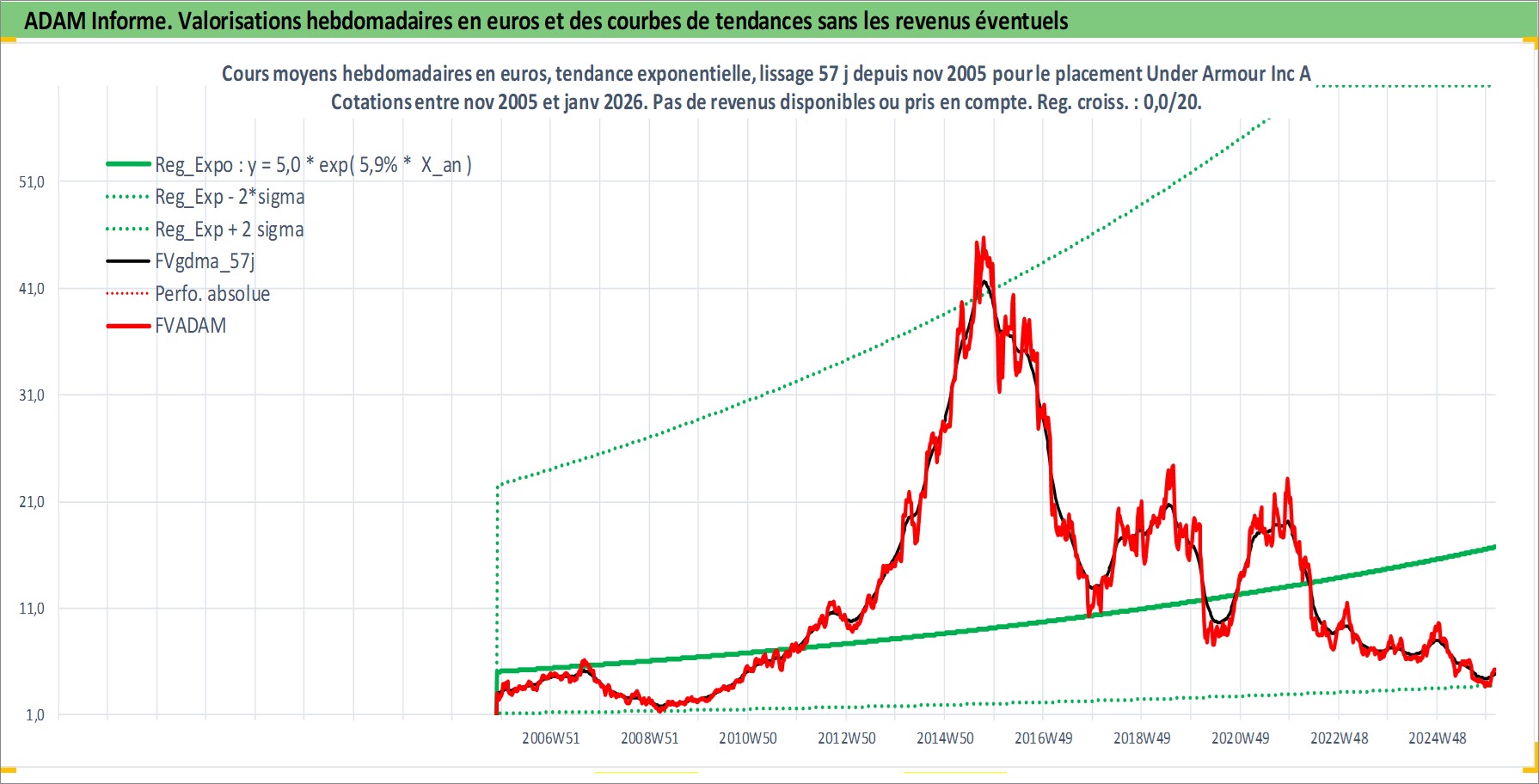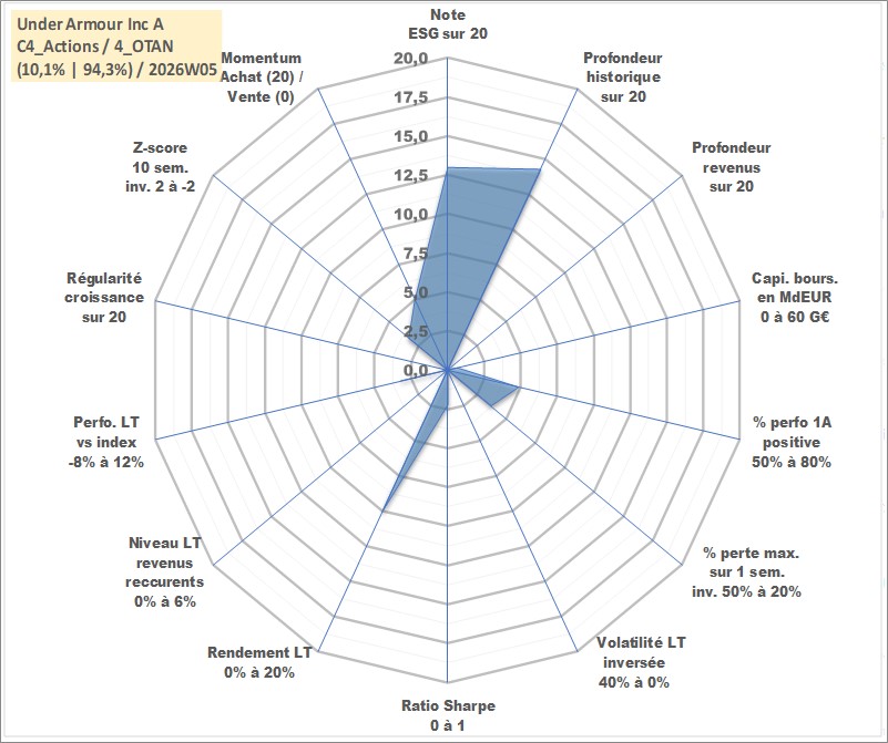 Site dédié aux investisseursPage dédiée sur site financeAnalyse des valorisations hebdomadaires de l'action Under Armour Inc A. Cet actif est cote en USD. Les valorisations sont en contrevaleur EURO et couvrent les semaines 2005W46 a 2026W05. Les revenus de cet actif financier ne sont pas connus car non existants ou non disponibles sur le site Yahoo Finance. La note globale ESG de cet actif est estimee a 13.0 (apres rebasage entre 0 et 20).