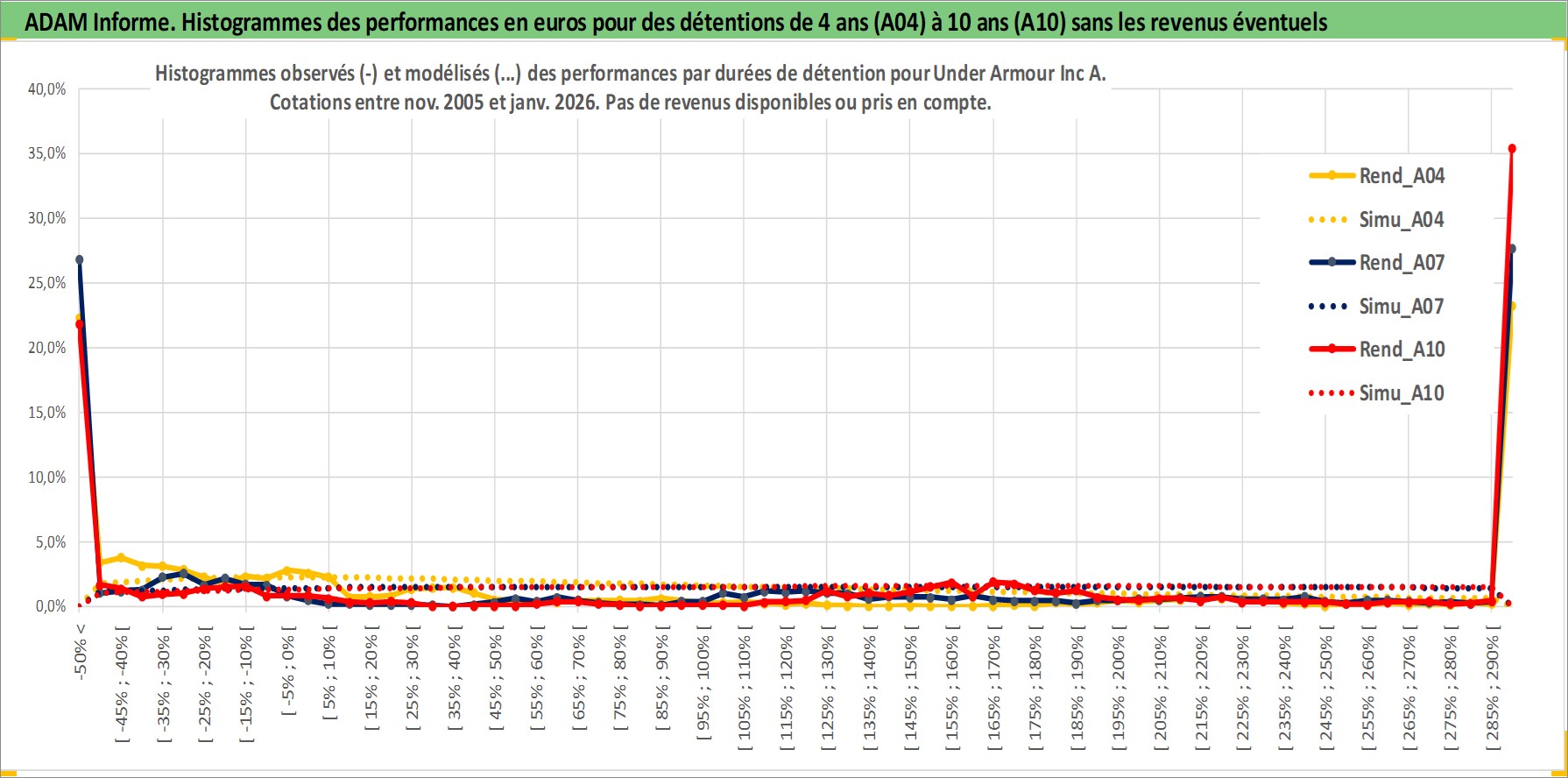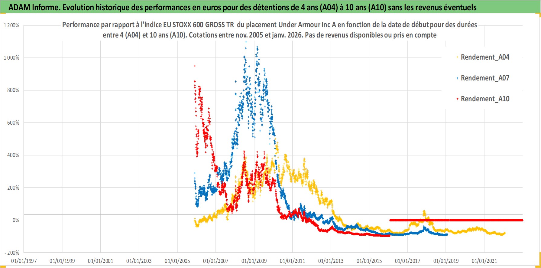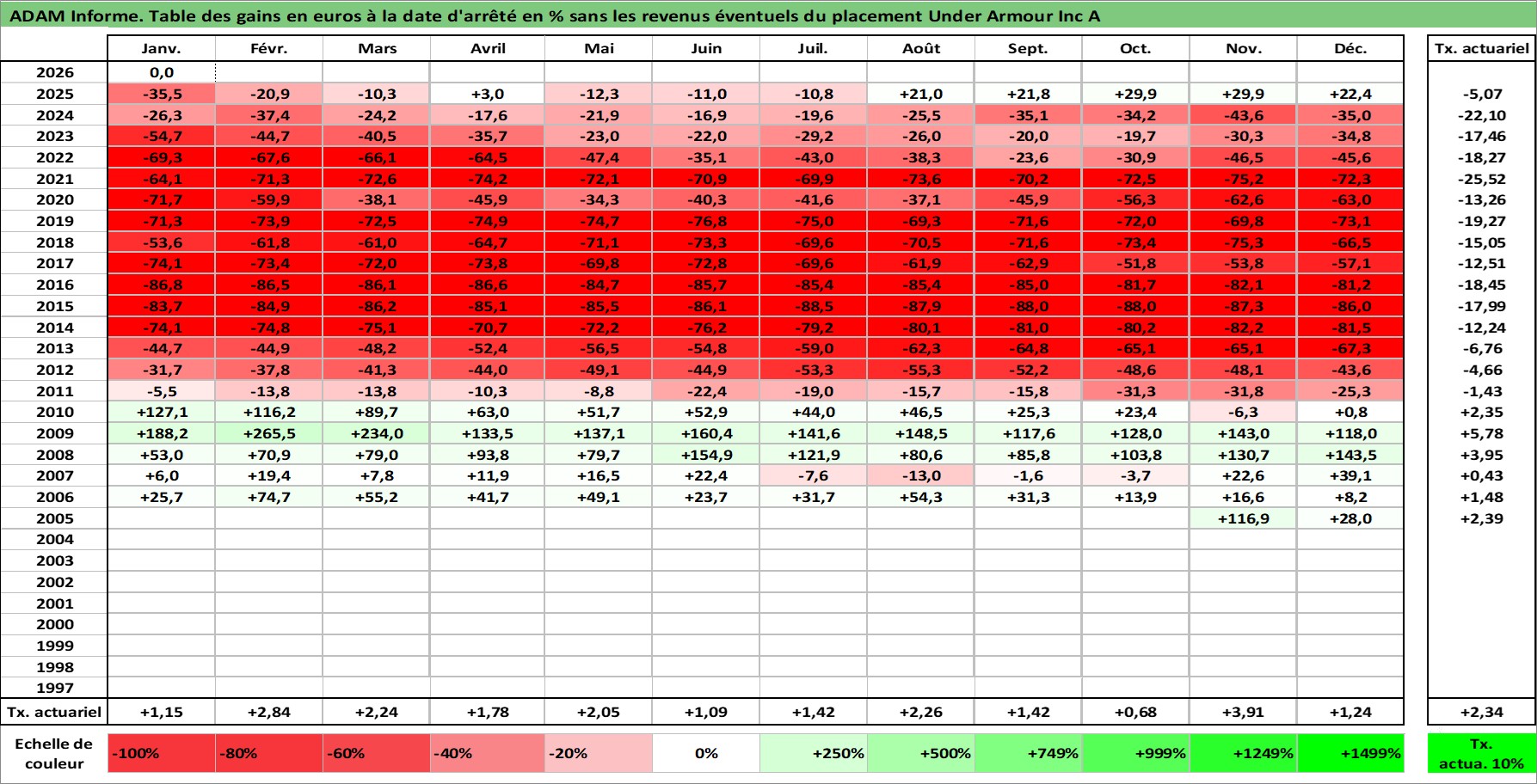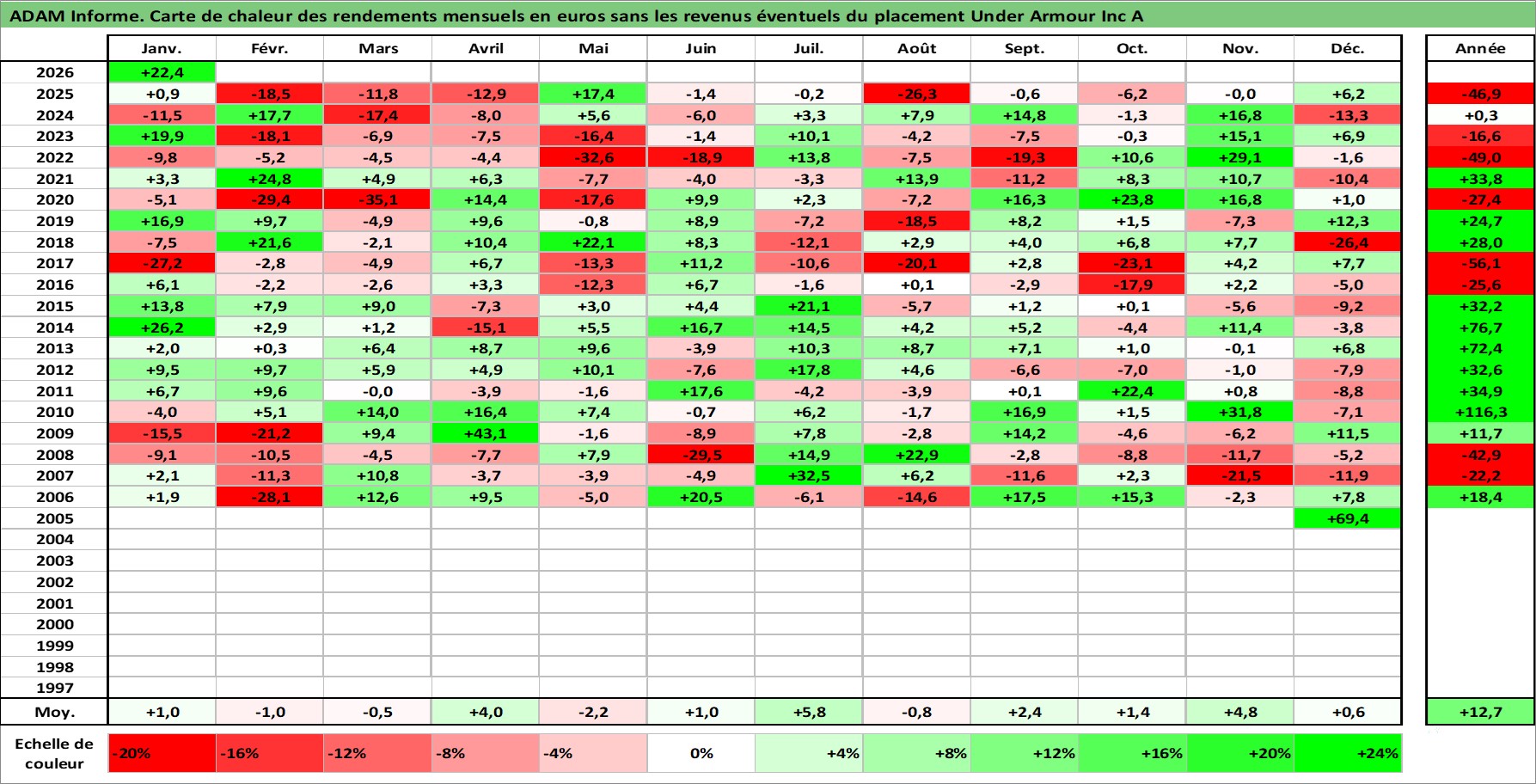 Site dédié aux investisseursPage dédiée sur site financeAnalyse des valorisations hebdomadaires de l'action Under Armour Inc A. Cet actif est cote en USD. Les valorisations sont en contrevaleur EURO et couvrent les semaines 2005W46 a 2026W05. Les revenus de cet actif financier ne sont pas connus car non existants ou non disponibles sur le site Yahoo Finance. La note globale ESG de cet actif est estimee a 13.0 (apres rebasage entre 0 et 20).