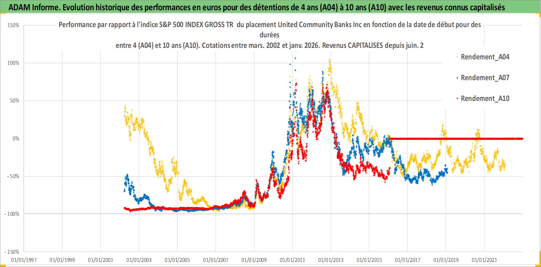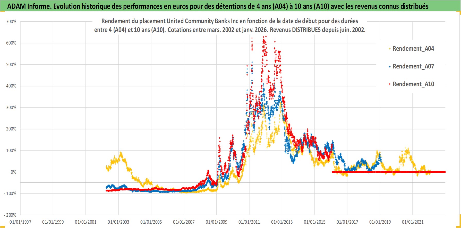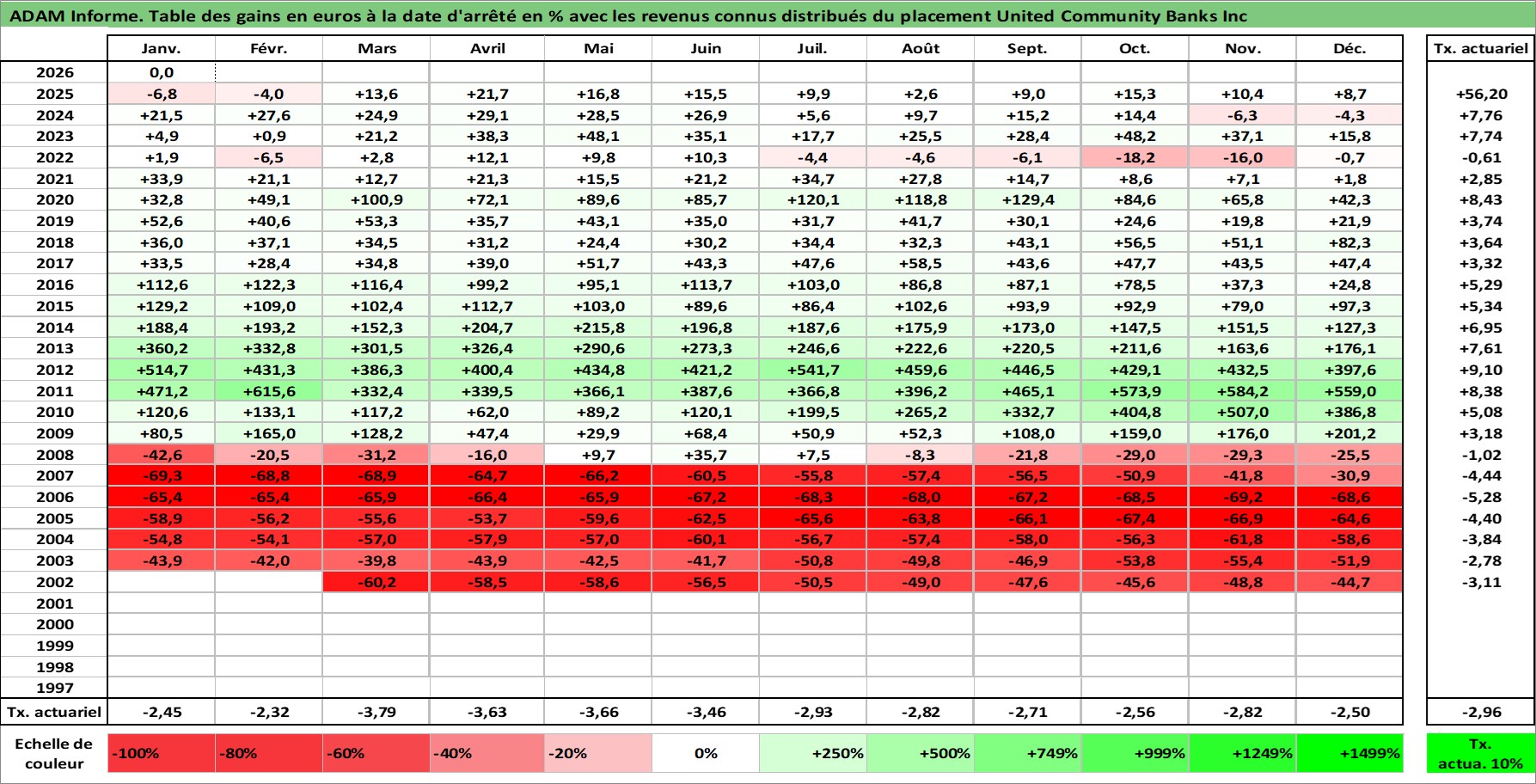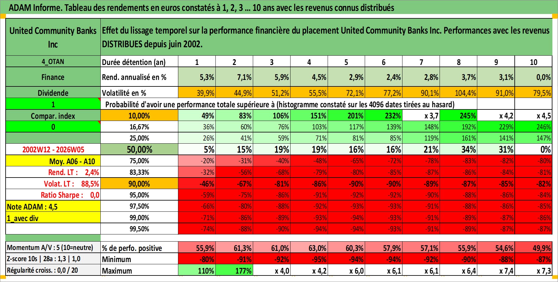 Site dédié aux investisseursPage dédiée sur site financeAnalyse des valorisations hebdomadaires de l'action United Community Banks Inc. Cet actif est cote en USD. Les valorisations sont en contrevaleur EURO et couvrent les semaines 2002W12 a 2026W05. Les revenus de cet actif financier sont pris en compte depuis la semaine 2002W24. La note ESG de cet actif n'est pas connue.