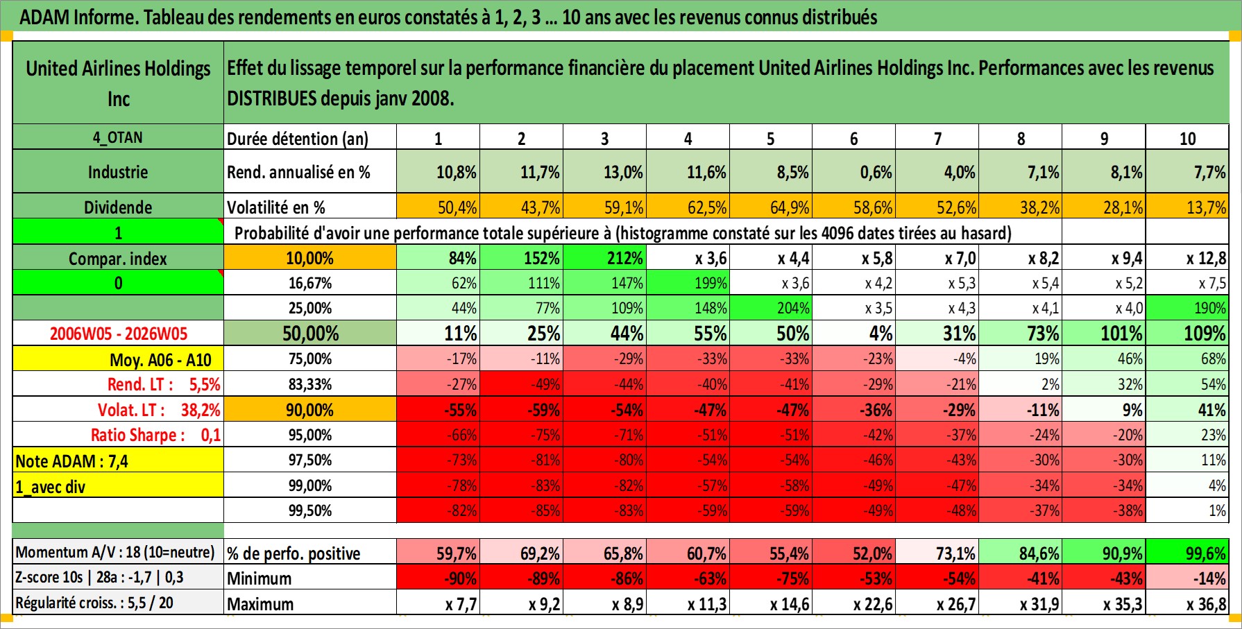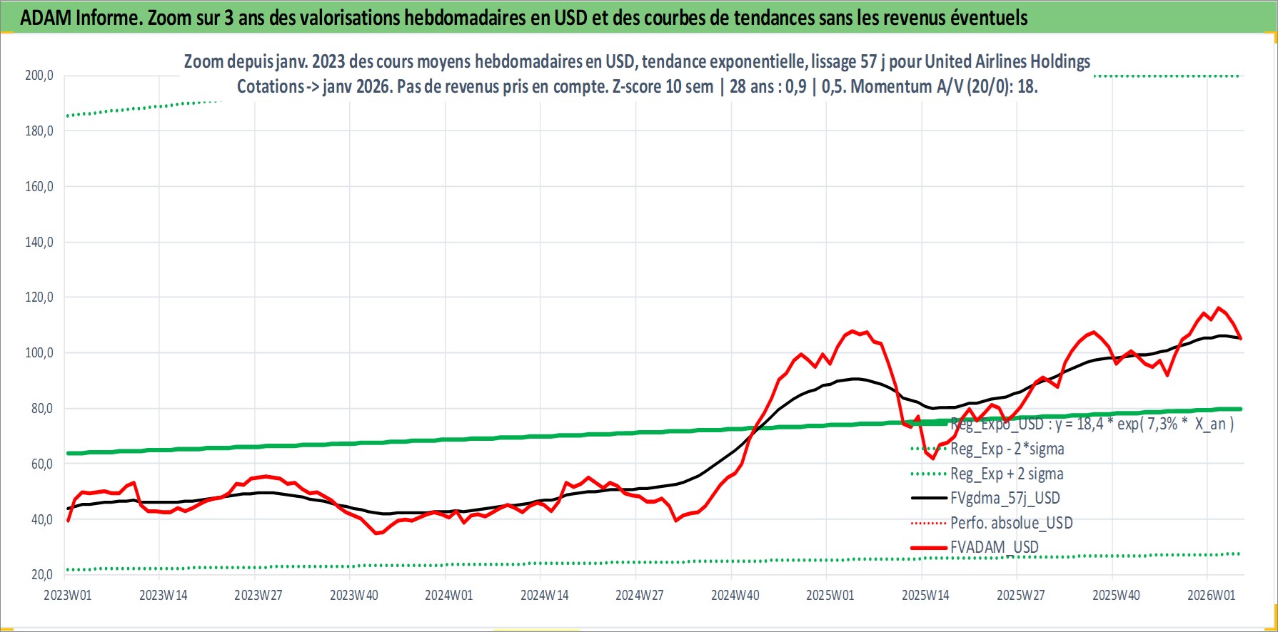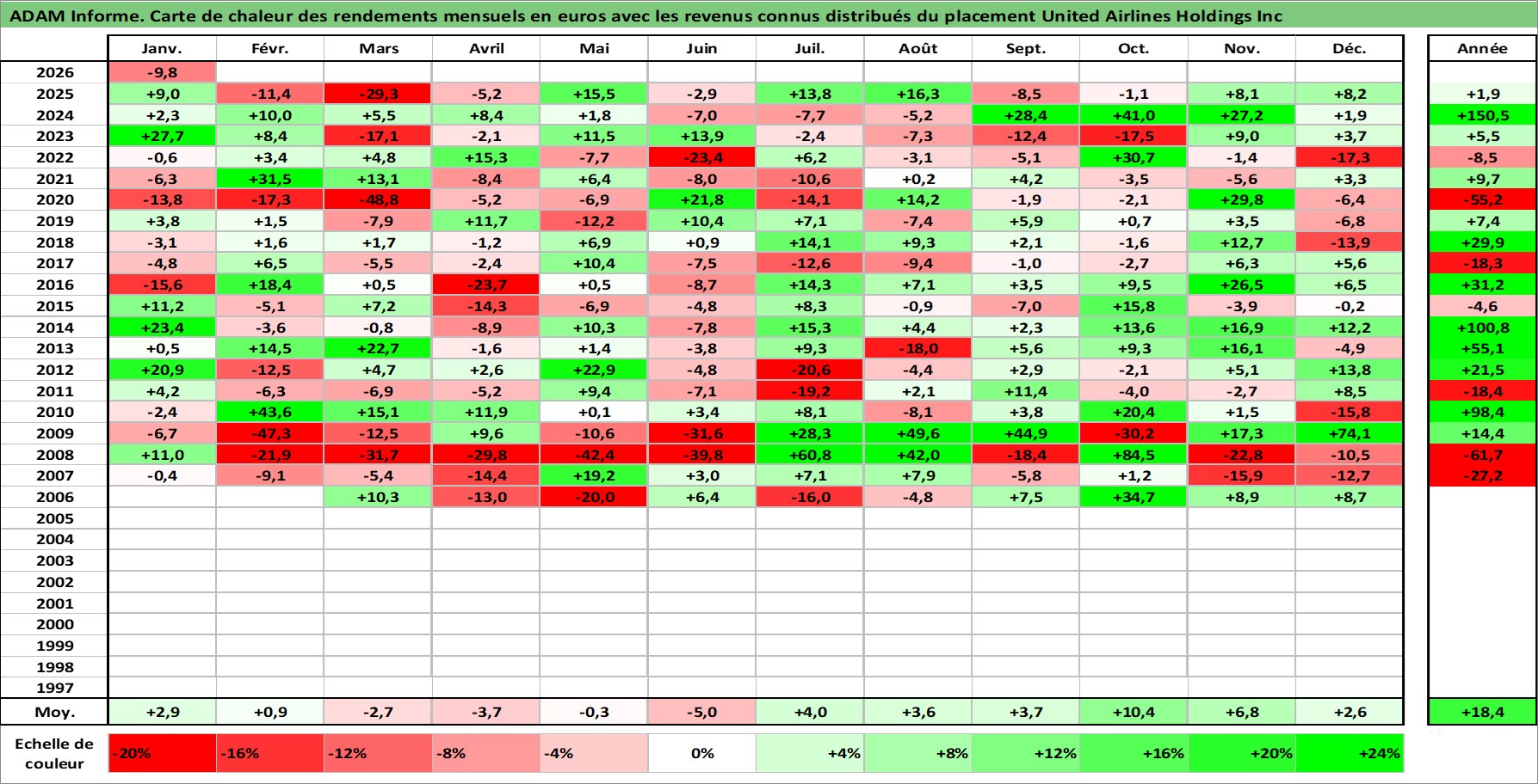 Site dédié aux investisseursPage dédiée sur site financeAnalyse des valorisations hebdomadaires de l'action United Airlines Holdings Inc. Cet actif est cote en USD. Les valorisations sont en contrevaleur EURO et couvrent les semaines 2006W05 a 2026W05. Les revenus de cet actif financier sont pris en compte depuis la semaine 2008W02. La note globale ESG de cet actif est estimee a 6.0 (apres rebasage entre 0 et 20).