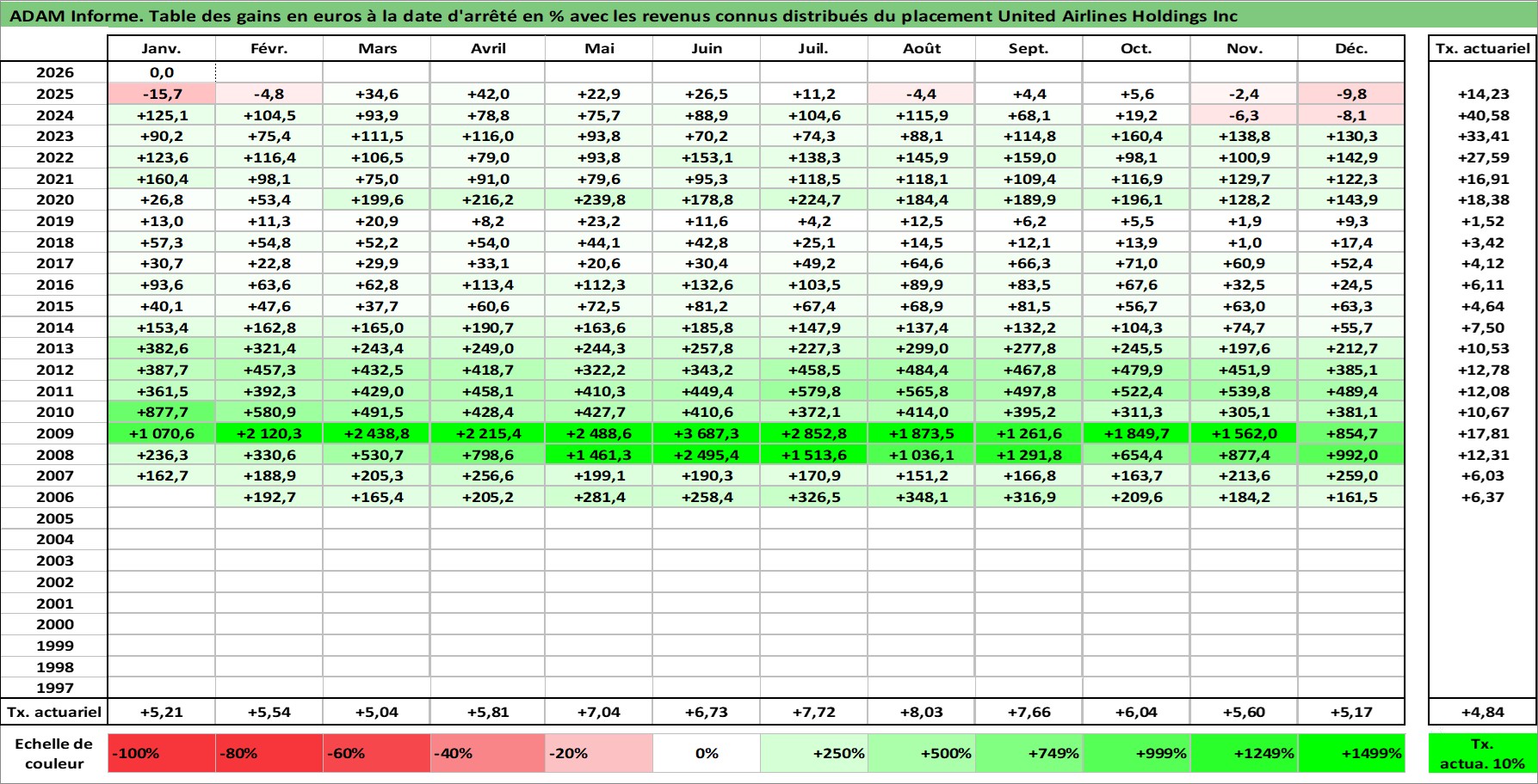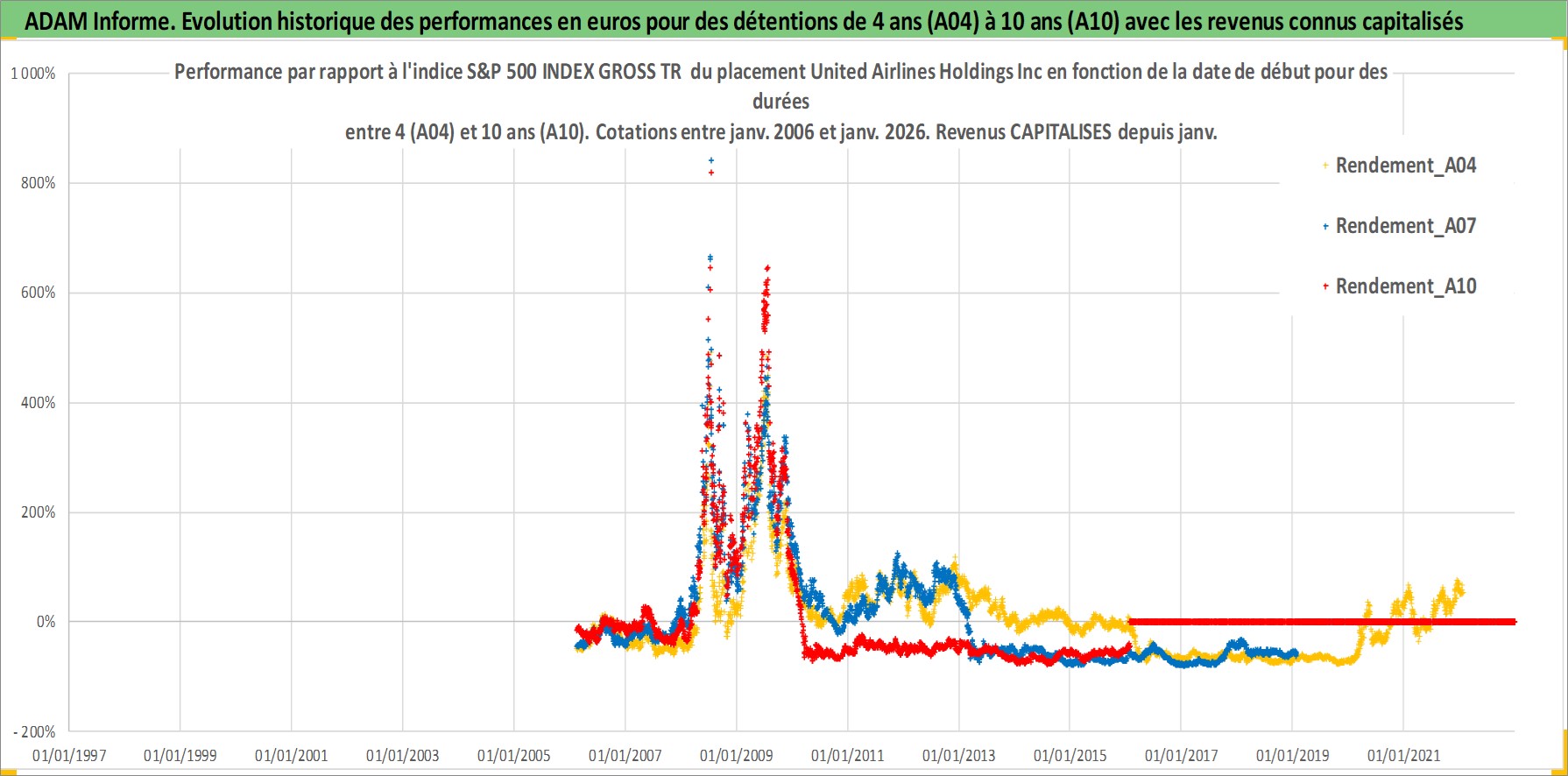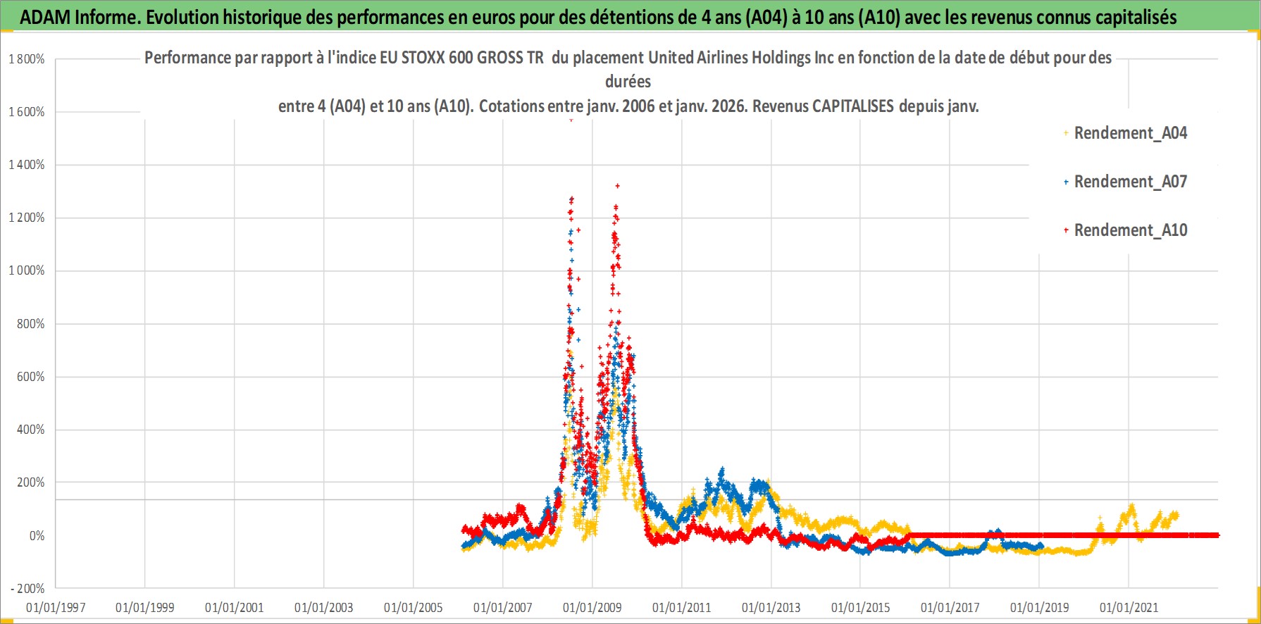 Site dédié aux investisseursPage dédiée sur site financeAnalyse des valorisations hebdomadaires de l'action United Airlines Holdings Inc. Cet actif est cote en USD. Les valorisations sont en contrevaleur EURO et couvrent les semaines 2006W05 a 2026W05. Les revenus de cet actif financier sont pris en compte depuis la semaine 2008W02. La note globale ESG de cet actif est estimee a 6.0 (apres rebasage entre 0 et 20).