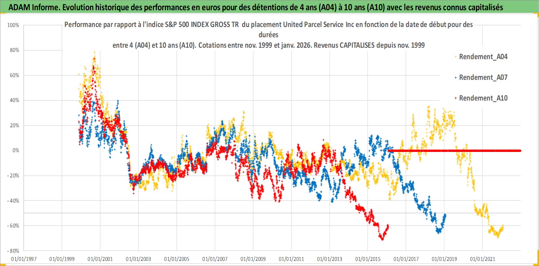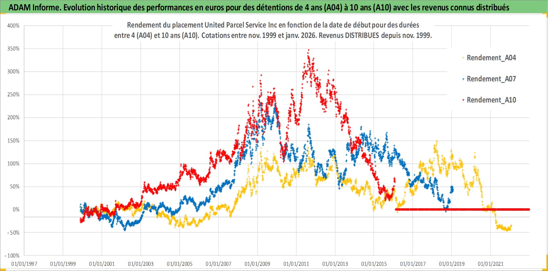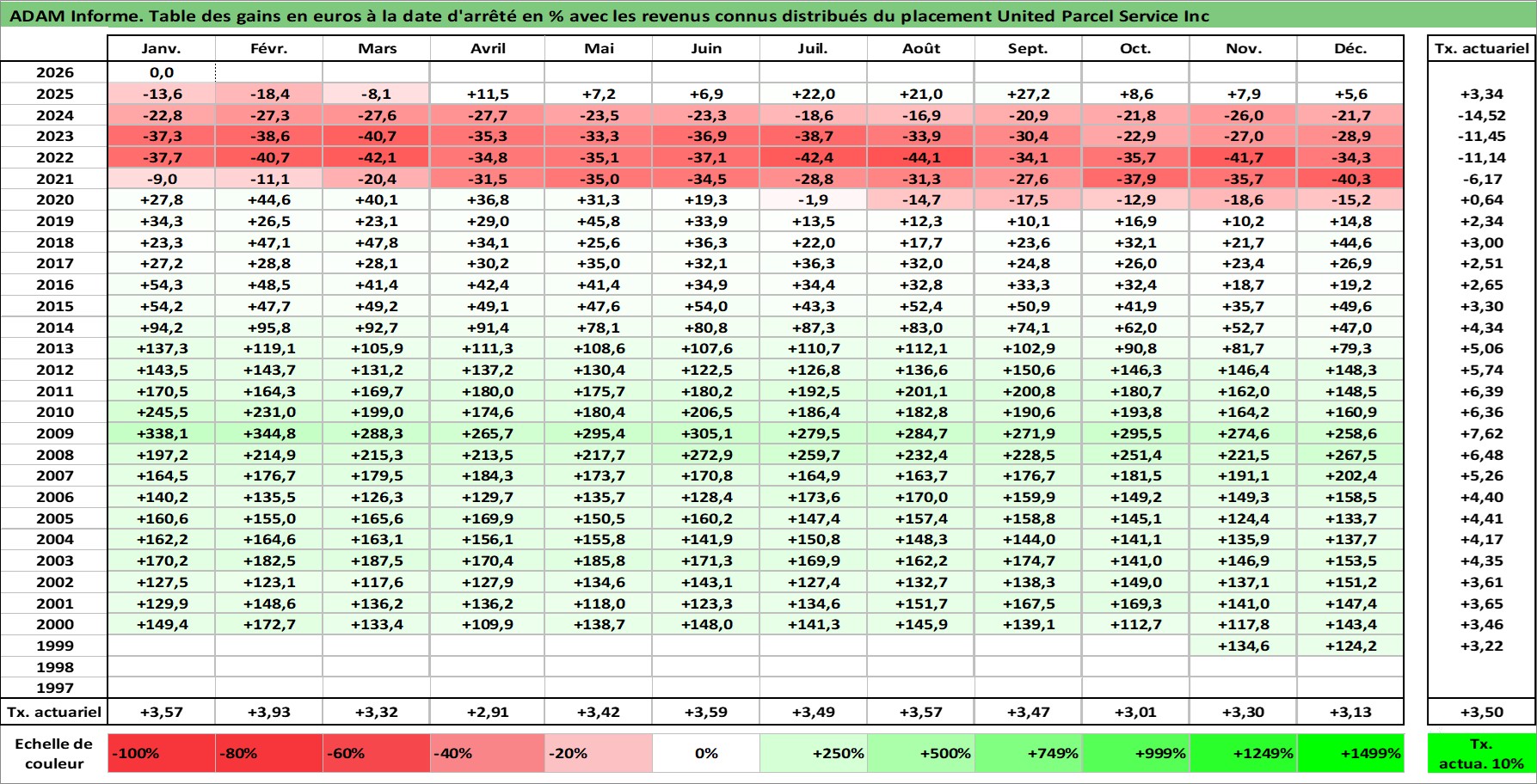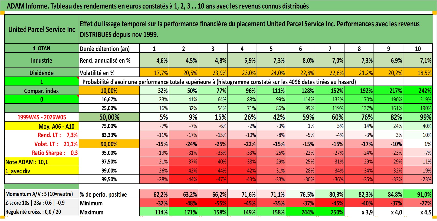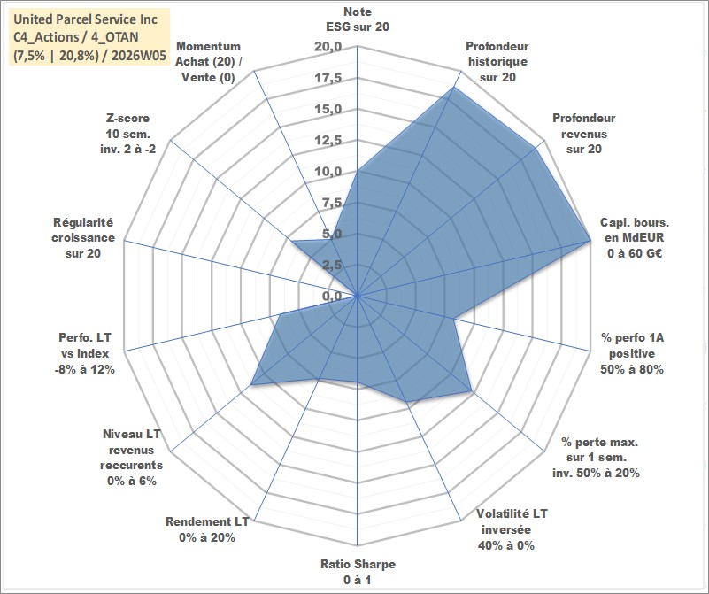 Site dédié aux investisseursPage dédiée sur site financeAnalyse des valorisations hebdomadaires de l'action United Parcel Service Inc. Cet actif est cote en USD. Les valorisations sont en contrevaleur EURO et couvrent les semaines 1999W45 a 2026W05. Les revenus de cet actif financier sont pris en compte depuis la semaine 1999W47. La note globale ESG de cet actif est estimee a 10.0 (apres rebasage entre 0 et 20).