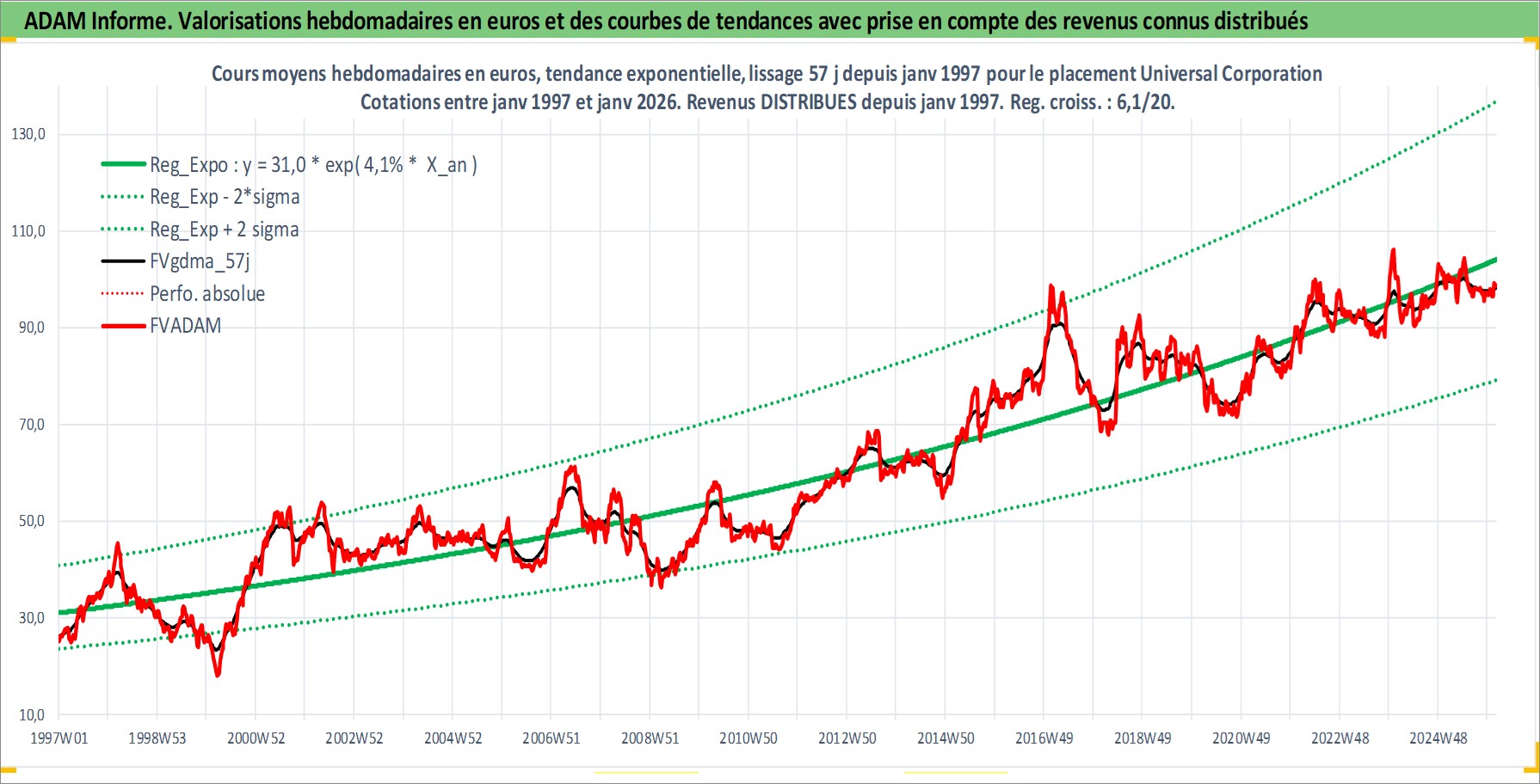 Site dédié aux investisseursPage dédiée sur site financeAnalyse des valorisations hebdomadaires de l'action Universal Corporation. Cet actif est cote en USD. Les valorisations sont en contrevaleur EURO et couvrent les semaines 1997W01 a 2026W05. Les revenus de cet actif financier sont pris en compte depuis la semaine 1997W02. La note ESG de cet actif n'est pas connue.