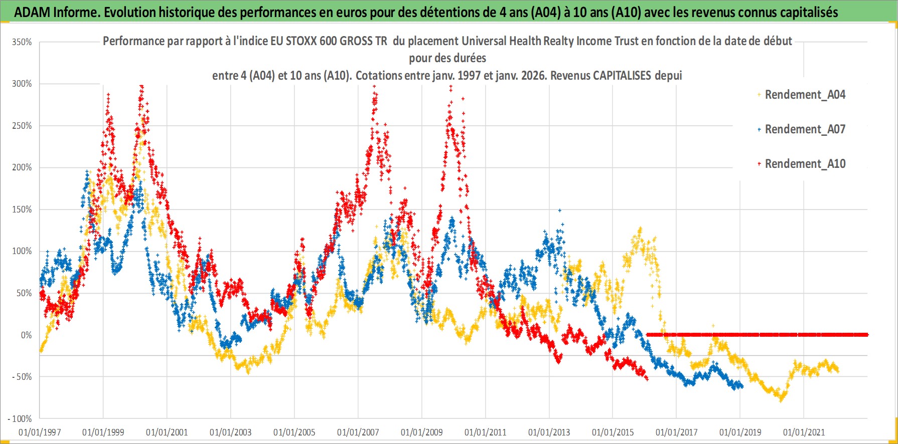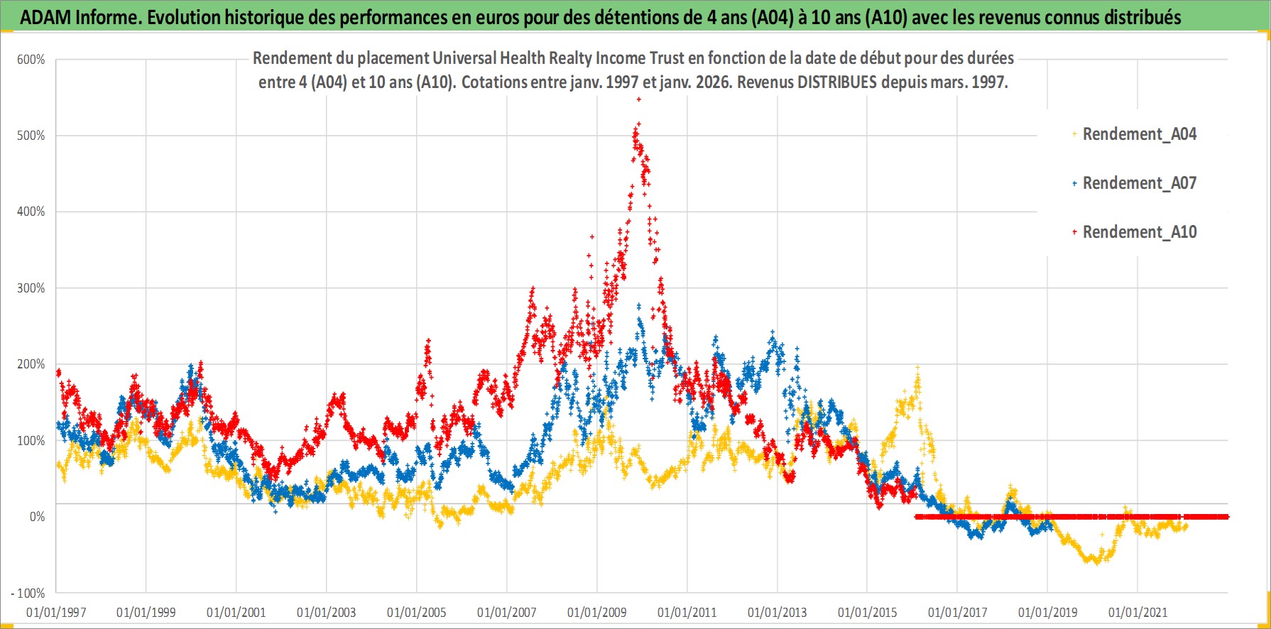 Site dédié aux investisseursPage dédiée sur site financeAnalyse des valorisations hebdomadaires de l'action Universal Health Realty Income Trust. Cet actif est cote en USD. Les valorisations sont en contrevaleur EURO et couvrent les semaines 1997W01 a 2026W05. Les revenus de cet actif financier sont pris en compte depuis la semaine 1997W11. La note ESG de cet actif n'est pas connue.