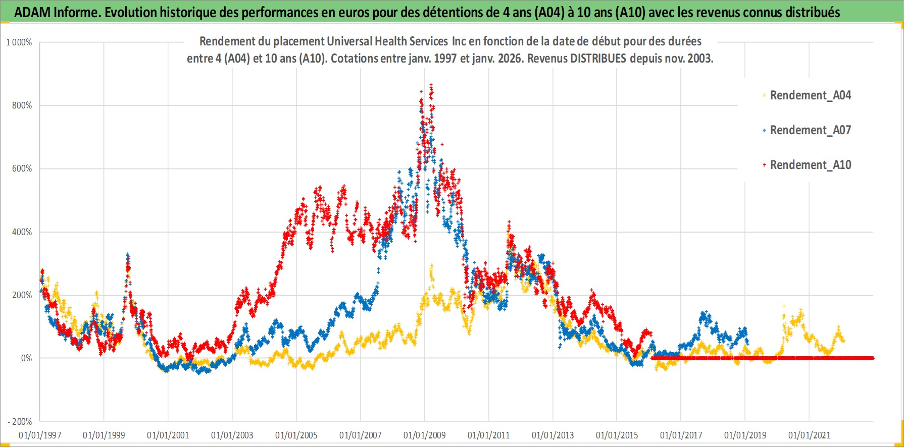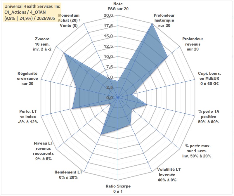 Site dédié aux investisseursPage dédiée sur site financeAnalyse des valorisations hebdomadaires de l'action Universal Health Services Inc. Cet actif est cote en USD. Les valorisations sont en contrevaleur EURO et couvrent les semaines 1997W01 a 2026W05. Les revenus de cet actif financier sont pris en compte depuis la semaine 2003W48. La note globale ESG de cet actif est estimee a 4.0 (apres rebasage entre 0 et 20).