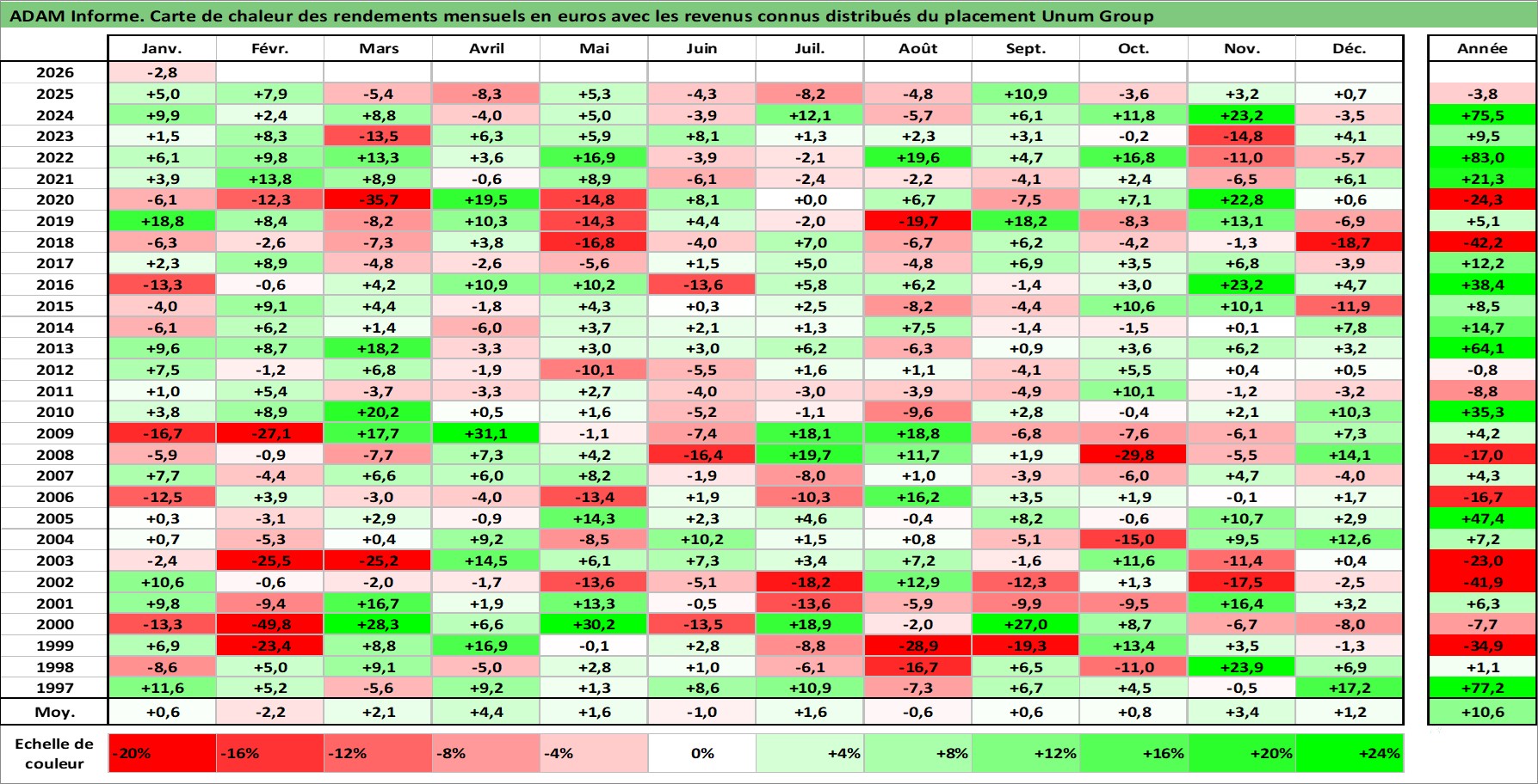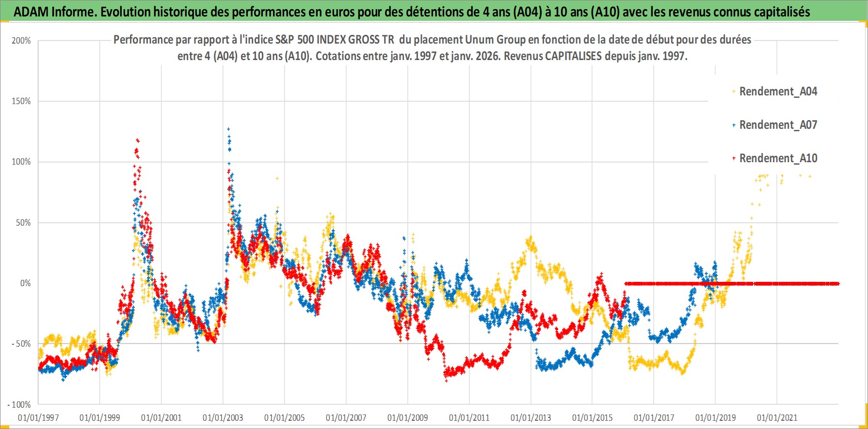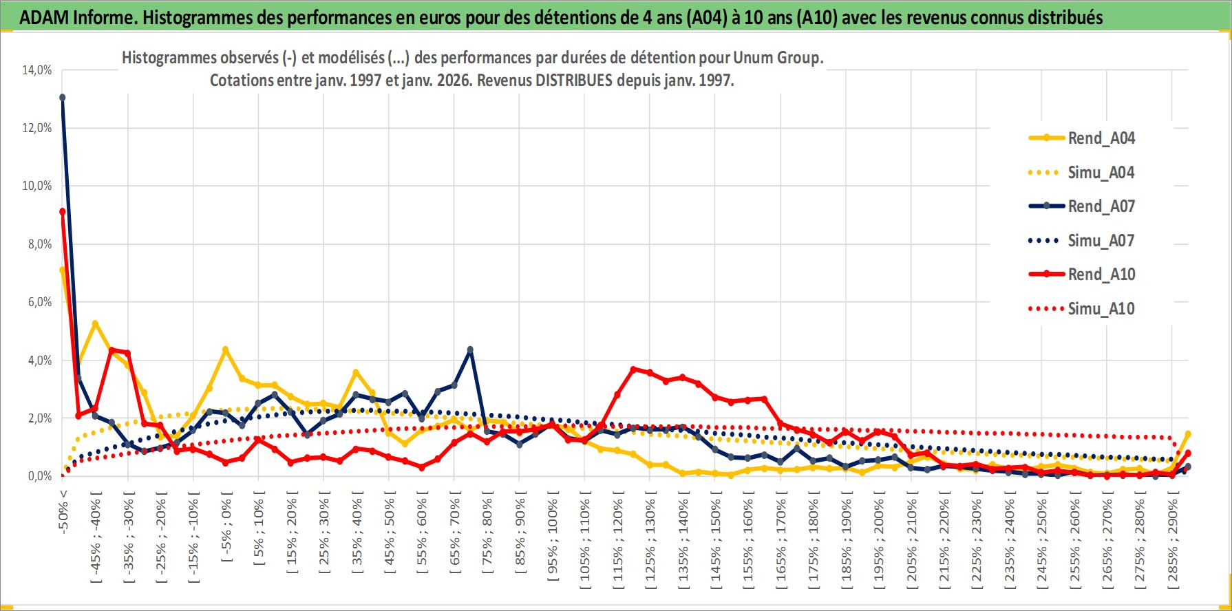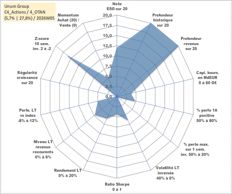 Site dédié aux investisseursPage dédiée sur site financeAnalyse des valorisations hebdomadaires de l'action Unum Group. Cet actif est cote en USD. Les valorisations sont en contrevaleur EURO et couvrent les semaines 1997W01 a 2026W05. Les revenus de cet actif financier sont pris en compte depuis la semaine 1997W04. La note globale ESG de cet actif est estimee a 12.0 (apres rebasage entre 0 et 20).