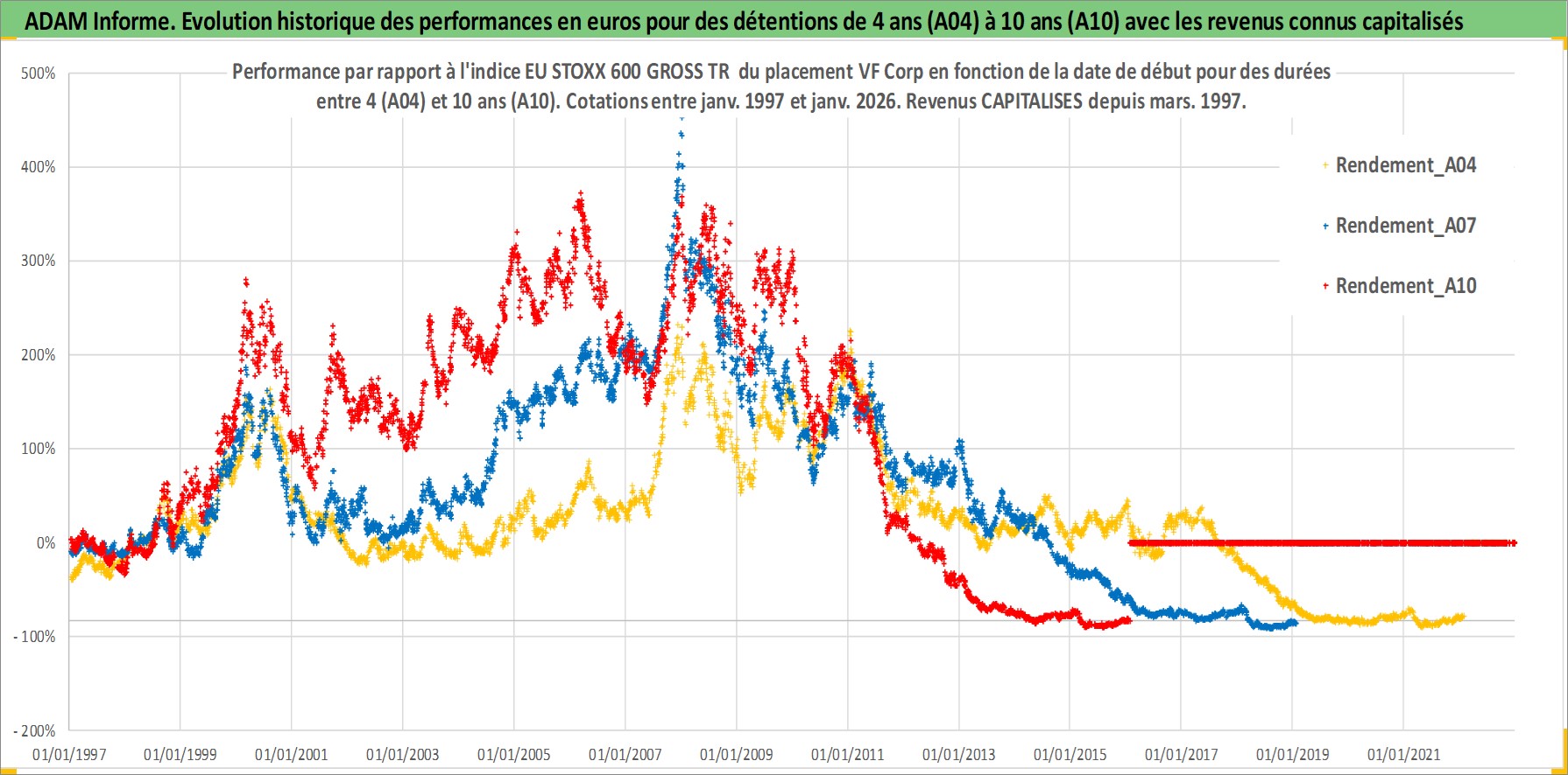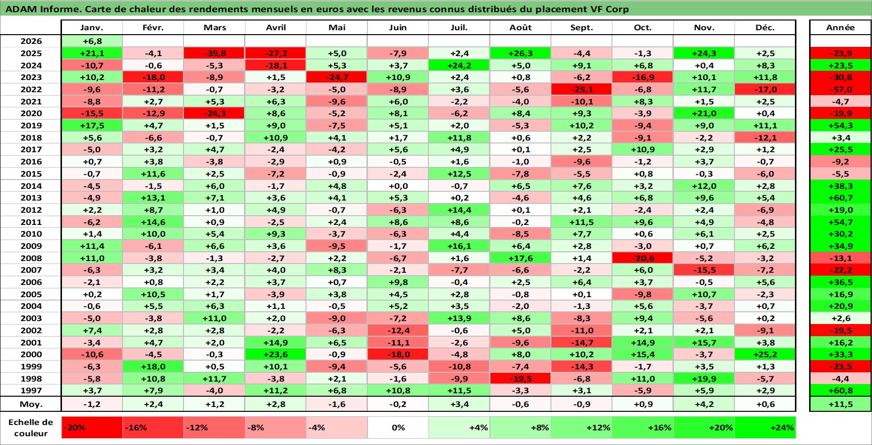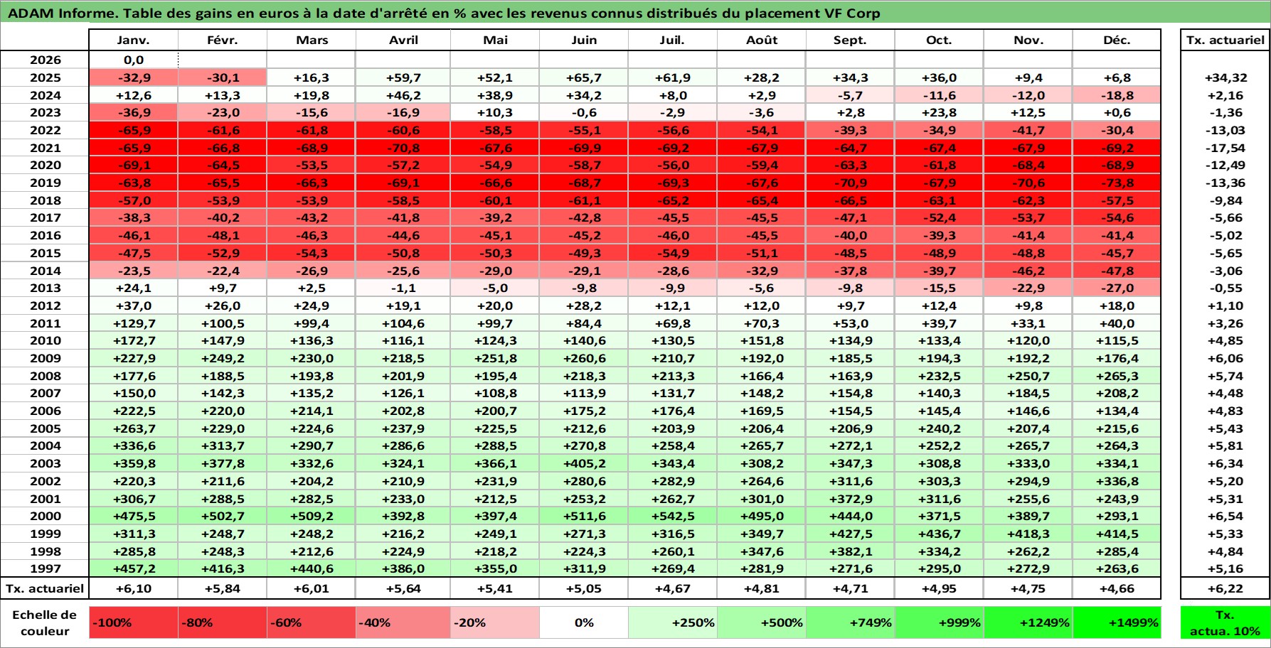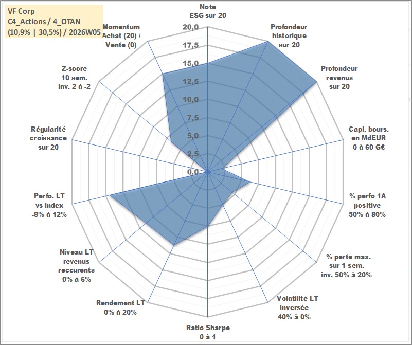 Site dédié aux investisseursPage dédiée sur site financeAnalyse des valorisations hebdomadaires de l'action VF Corp. Cet actif est cote en USD. Les valorisations sont en contrevaleur EURO et couvrent les semaines 1997W01 a 2026W05. Les revenus de cet actif financier sont pris en compte depuis la semaine 1997W10. La note globale ESG de cet actif est estimee a 15.0 (apres rebasage entre 0 et 20).