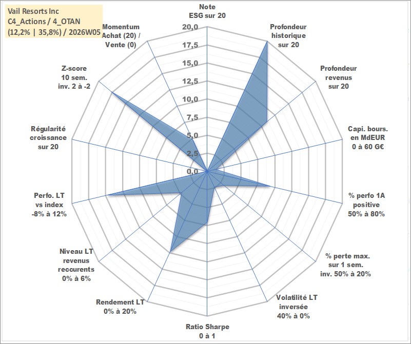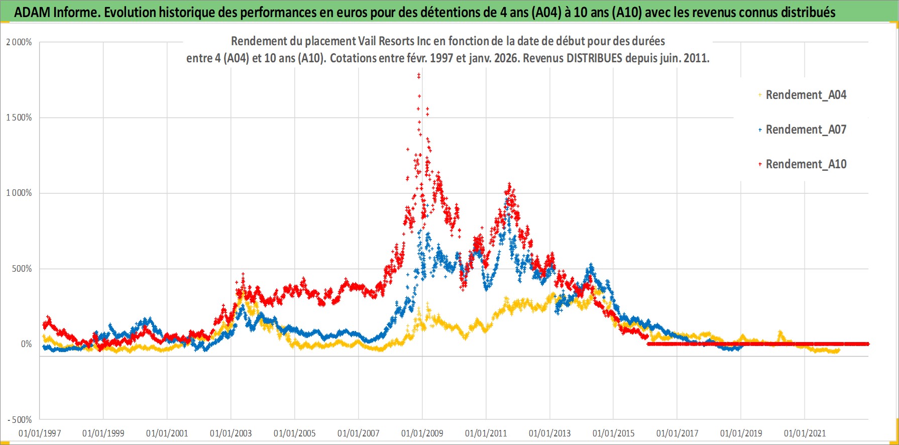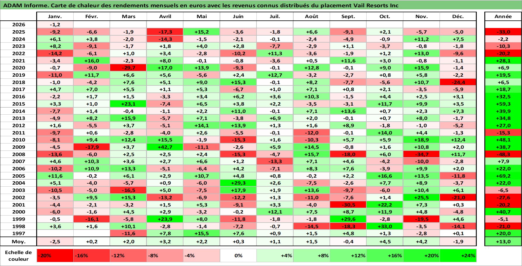 Site dédié aux investisseursPage dédiée sur site financeAnalyse des valorisations hebdomadaires de l'action Vail Resorts Inc. Cet actif est cote en USD. Les valorisations sont en contrevaleur EURO et couvrent les semaines 1997W06 a 2026W05. Les revenus de cet actif financier sont pris en compte depuis la semaine 2011W26. La note ESG de cet actif n'est pas connue.
