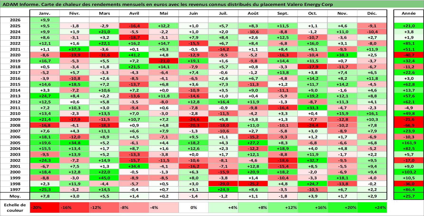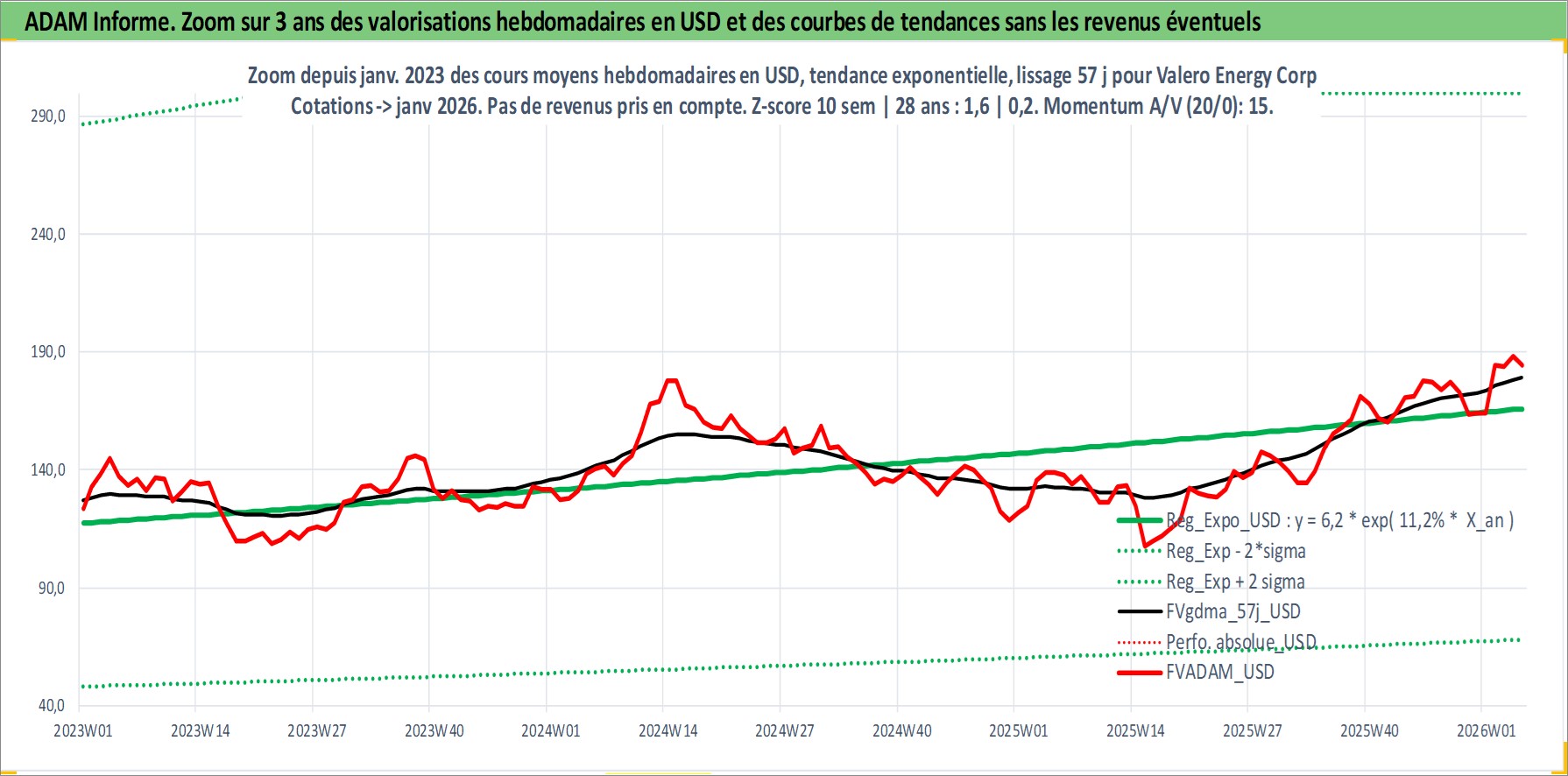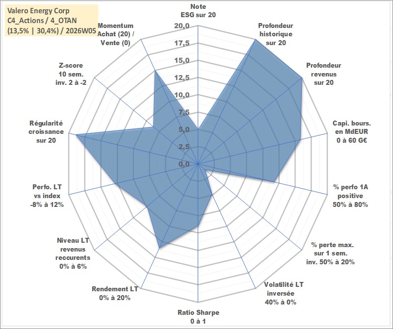 Site dédié aux investisseursPage dédiée sur site financeAnalyse des valorisations hebdomadaires de l'action Valero Energy Corp. Cet actif est cote en USD. Les valorisations sont en contrevaleur EURO et couvrent les semaines 1997W01 a 2026W05. Les revenus de cet actif financier sont pris en compte depuis la semaine 1997W06. La note globale ESG de cet actif est estimee a 5.0 (apres rebasage entre 0 et 20).