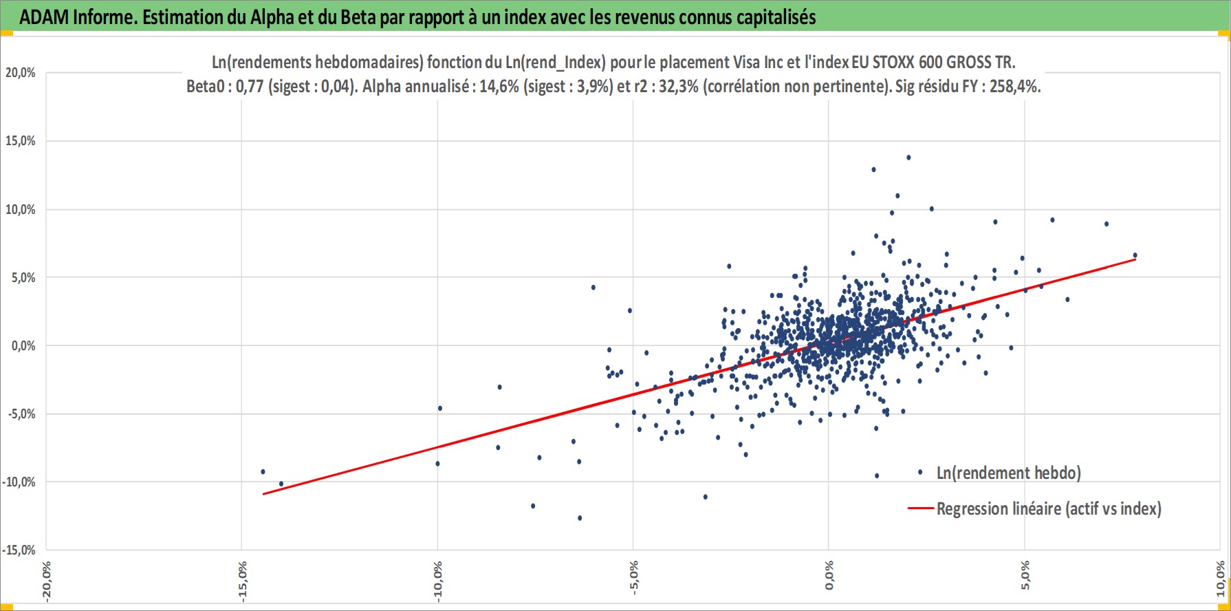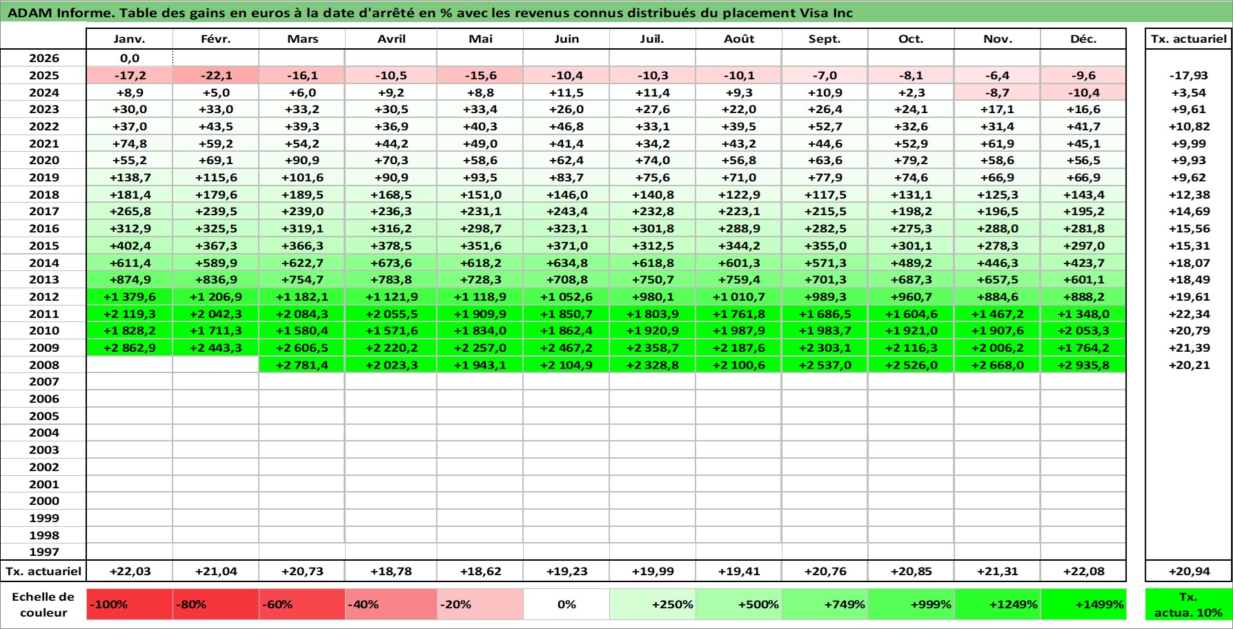 Site dédié aux investisseursPage dédiée sur site financeAnalyse des valorisations hebdomadaires de l'action Visa Inc. Cet actif est cote en USD. Les valorisations sont en contrevaleur EURO et couvrent les semaines 2008W12 a 2026W05. Les revenus de cet actif financier sont pris en compte depuis la semaine 2008W33. La note globale ESG de cet actif est estimee a 13.0 (apres rebasage entre 0 et 20).