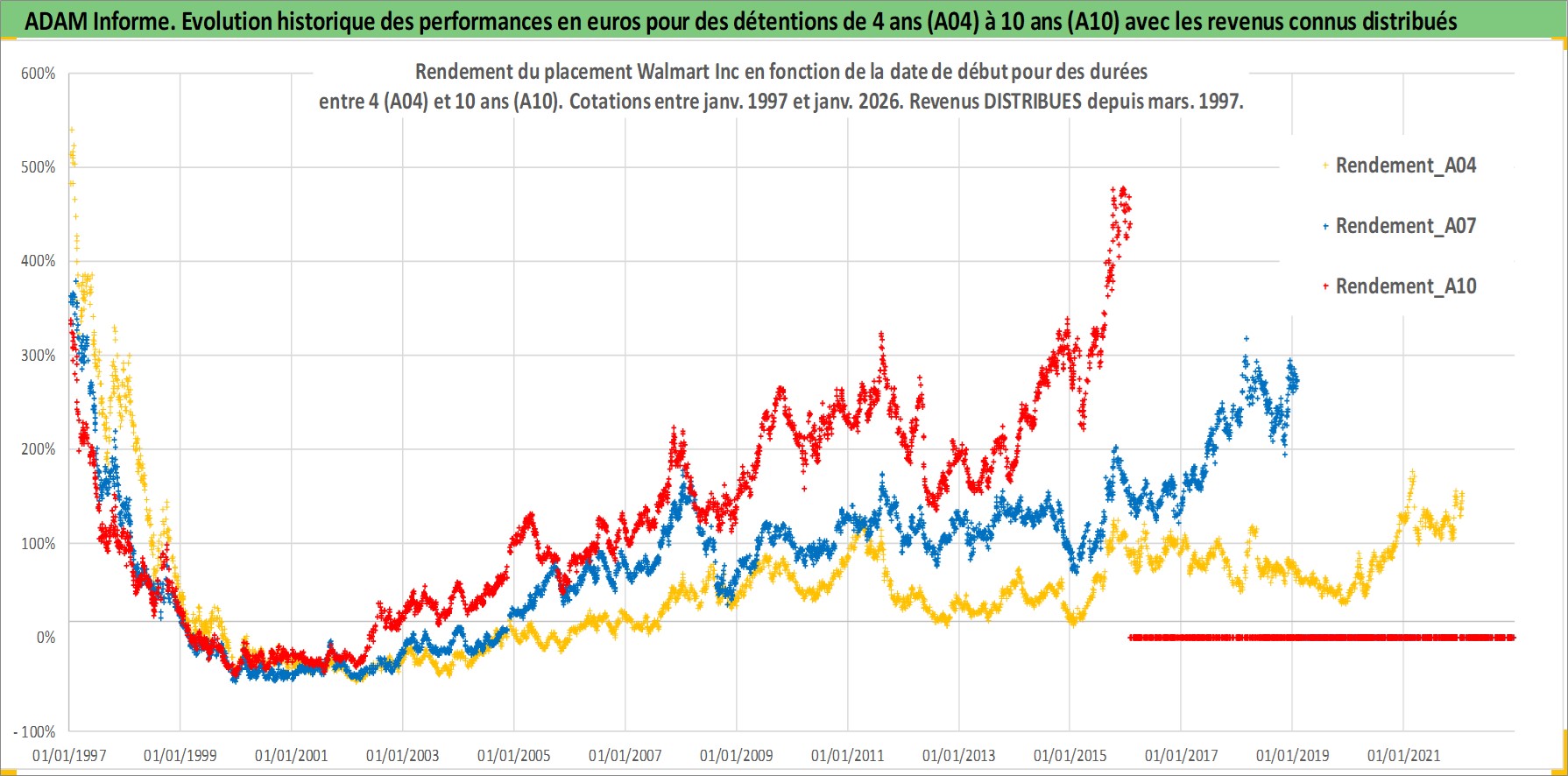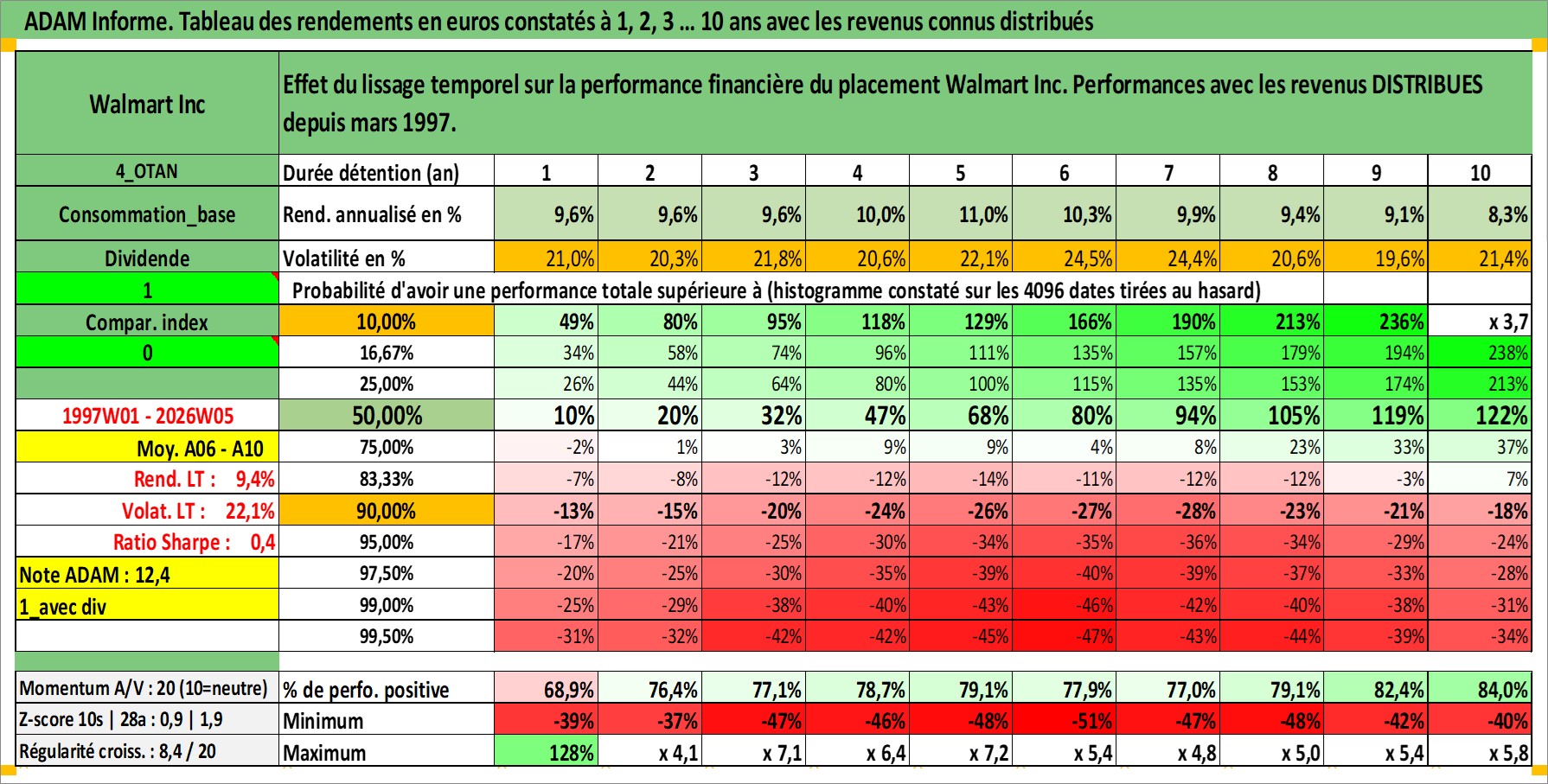 Site dédié aux investisseursPage dédiée sur site financeAnalyse des valorisations hebdomadaires de l'action Walmart Inc. Cet actif est cote en USD. Les valorisations sont en contrevaleur EURO et couvrent les semaines 1997W01 a 2026W05. Les revenus de cet actif financier sont pris en compte depuis la semaine 1997W12. La note globale ESG de cet actif est estimee a 7.0 (apres rebasage entre 0 et 20).