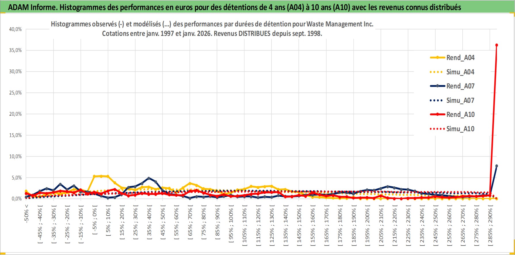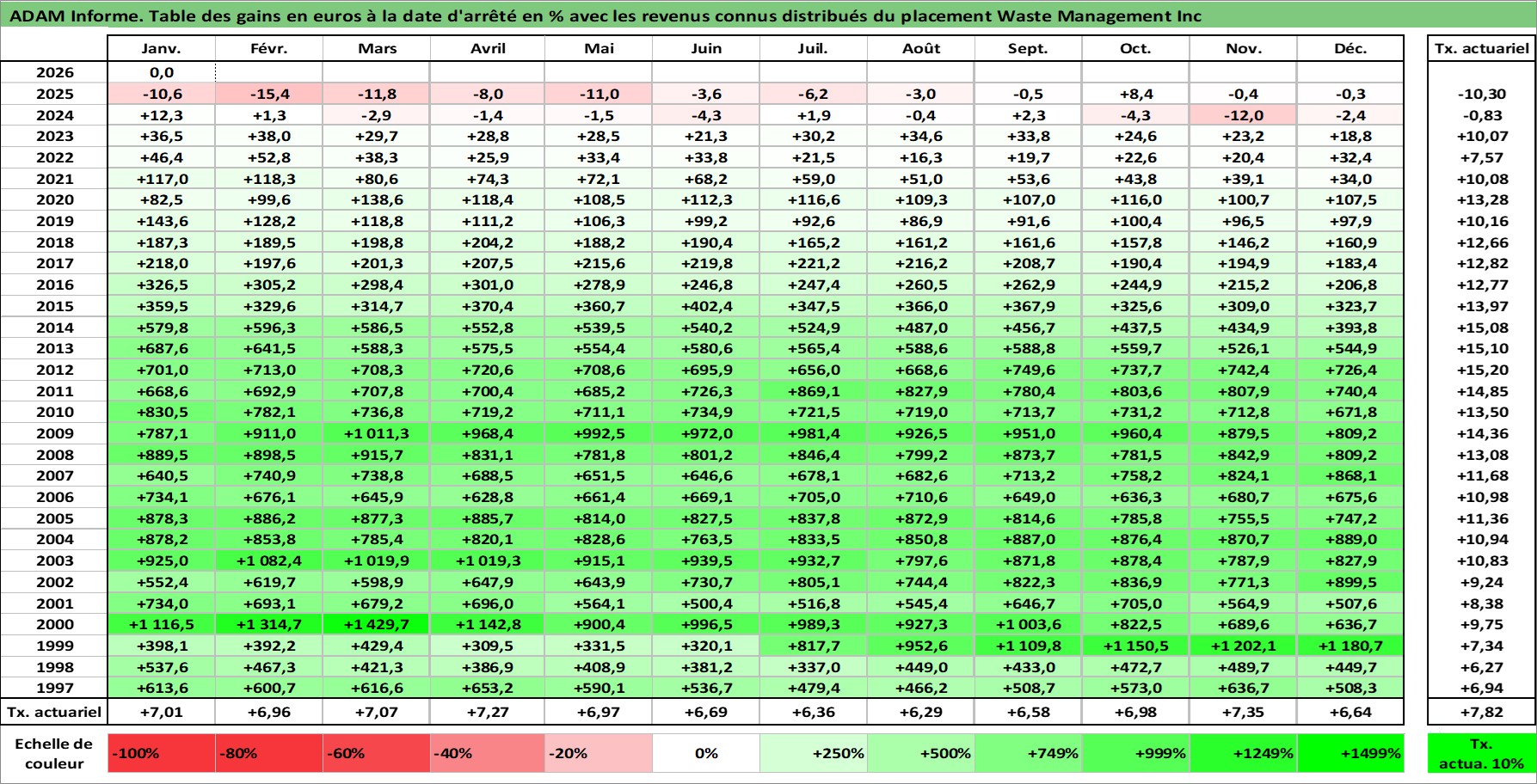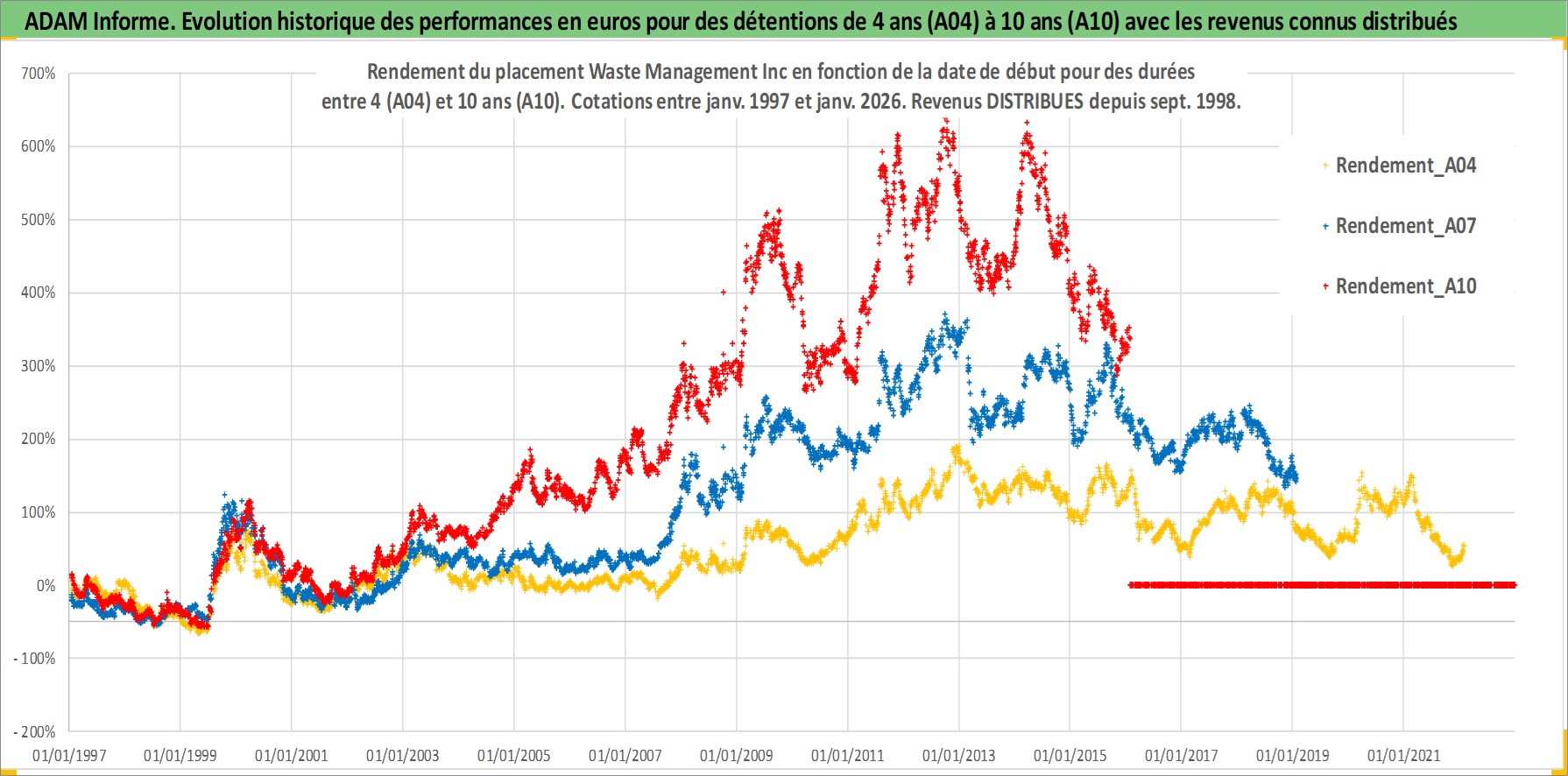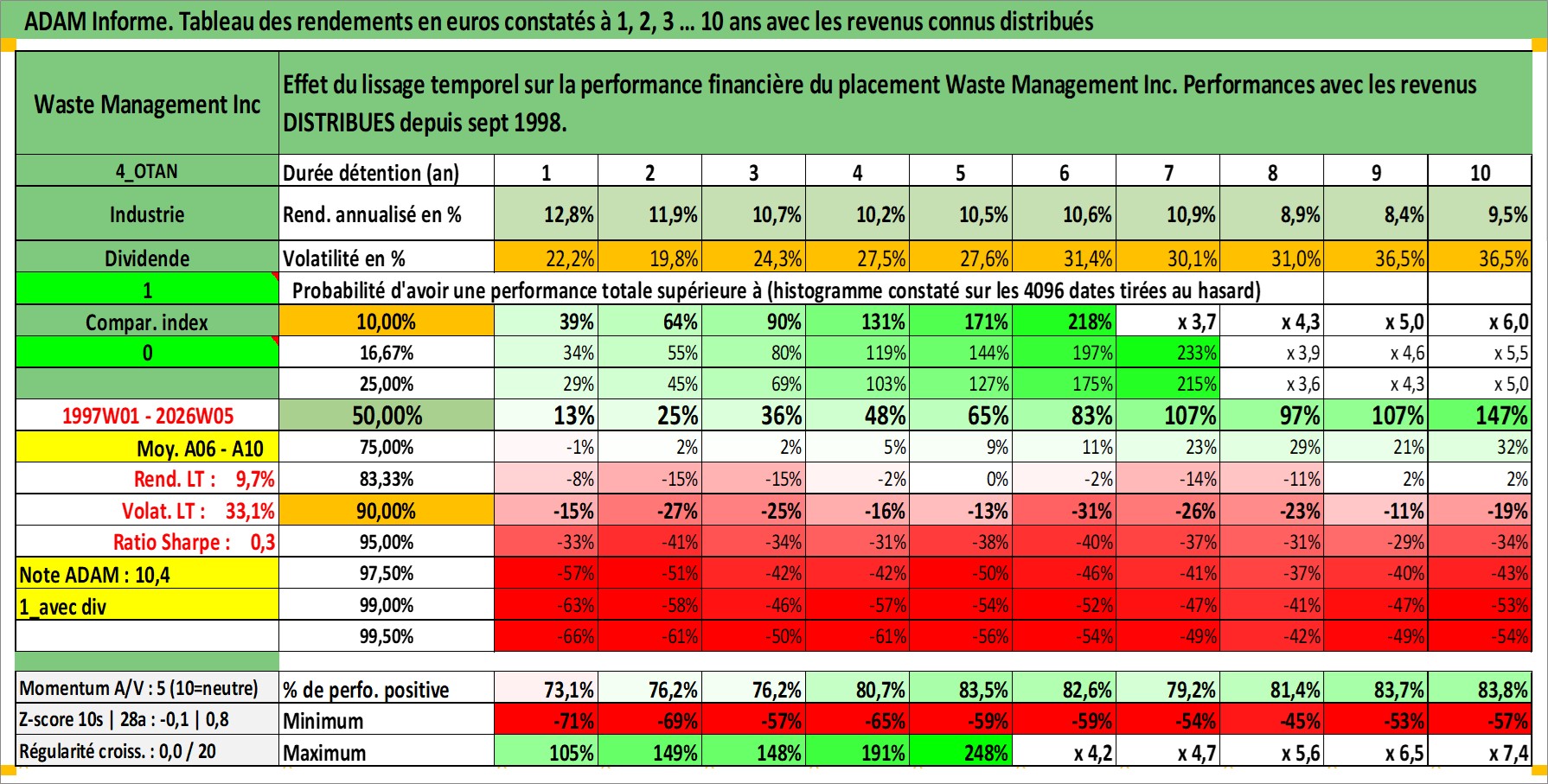 Site dédié aux investisseursPage dédiée sur site financeAnalyse des valorisations hebdomadaires de l'action Waste Management Inc. Cet actif est cote en USD. Les valorisations sont en contrevaleur EURO et couvrent les semaines 1997W01 a 2026W05. Les revenus de cet actif financier sont pris en compte depuis la semaine 1998W40. La note globale ESG de cet actif est estimee a 12.0 (apres rebasage entre 0 et 20).