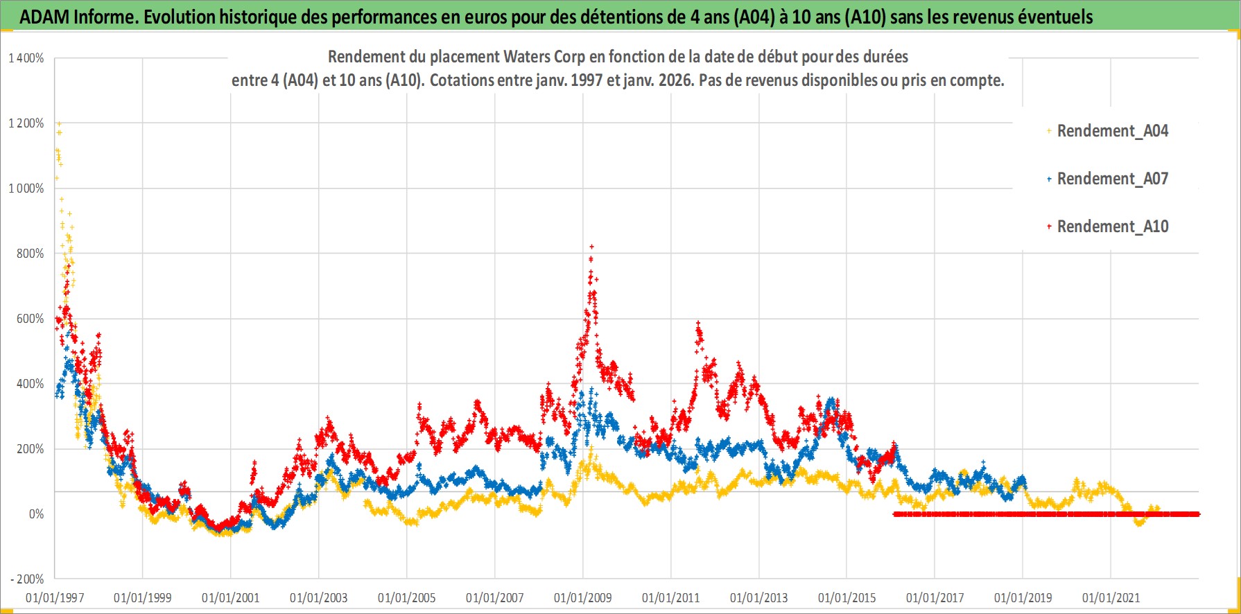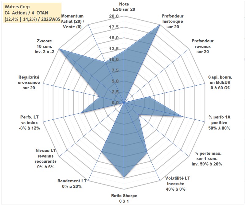 Site dédié aux investisseursPage dédiée sur site financeAnalyse des valorisations hebdomadaires de l'action Waters Corp. Cet actif est cote en USD. Les valorisations sont en contrevaleur EURO et couvrent les semaines 1997W01 a 2026W05. Les revenus de cet actif financier ne sont pas connus car non existants ou non disponibles sur le site Yahoo Finance. La note globale ESG de cet actif est estimee a 12.0 (apres rebasage entre 0 et 20).
