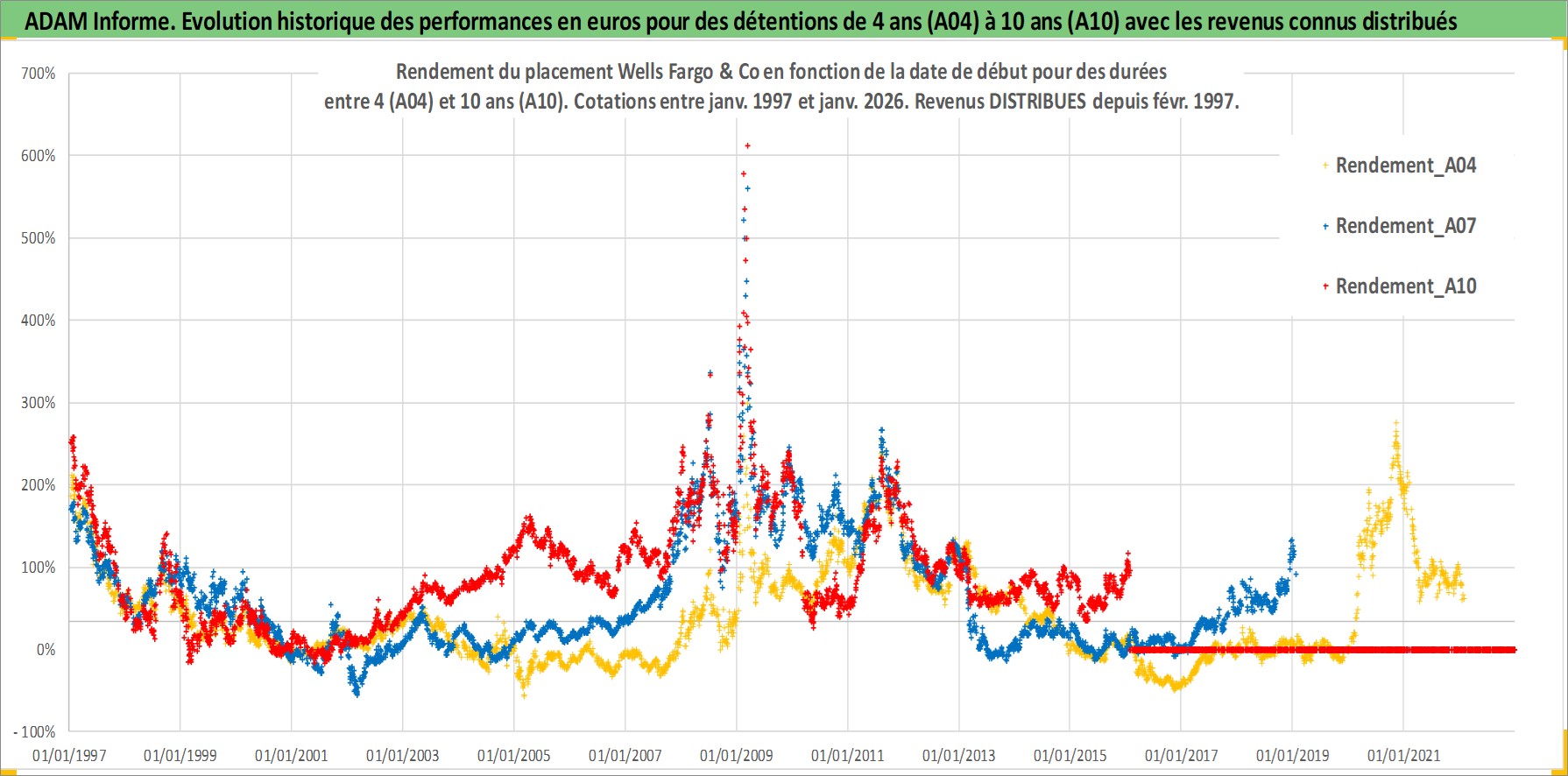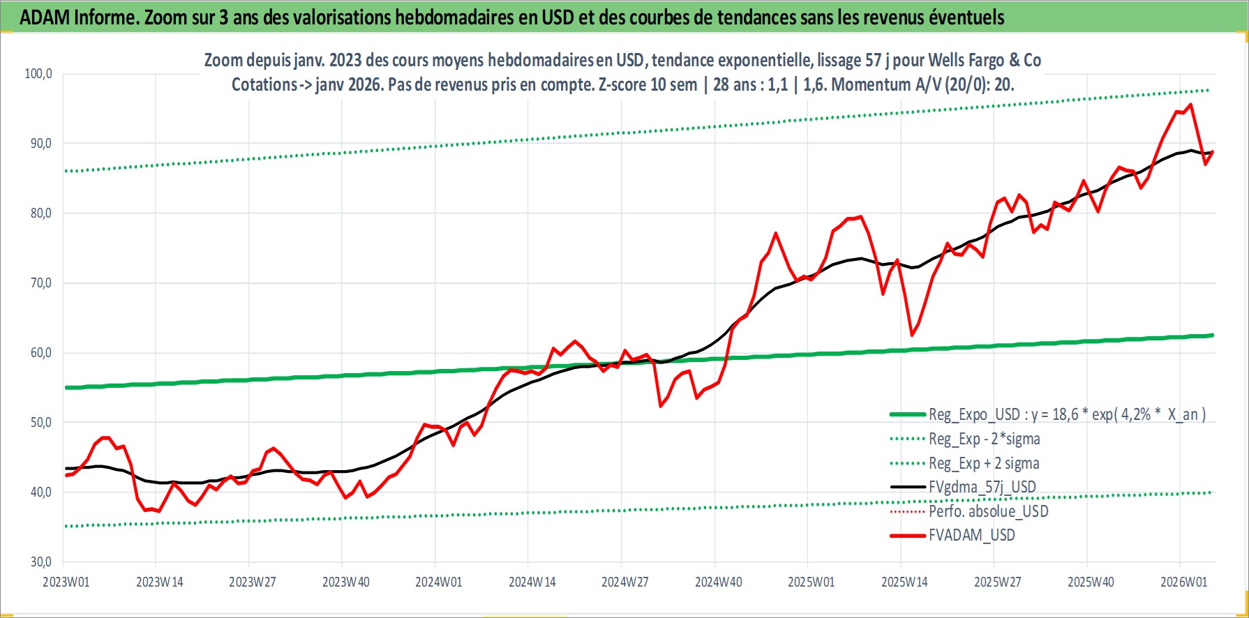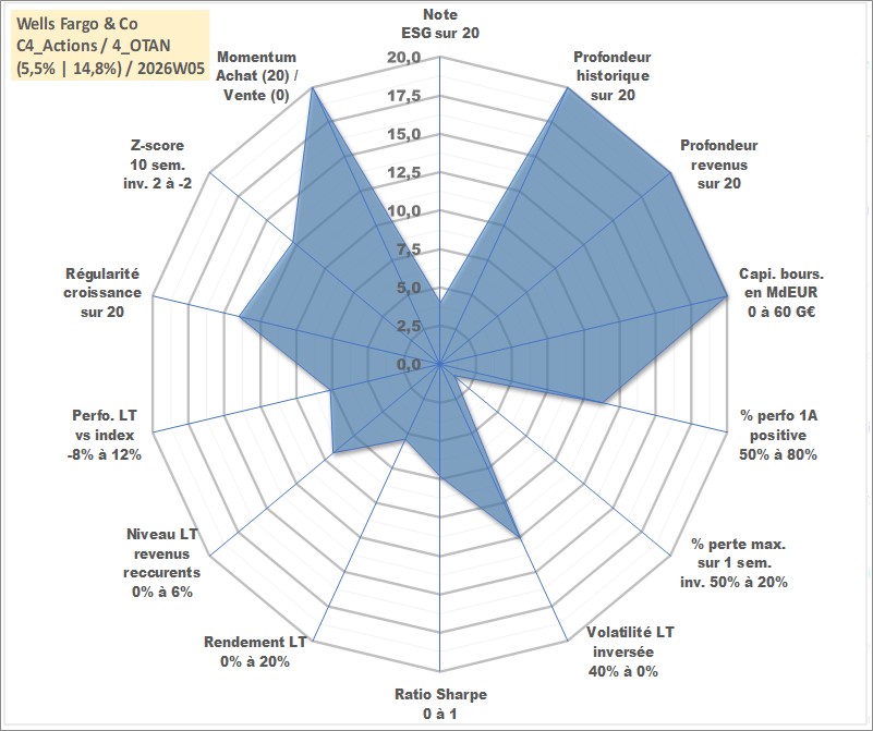 Site dédié aux investisseursPage dédiée sur site financeAnalyse des valorisations hebdomadaires de l'action Wells Fargo & Co. Cet actif est cote en USD. Les valorisations sont en contrevaleur EURO et couvrent les semaines 1997W01 a 2026W05. Les revenus de cet actif financier sont pris en compte depuis la semaine 1997W06. La note globale ESG de cet actif est estimee a 4.0 (apres rebasage entre 0 et 20).