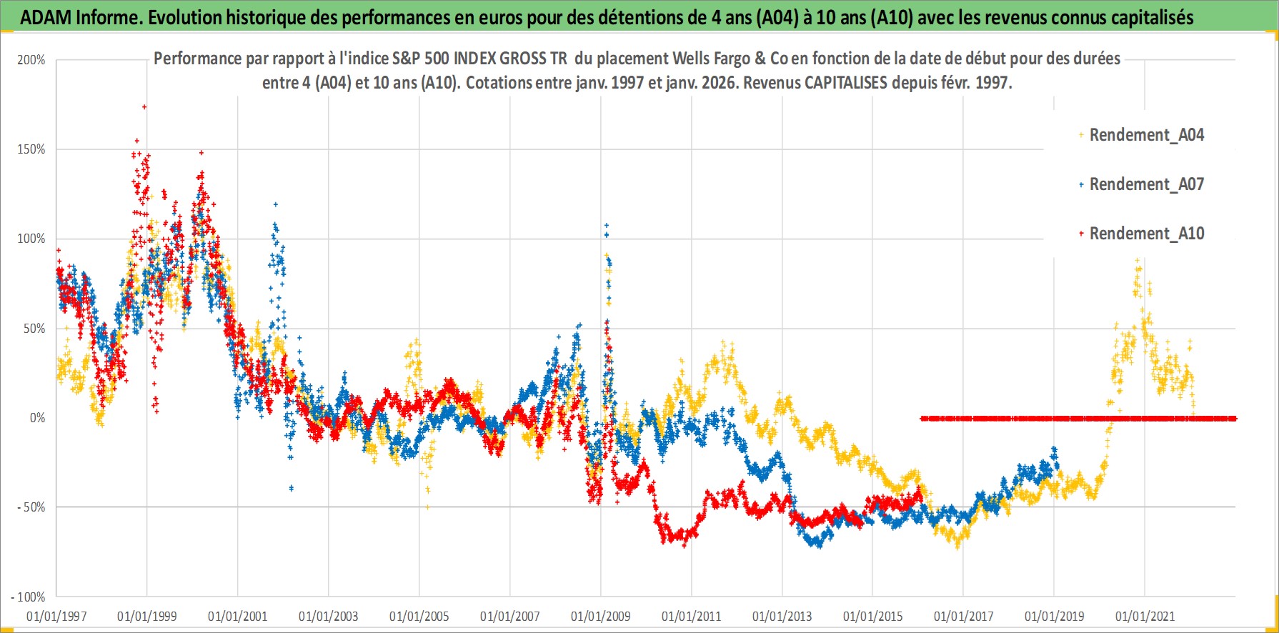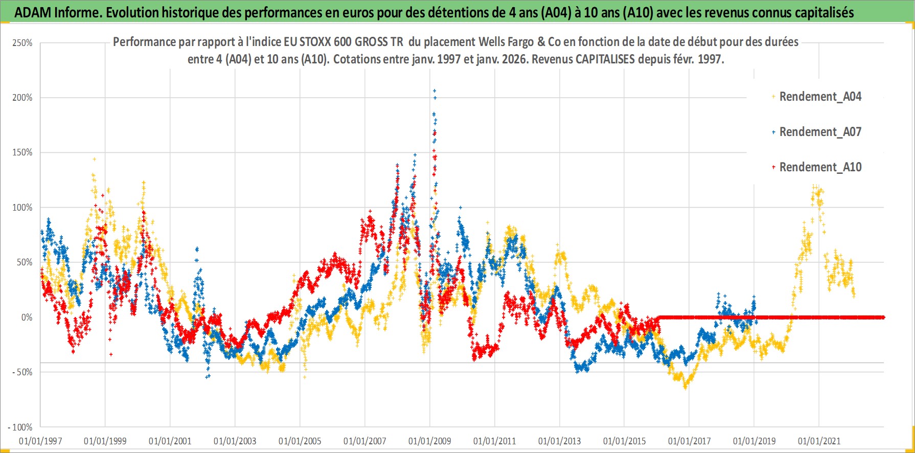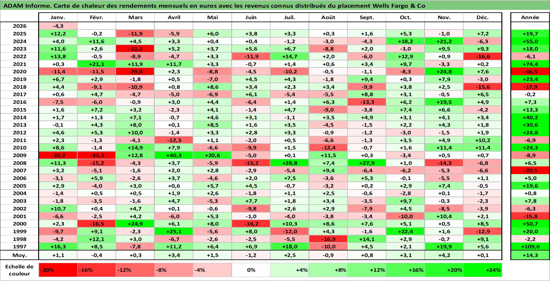 Site dédié aux investisseursPage dédiée sur site financeAnalyse des valorisations hebdomadaires de l'action Wells Fargo & Co. Cet actif est cote en USD. Les valorisations sont en contrevaleur EURO et couvrent les semaines 1997W01 a 2026W05. Les revenus de cet actif financier sont pris en compte depuis la semaine 1997W06. La note globale ESG de cet actif est estimee a 4.0 (apres rebasage entre 0 et 20).