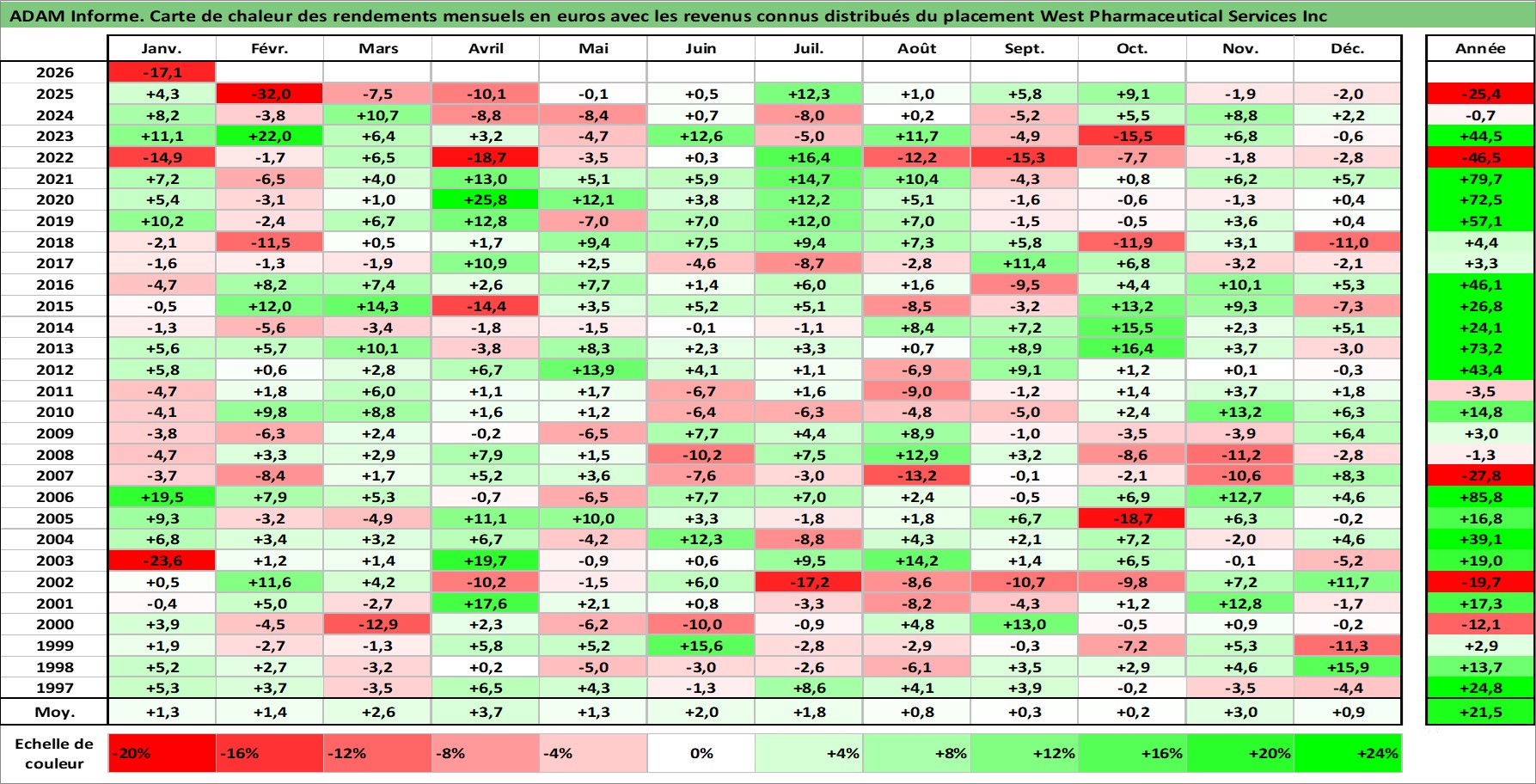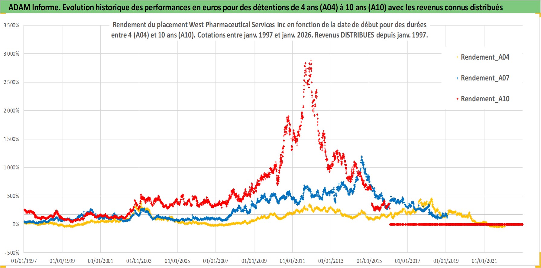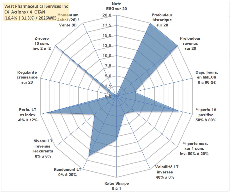 Site dédié aux investisseursPage dédiée sur site financeAnalyse des valorisations hebdomadaires de l'action West Pharmaceutical Services Inc. Cet actif est cote en USD. Les valorisations sont en contrevaleur EURO et couvrent les semaines 1997W01 a 2026W05. Les revenus de cet actif financier sont pris en compte depuis la semaine 1997W03. La note ESG de cet actif n'est pas connue.