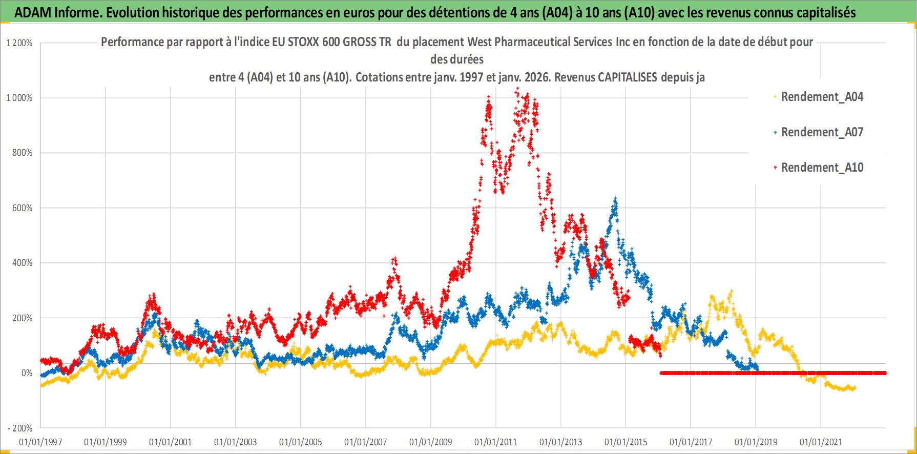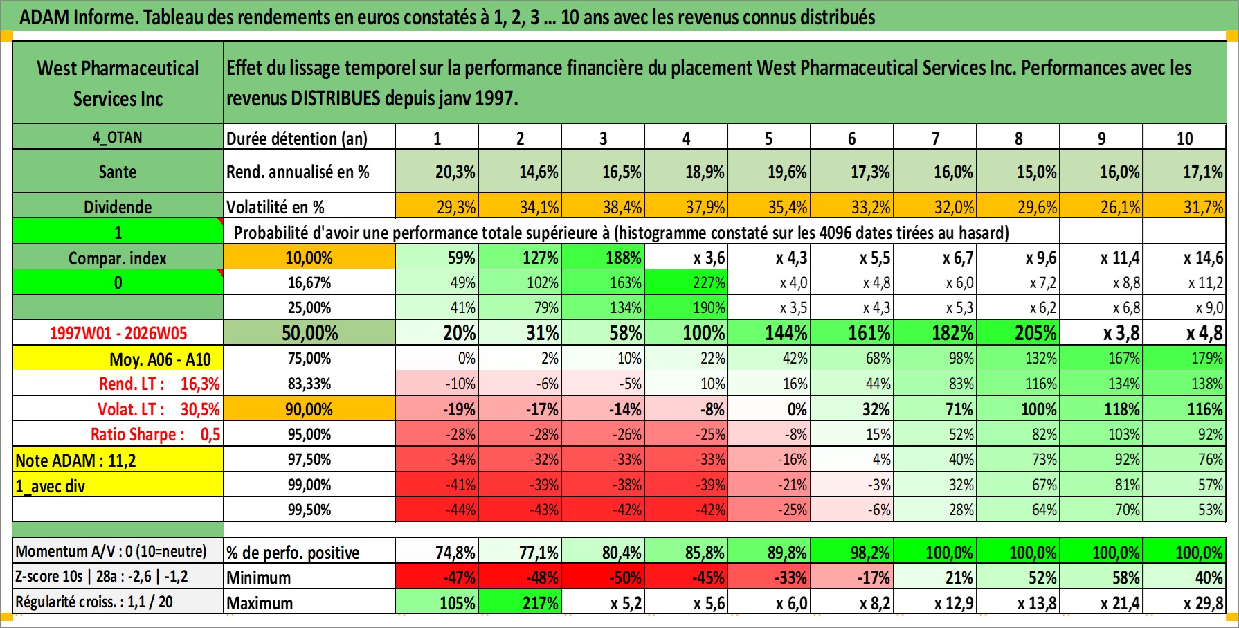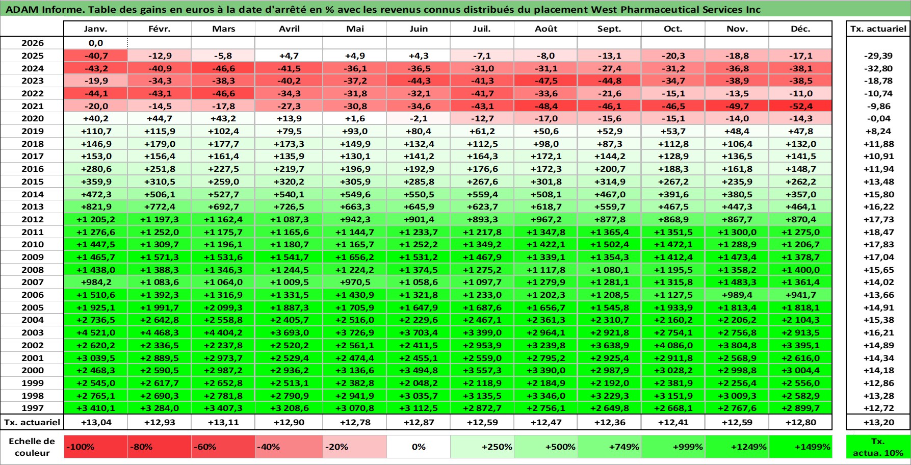 Site dédié aux investisseursPage dédiée sur site financeAnalyse des valorisations hebdomadaires de l'action West Pharmaceutical Services Inc. Cet actif est cote en USD. Les valorisations sont en contrevaleur EURO et couvrent les semaines 1997W01 a 2026W05. Les revenus de cet actif financier sont pris en compte depuis la semaine 1997W03. La note ESG de cet actif n'est pas connue.