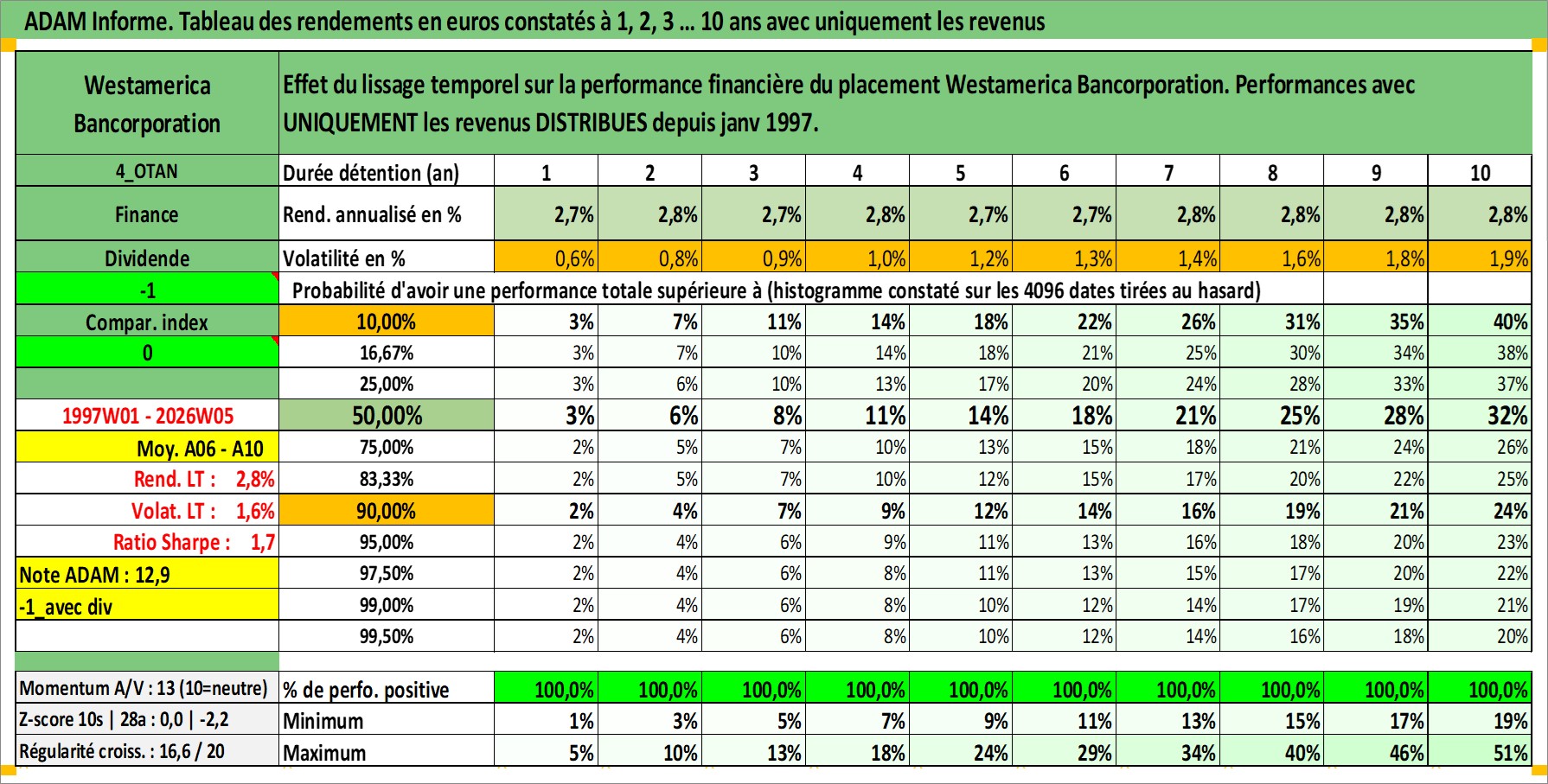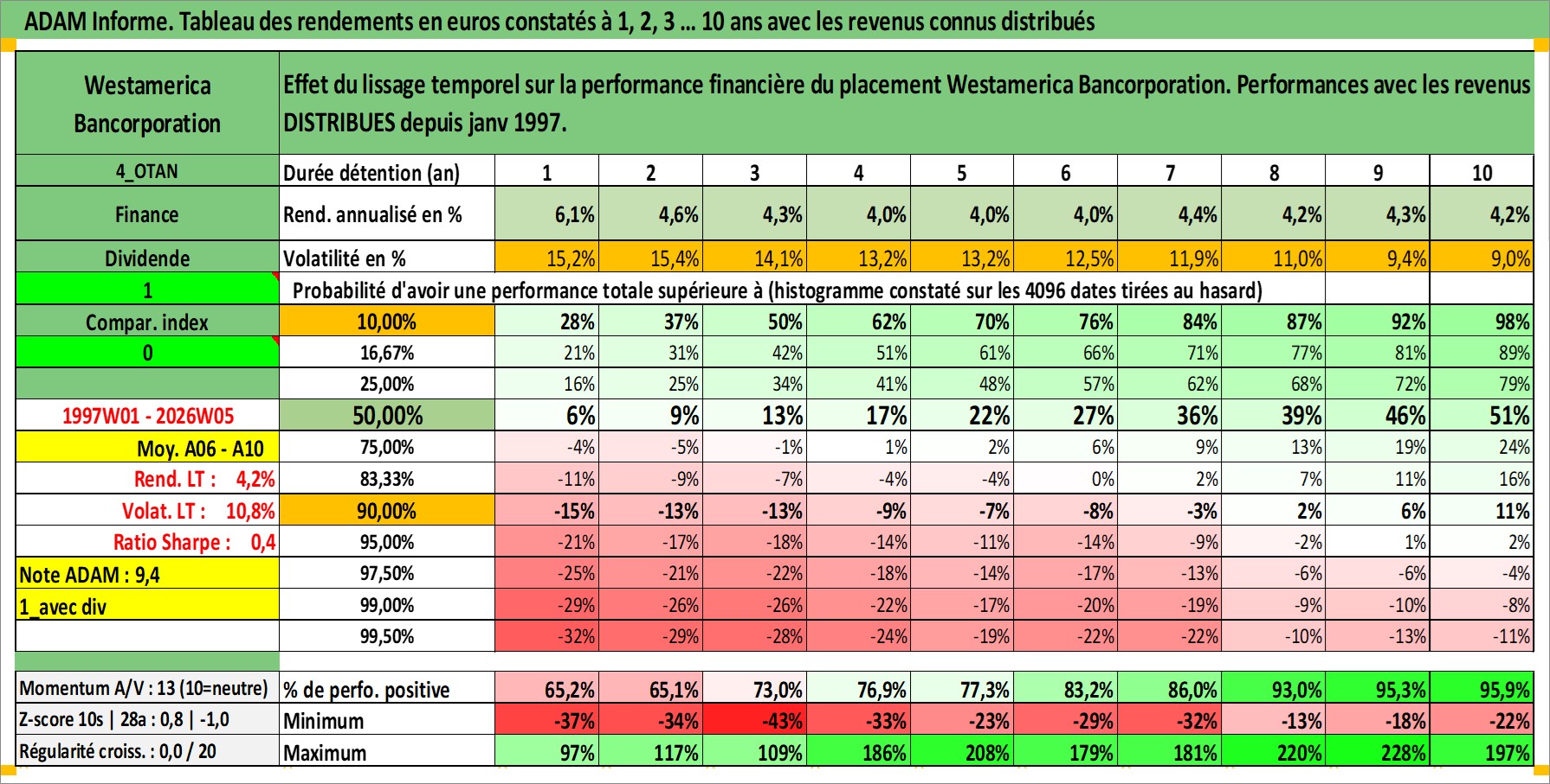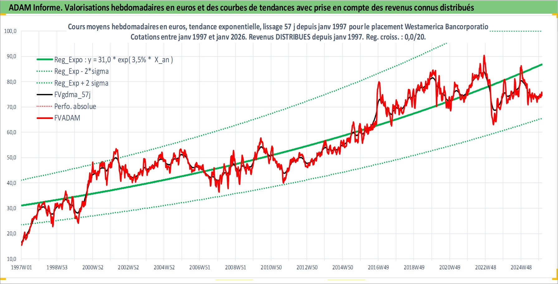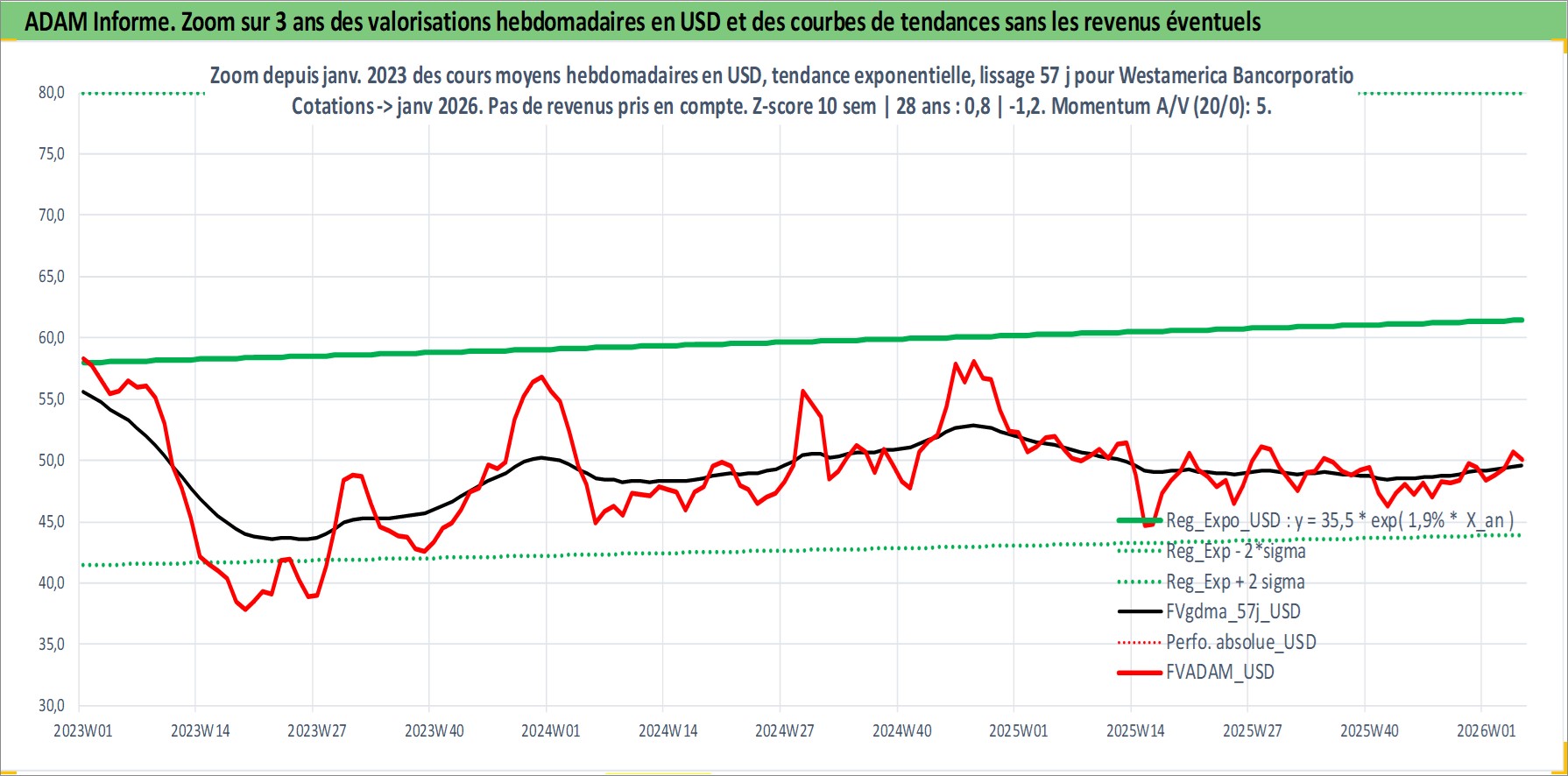 Site dédié aux investisseursPage dédiée sur site financeAnalyse des valorisations hebdomadaires de l'action Westamerica Bancorporation. Cet actif est cote en USD. Les valorisations sont en contrevaleur EURO et couvrent les semaines 1997W01 a 2026W05. Les revenus de cet actif financier sont pris en compte depuis la semaine 1997W03. La note ESG de cet actif n'est pas connue.