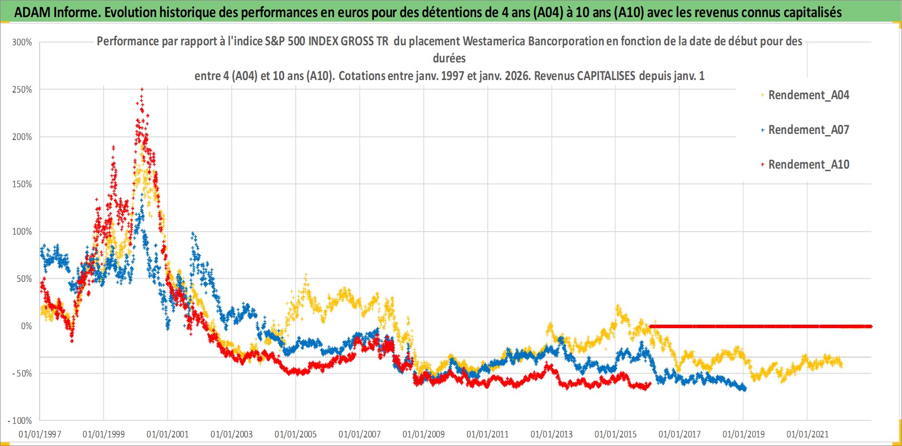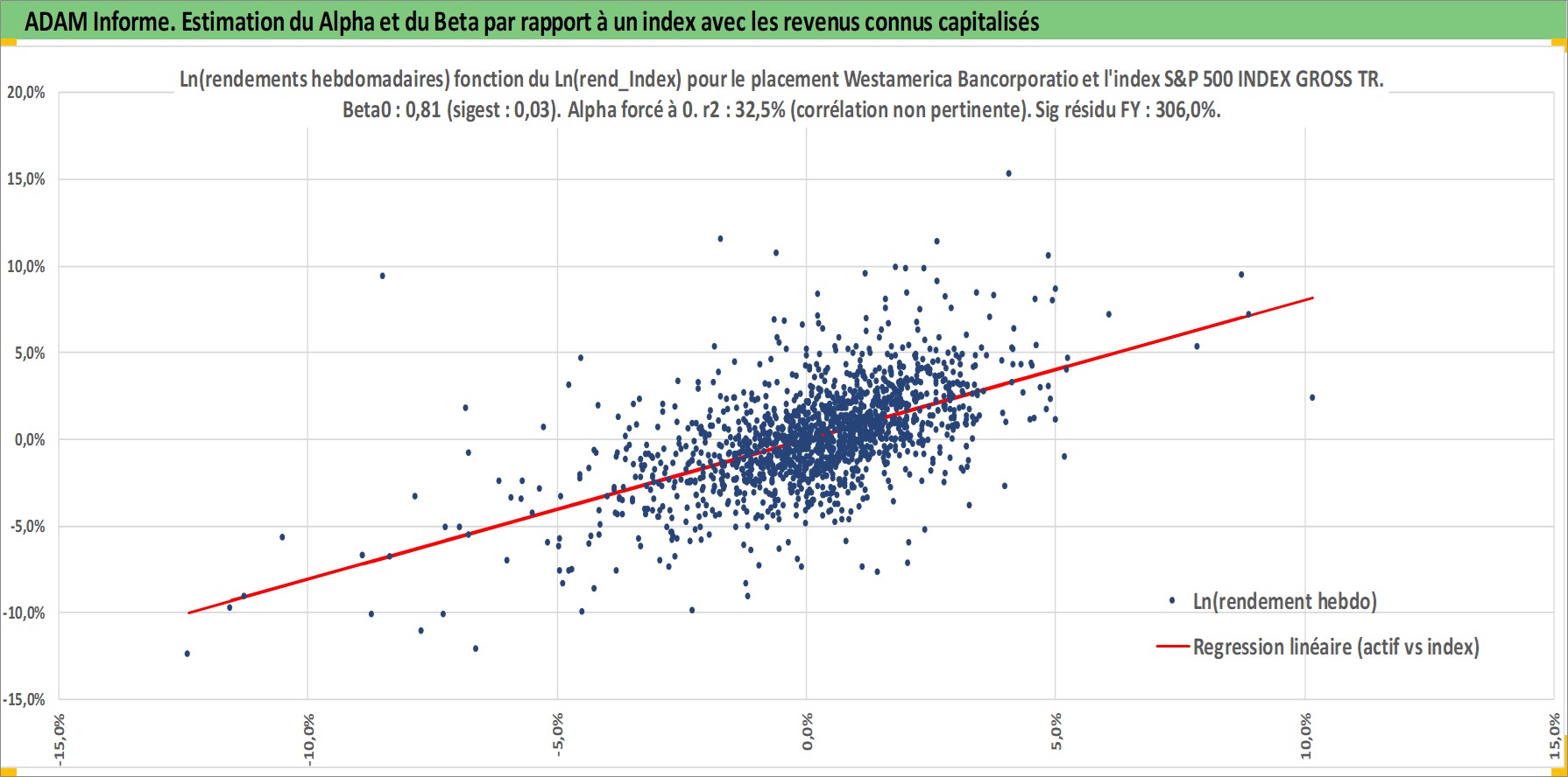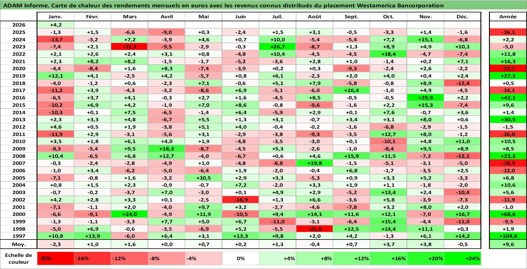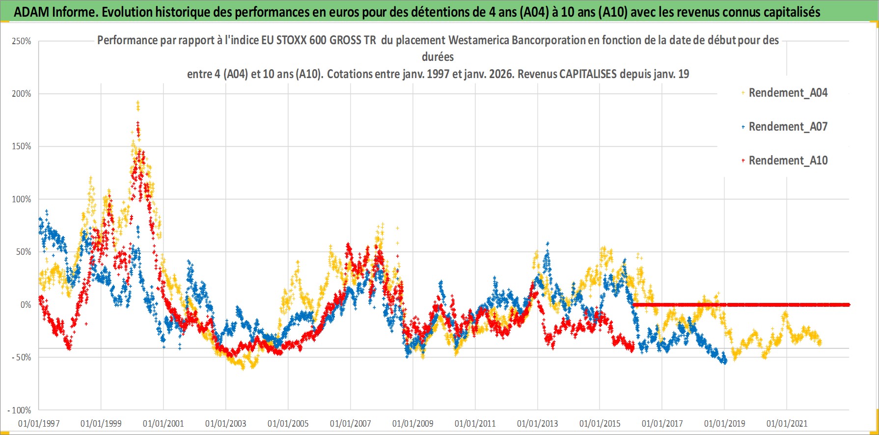 Site dédié aux investisseursPage dédiée sur site financeAnalyse des valorisations hebdomadaires de l'action Westamerica Bancorporation. Cet actif est cote en USD. Les valorisations sont en contrevaleur EURO et couvrent les semaines 1997W01 a 2026W05. Les revenus de cet actif financier sont pris en compte depuis la semaine 1997W03. La note ESG de cet actif n'est pas connue.