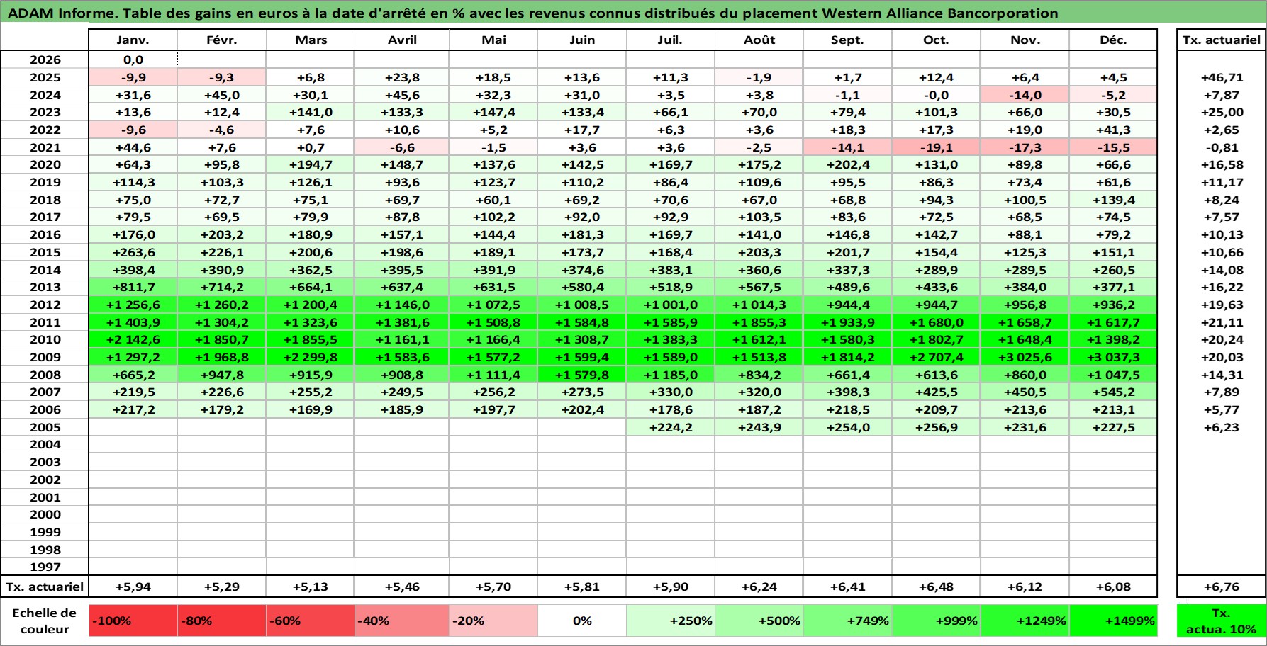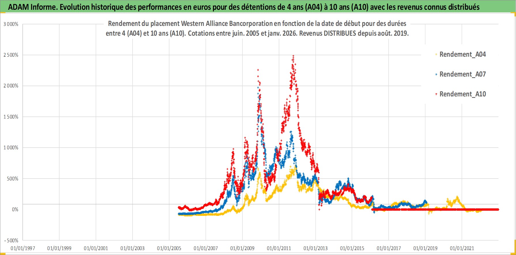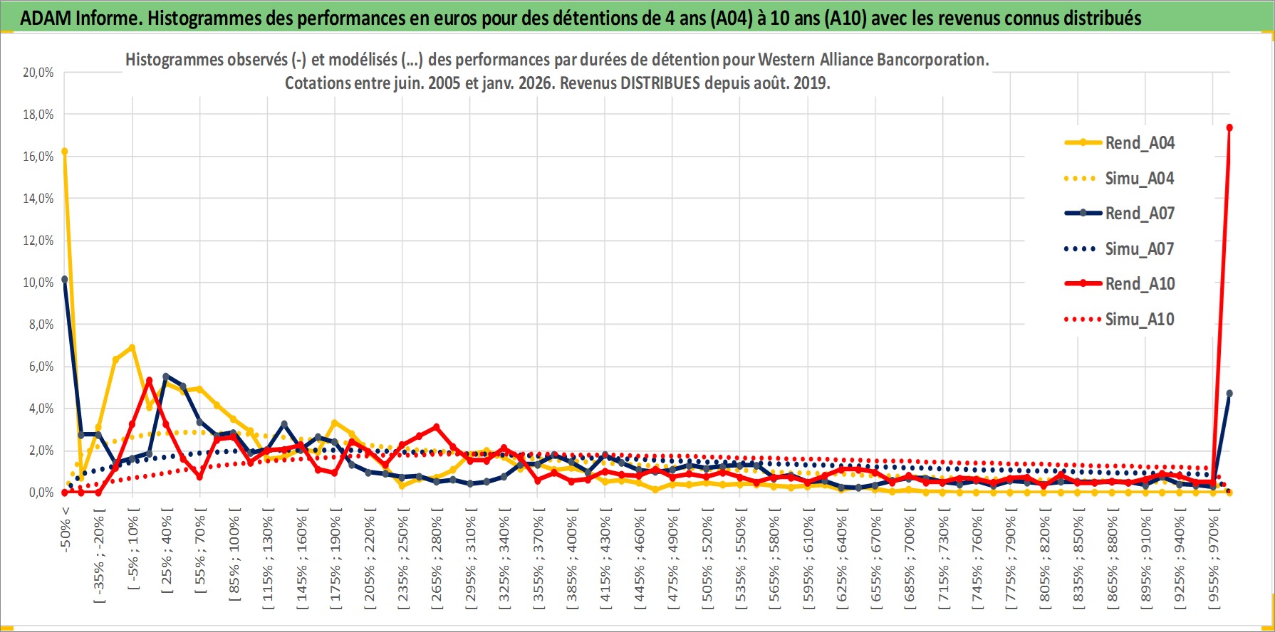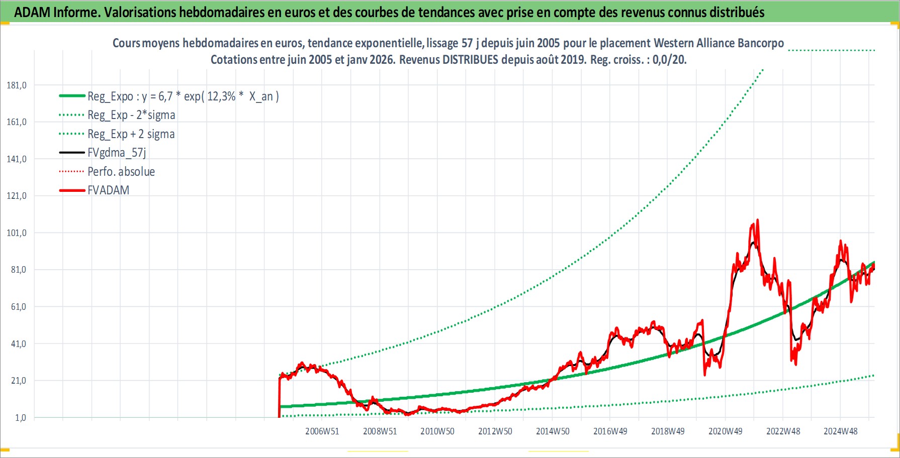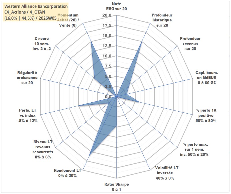 Site dédié aux investisseursPage dédiée sur site financeAnalyse des valorisations hebdomadaires de l'action Western Alliance Bancorporation. Cet actif est cote en USD. Les valorisations sont en contrevaleur EURO et couvrent les semaines 2005W26 a 2026W05. Les revenus de cet actif financier sont pris en compte depuis la semaine 2019W33. La note ESG de cet actif n'est pas connue.