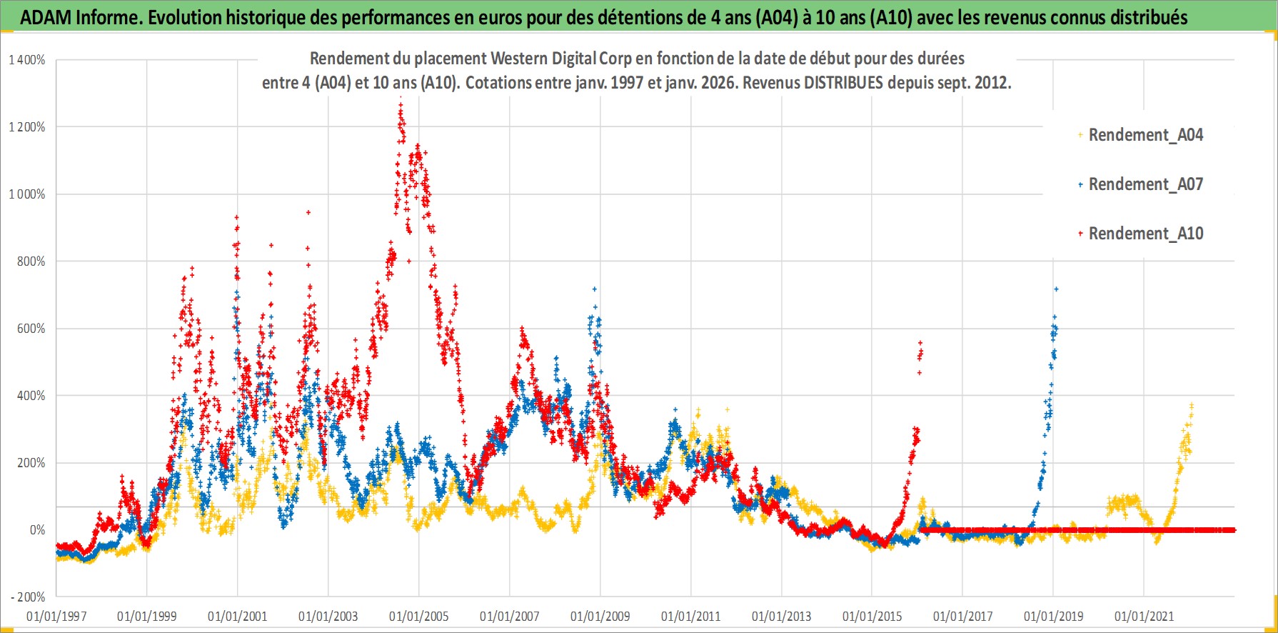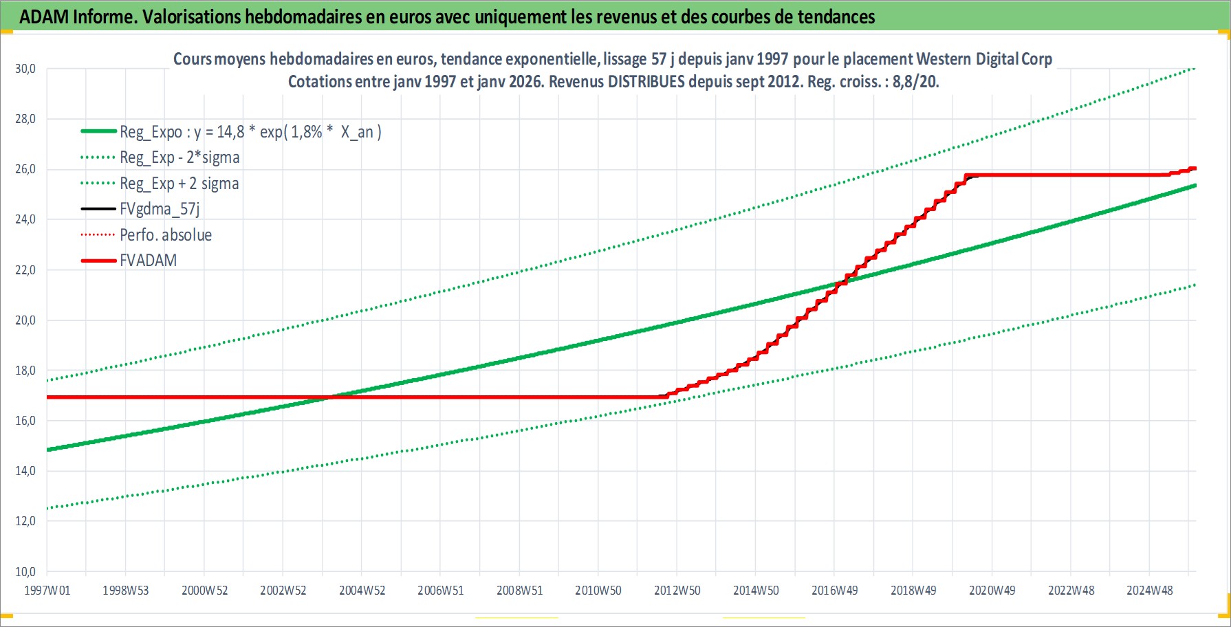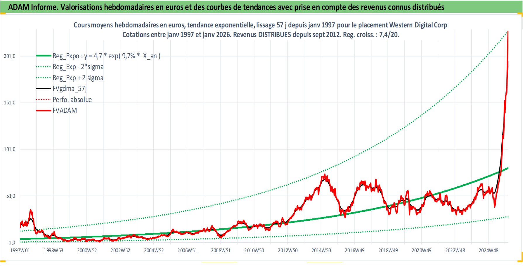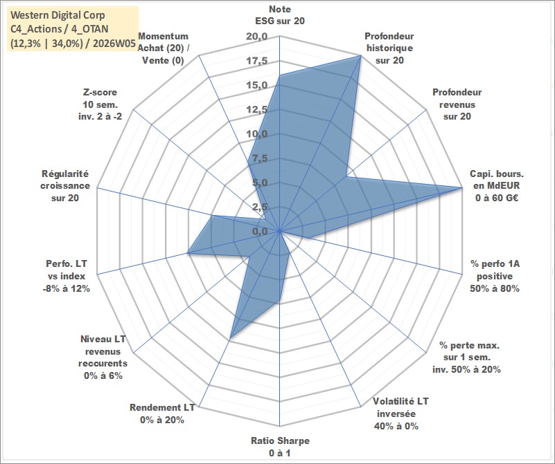 Site dédié aux investisseursPage dédiée sur site financeAnalyse des valorisations hebdomadaires de l'action Western Digital Corp. Cet actif est cote en USD. Les valorisations sont en contrevaleur EURO et couvrent les semaines 1997W01 a 2026W05. Les revenus de cet actif financier sont pris en compte depuis la semaine 2012W39. La note globale ESG de cet actif est estimee a 16.0 (apres rebasage entre 0 et 20).
