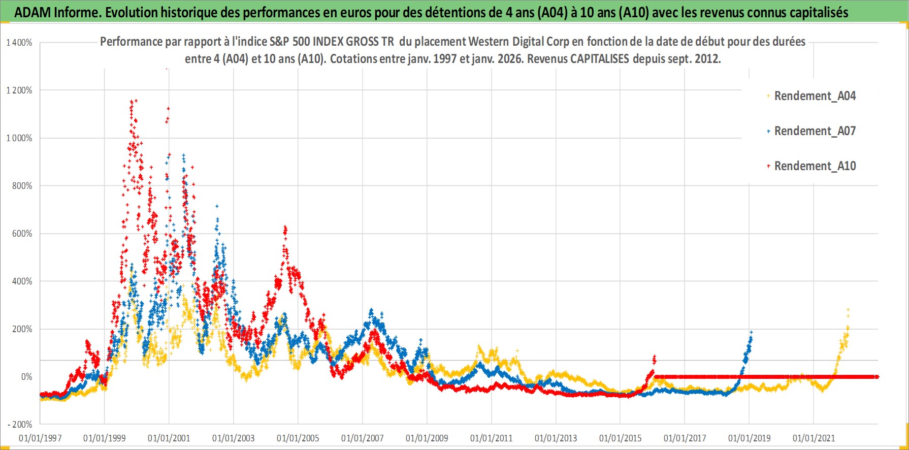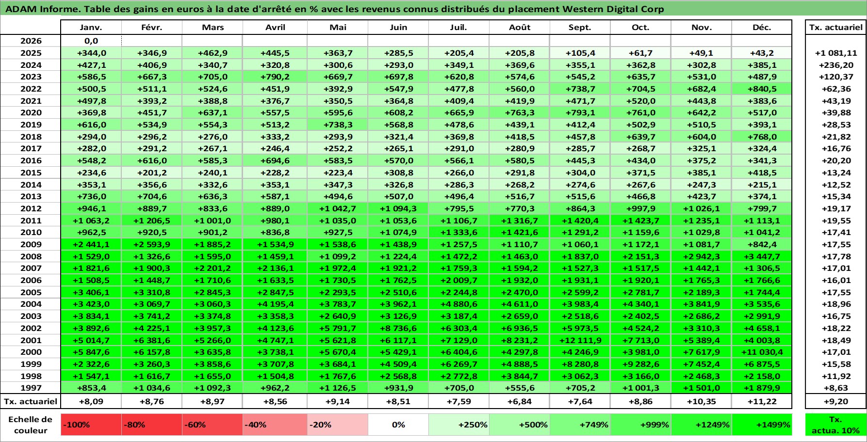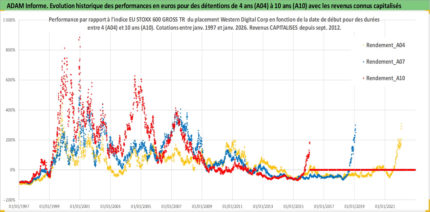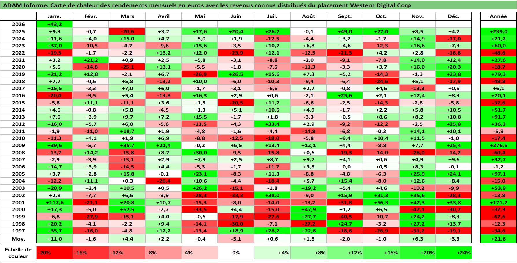 Site dédié aux investisseursPage dédiée sur site financeAnalyse des valorisations hebdomadaires de l'action Western Digital Corp. Cet actif est cote en USD. Les valorisations sont en contrevaleur EURO et couvrent les semaines 1997W01 a 2026W05. Les revenus de cet actif financier sont pris en compte depuis la semaine 2012W39. La note globale ESG de cet actif est estimee a 16.0 (apres rebasage entre 0 et 20).