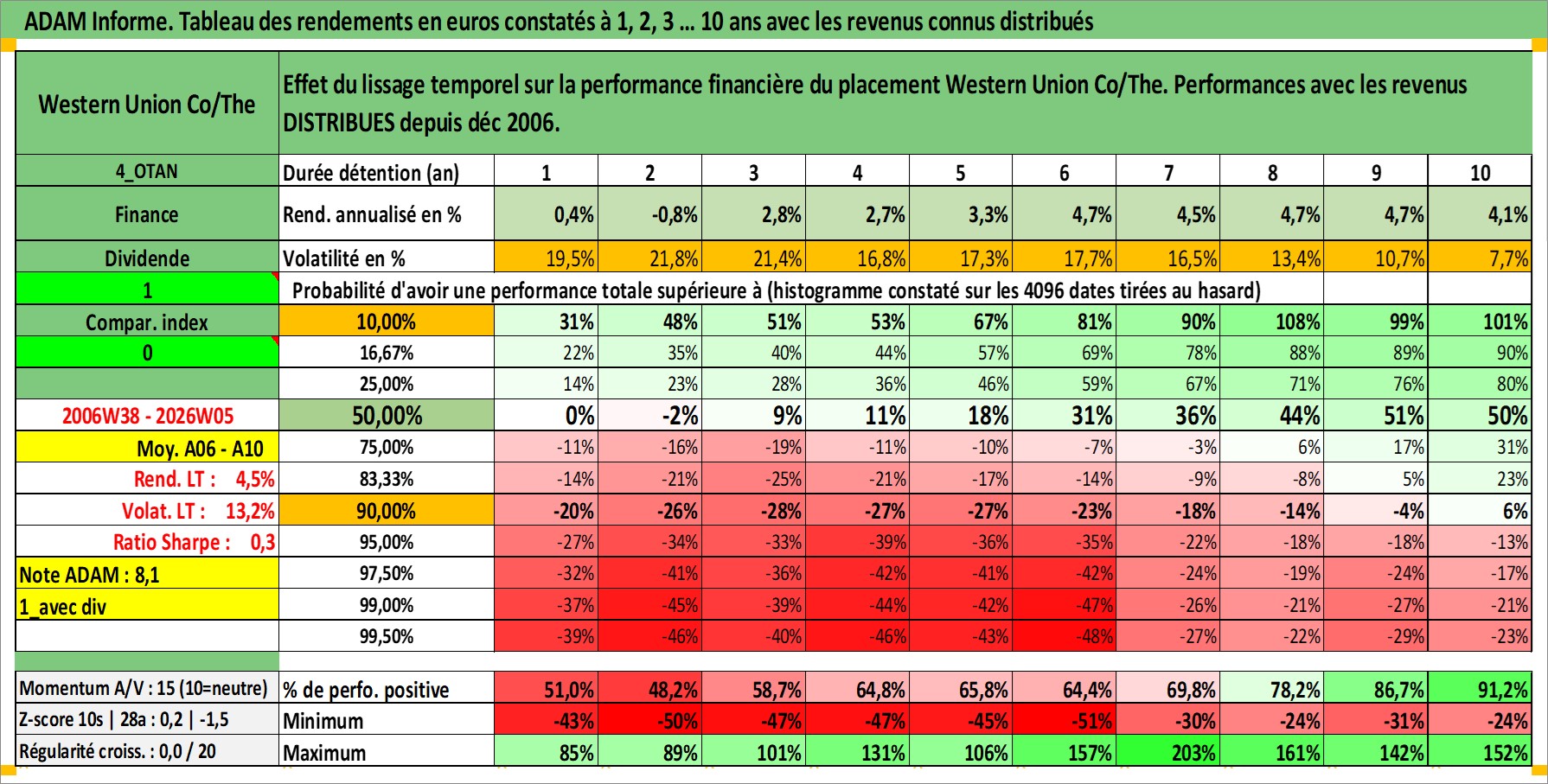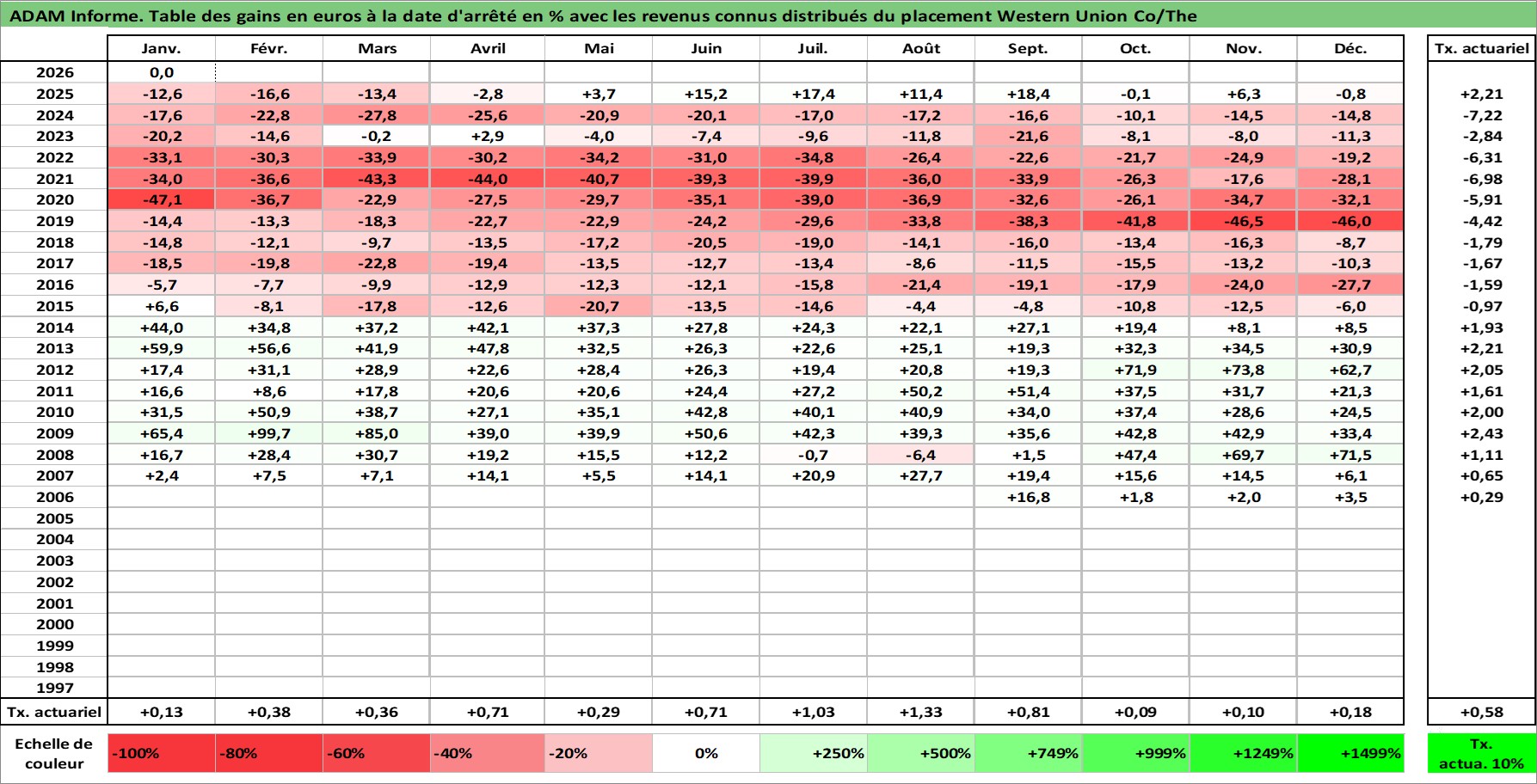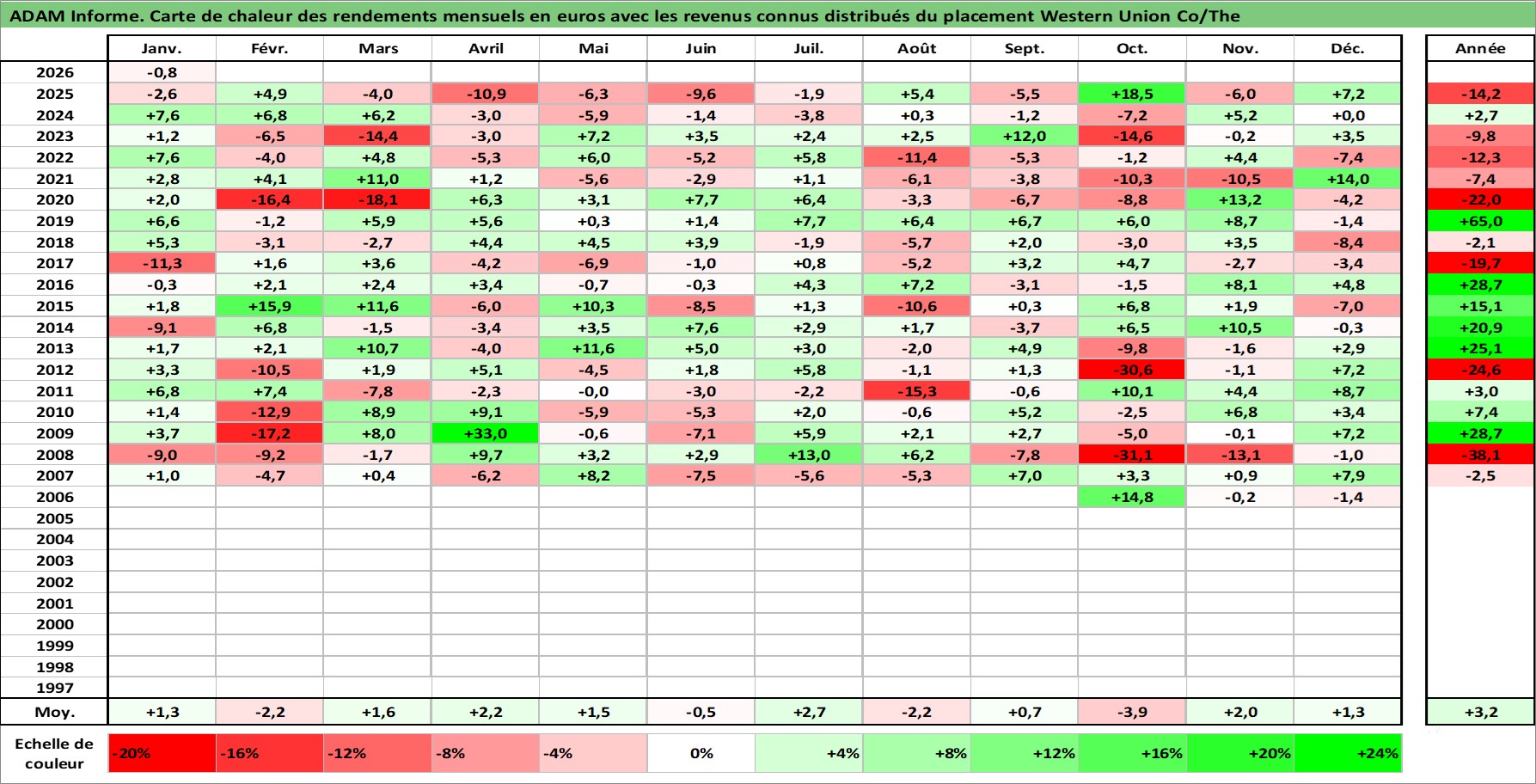 Site dédié aux investisseursPage dédiée sur site financeAnalyse des valorisations hebdomadaires de l'action Western Union Co/The. Cet actif est cote en USD. Les valorisations sont en contrevaleur EURO et couvrent les semaines 2006W38 a 2026W05. Les revenus de cet actif financier sont pris en compte depuis la semaine 2006W50. La note globale ESG de cet actif est estimee a 15.0 (apres rebasage entre 0 et 20).