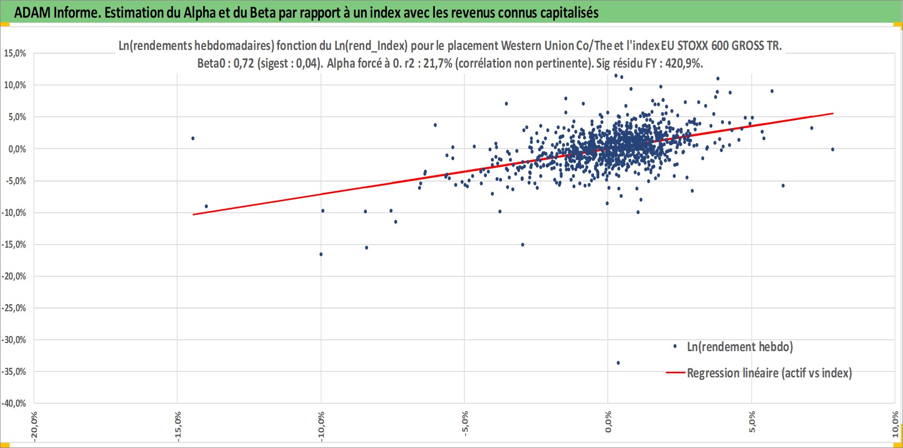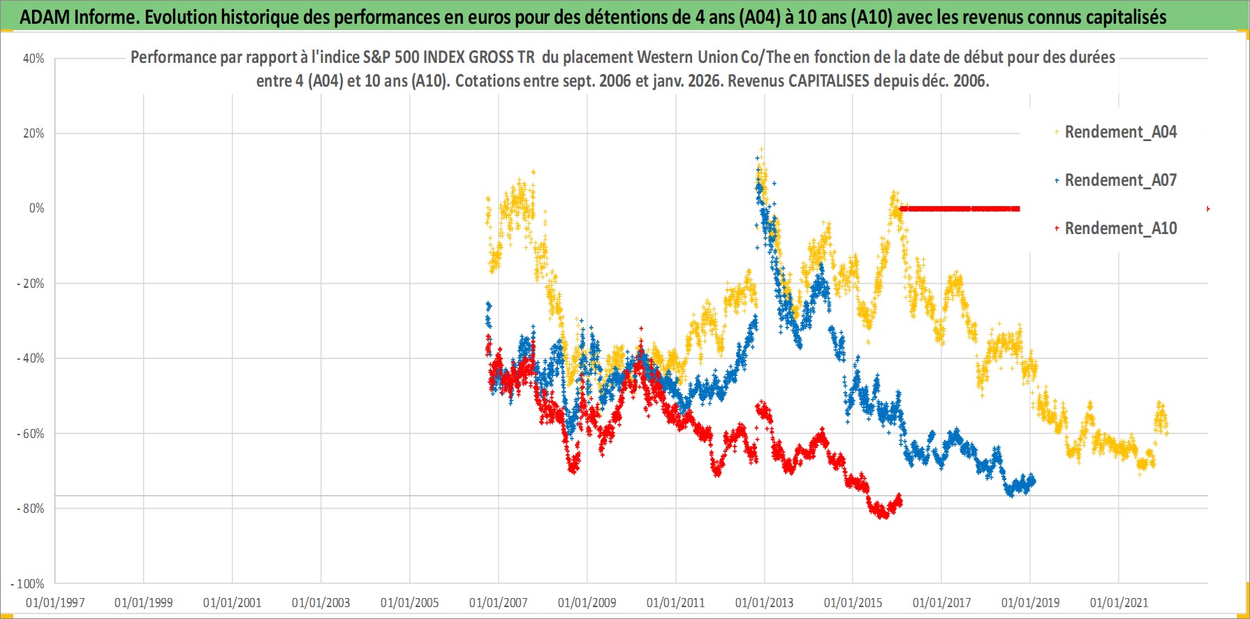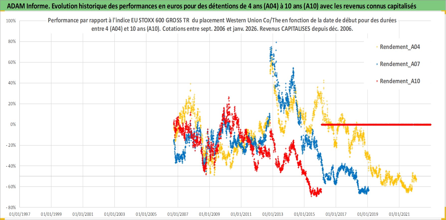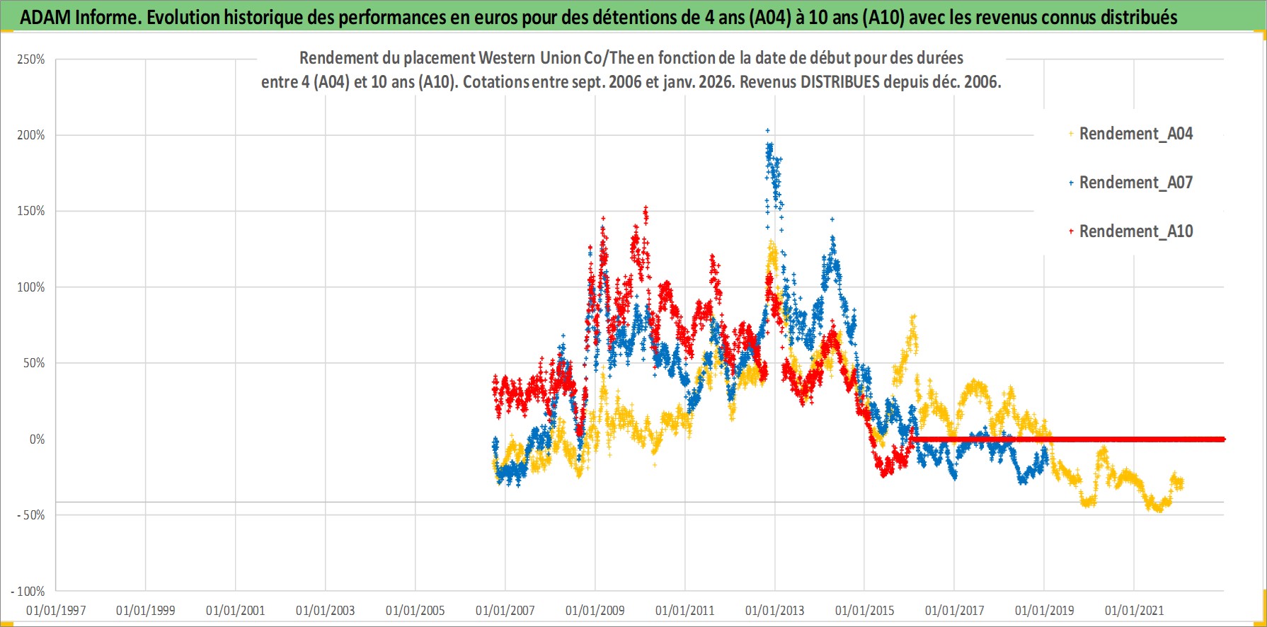 Site dédié aux investisseursPage dédiée sur site financeAnalyse des valorisations hebdomadaires de l'action Western Union Co/The. Cet actif est cote en USD. Les valorisations sont en contrevaleur EURO et couvrent les semaines 2006W38 a 2026W05. Les revenus de cet actif financier sont pris en compte depuis la semaine 2006W50. La note globale ESG de cet actif est estimee a 15.0 (apres rebasage entre 0 et 20).