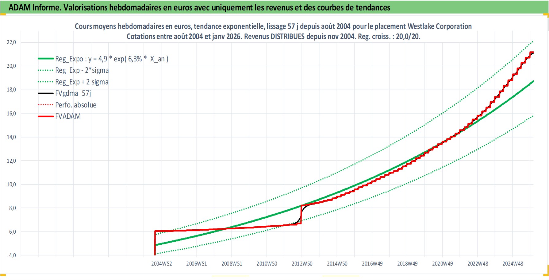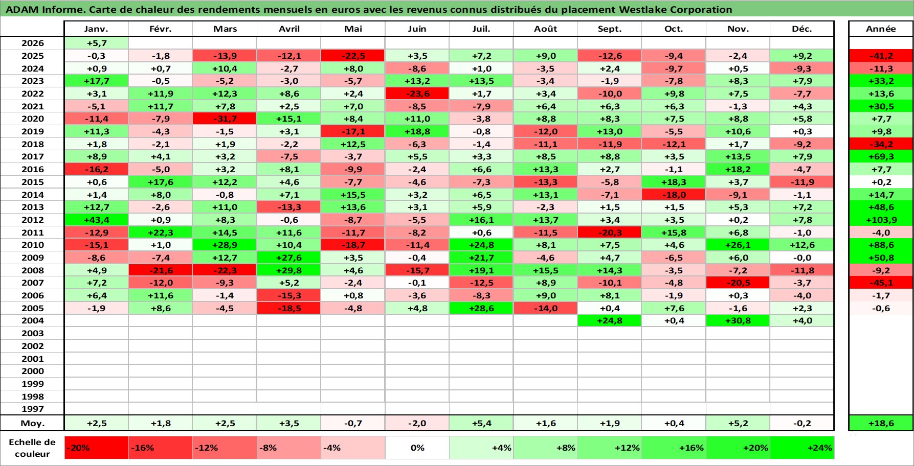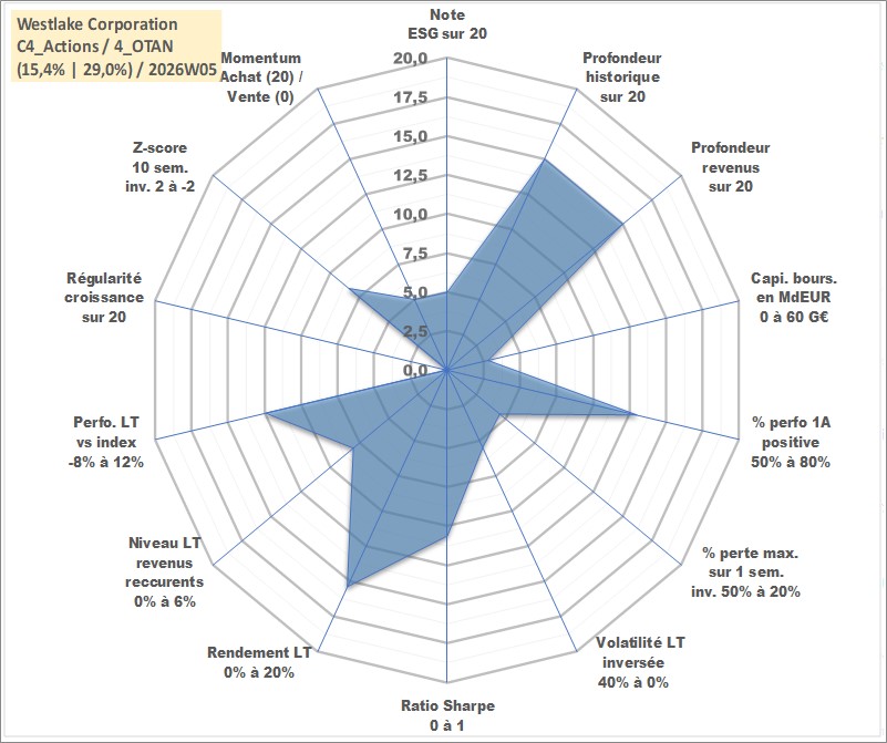 Site dédié aux investisseursPage dédiée sur site financeAnalyse des valorisations hebdomadaires de l'action Westlake Corporation. Cet actif est cote en USD. Les valorisations sont en contrevaleur EURO et couvrent les semaines 2004W33 a 2026W05. Les revenus de cet actif financier sont pris en compte depuis la semaine 2004W47. La note globale ESG de cet actif est estimee a 5.0 (apres rebasage entre 0 et 20).
