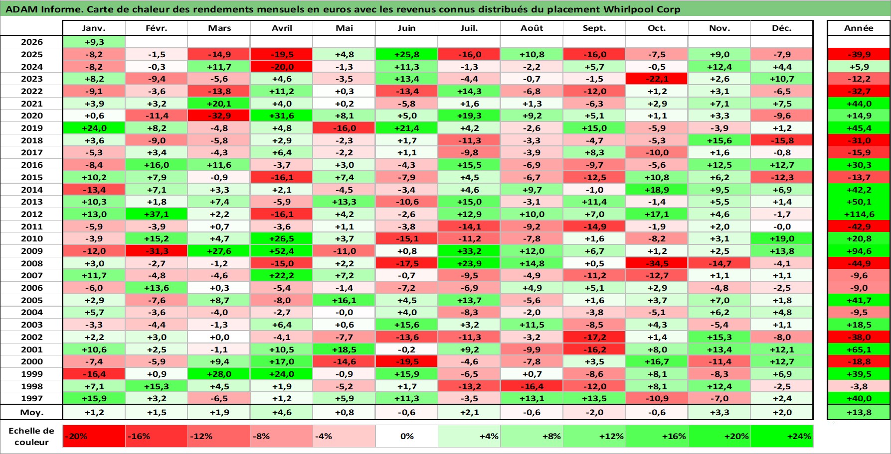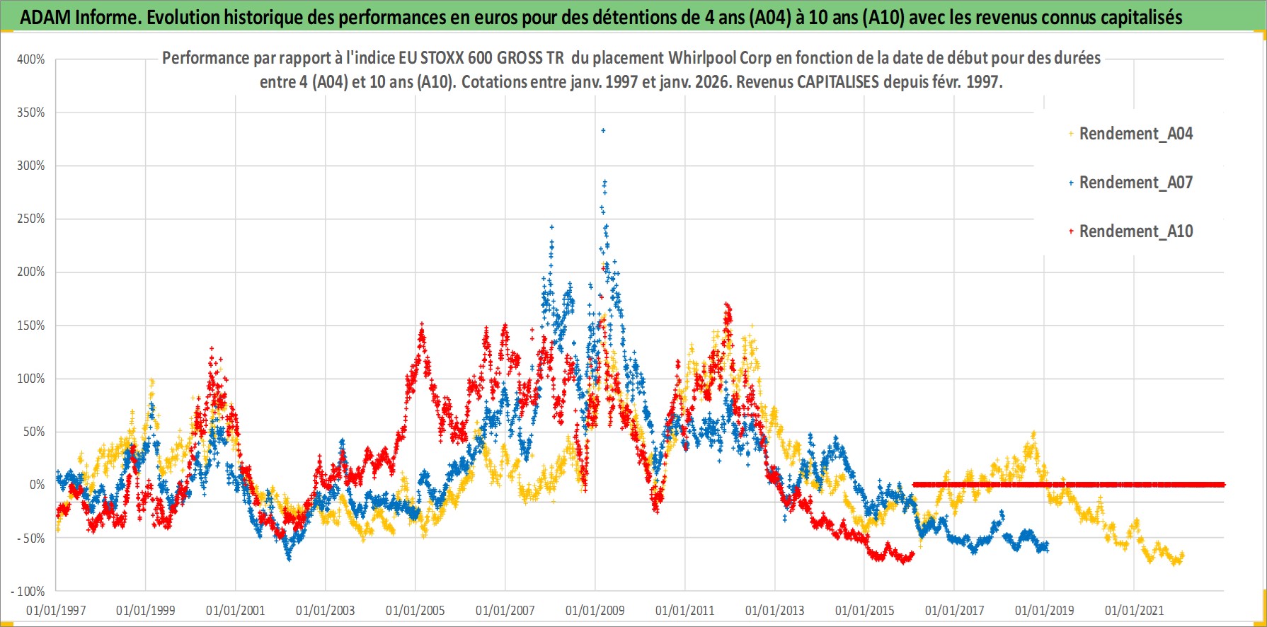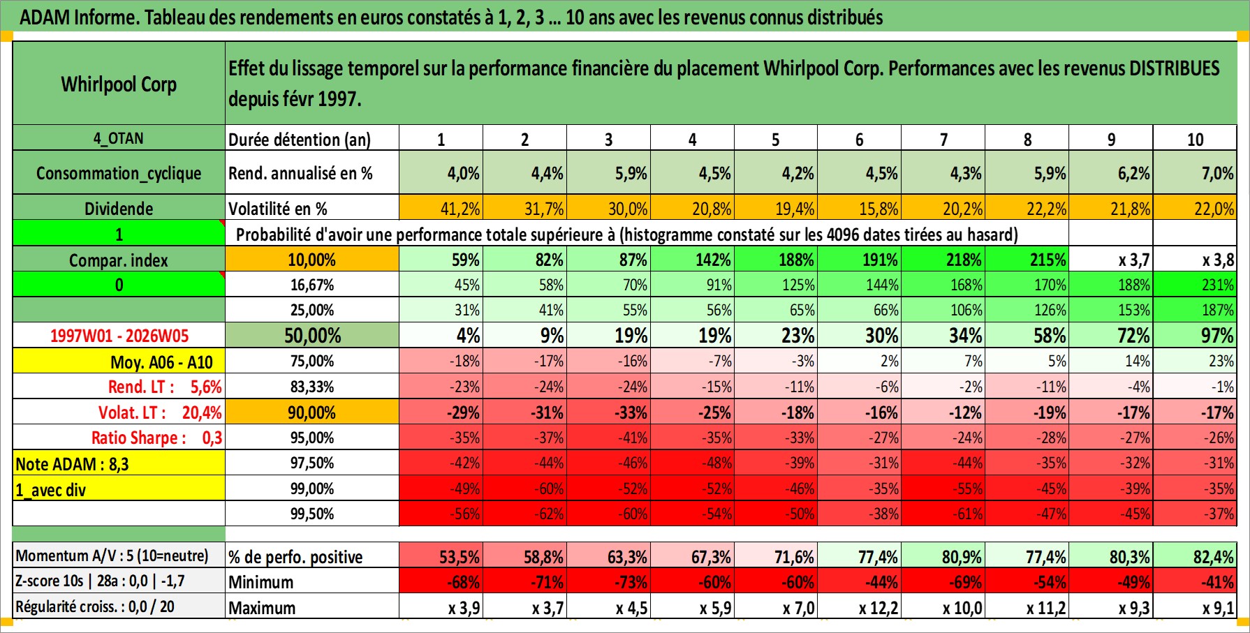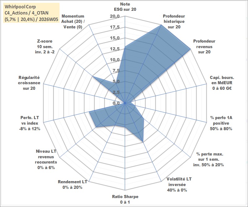 Site dédié aux investisseursPage dédiée sur site financeAnalyse des valorisations hebdomadaires de l'action Whirlpool Corp. Cet actif est cote en USD. Les valorisations sont en contrevaleur EURO et couvrent les semaines 1997W01 a 2026W05. Les revenus de cet actif financier sont pris en compte depuis la semaine 1997W09. La note globale ESG de cet actif est estimee a 13.0 (apres rebasage entre 0 et 20).