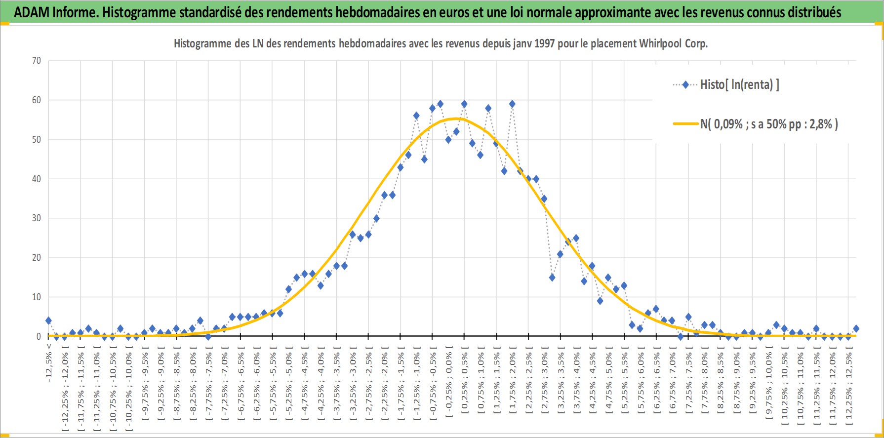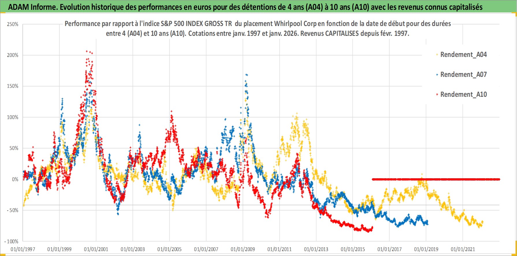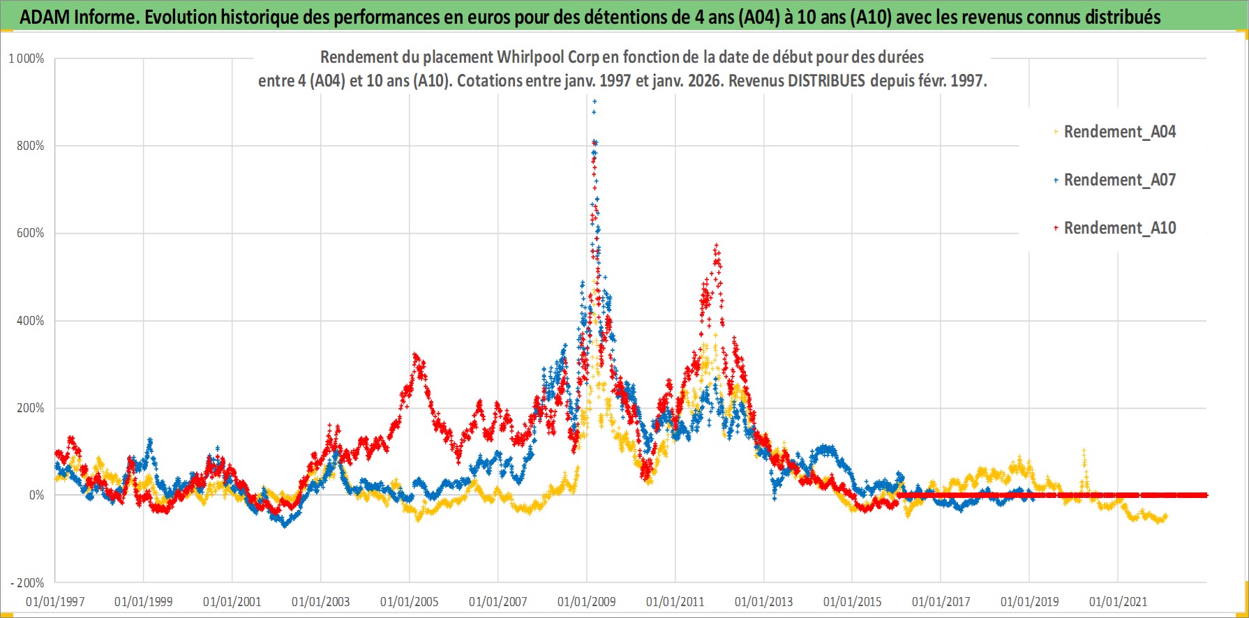 Site dédié aux investisseursPage dédiée sur site financeAnalyse des valorisations hebdomadaires de l'action Whirlpool Corp. Cet actif est cote en USD. Les valorisations sont en contrevaleur EURO et couvrent les semaines 1997W01 a 2026W05. Les revenus de cet actif financier sont pris en compte depuis la semaine 1997W09. La note globale ESG de cet actif est estimee a 13.0 (apres rebasage entre 0 et 20).